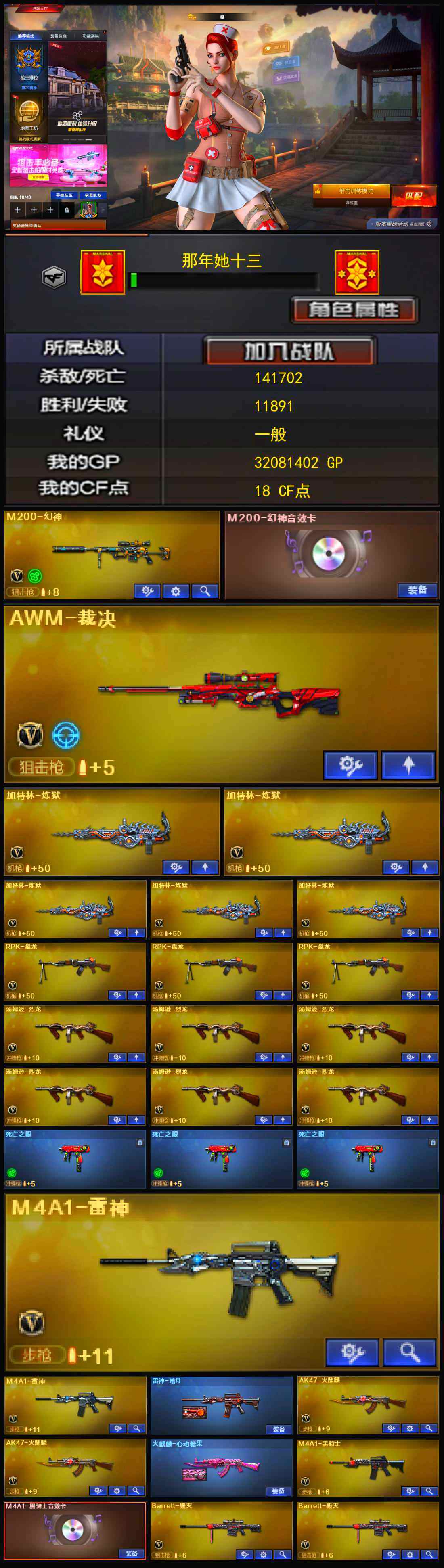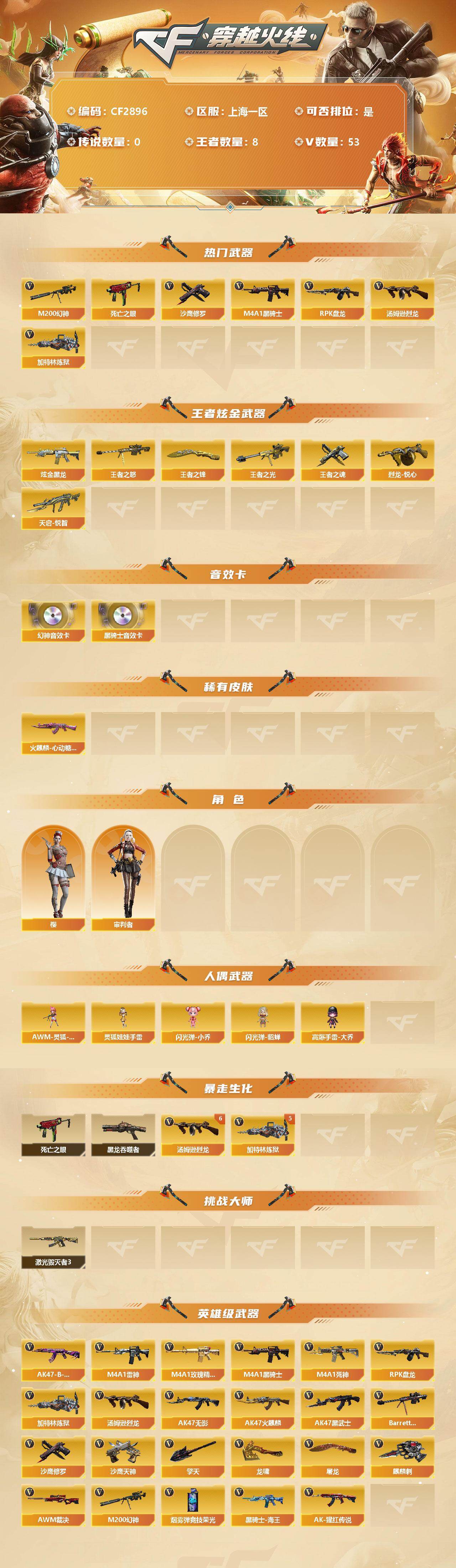 【CF2896】【商品标题】:上海一区-53V-8王者-1炫金大师2】【6烈龙】【死亡之眼】【M200-幻神】【M200-幻神音效卡】【AWM-裁决】【加特林-炼狱】【RPK-盘龙】【汤姆逊-烈龙】【死亡之眼】【审判者】【樱】【M4A1-雷神】【雷神-暗月】【AK47-火麒麟】【火麒麟-心动糖果】【M4A1-黑骑士】【M4A1-黑骑士音效卡】【Barrett-毁灭】