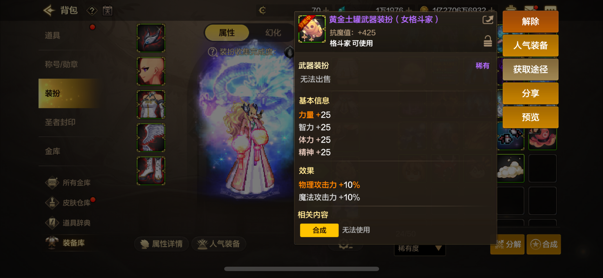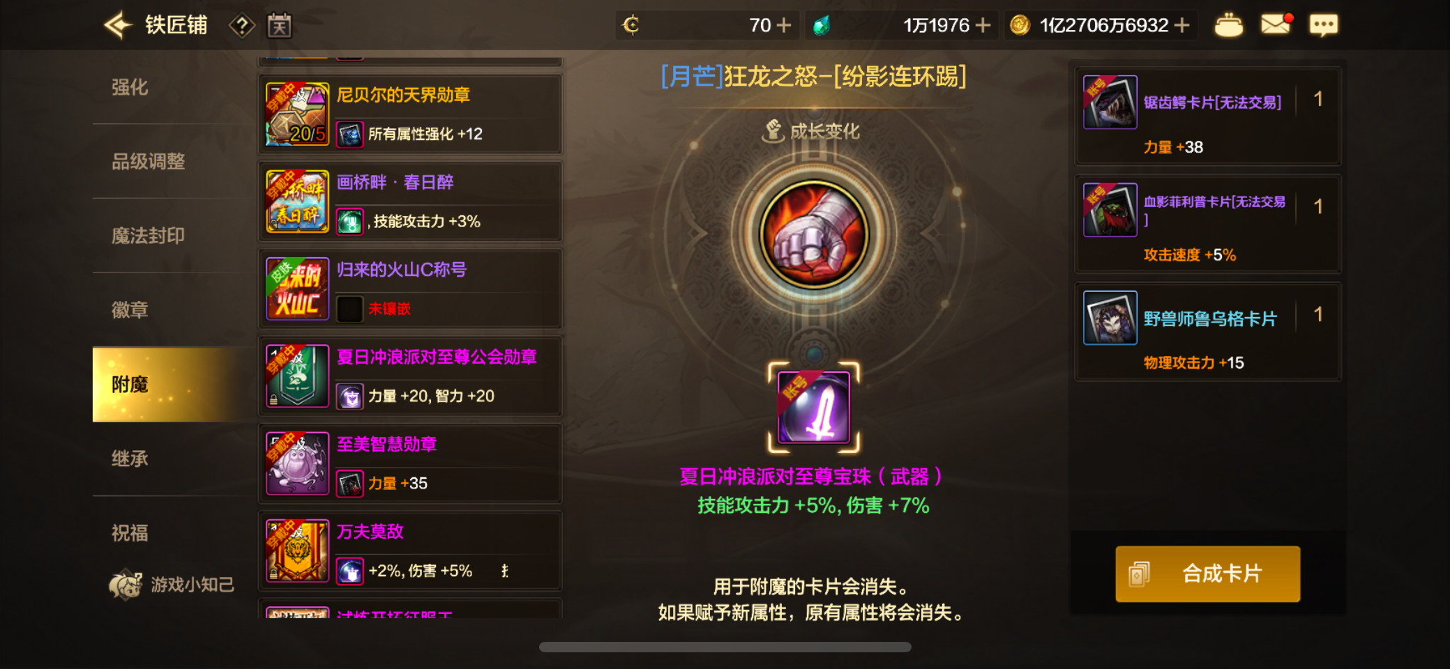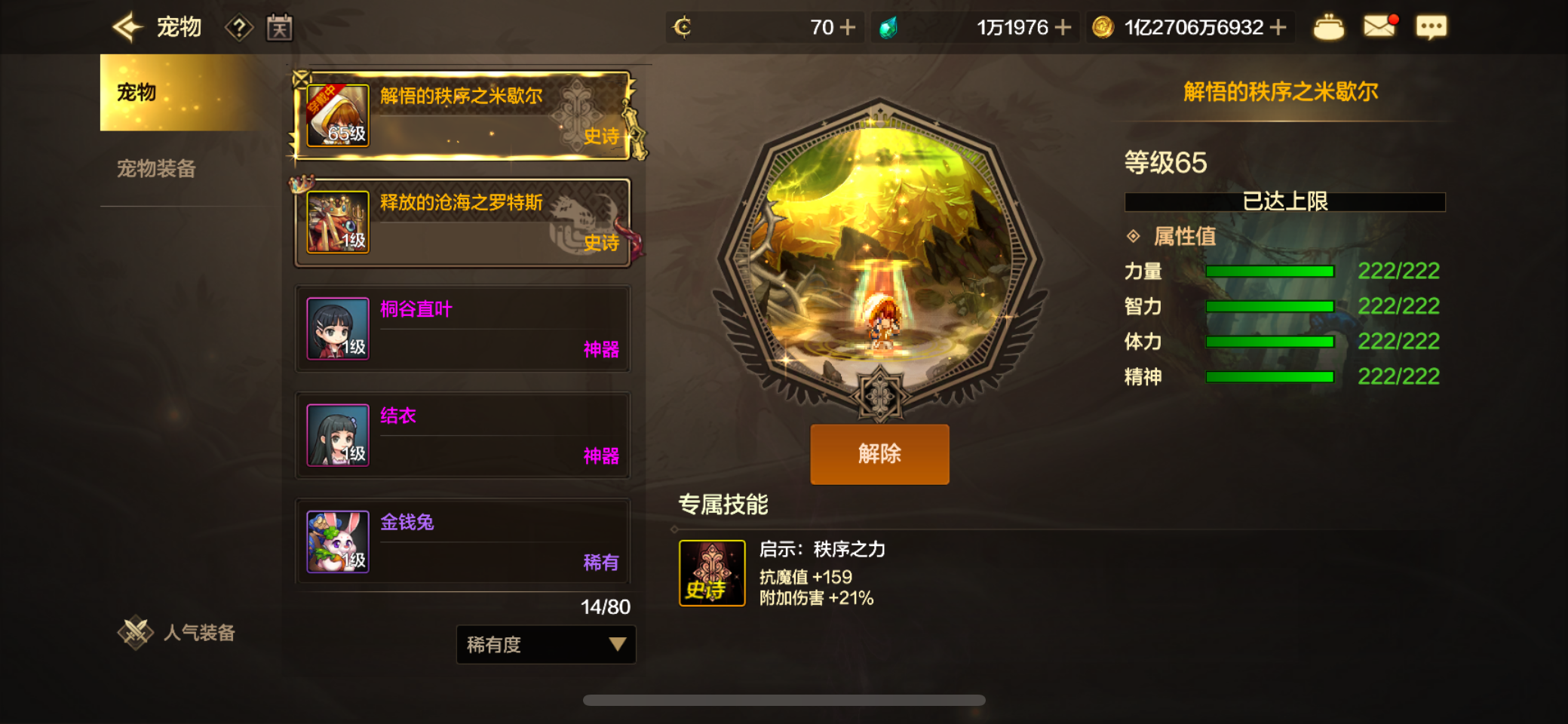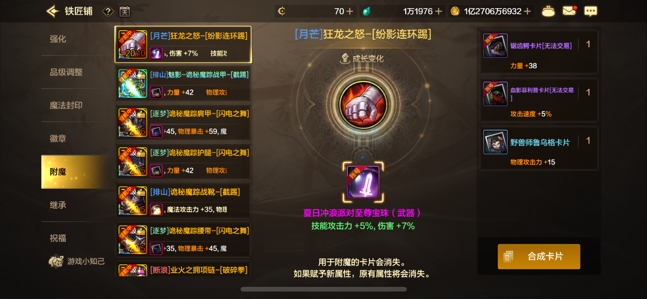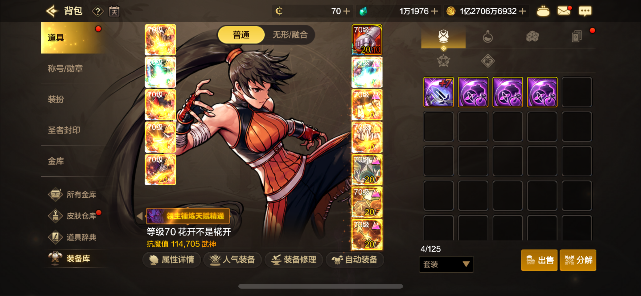大号武神四尊四宝珠,增幅10。高配附魔,属强7+7,宠物满伤害21。副c剑魔魔剑装扮,单尊双宝珠。10w小号