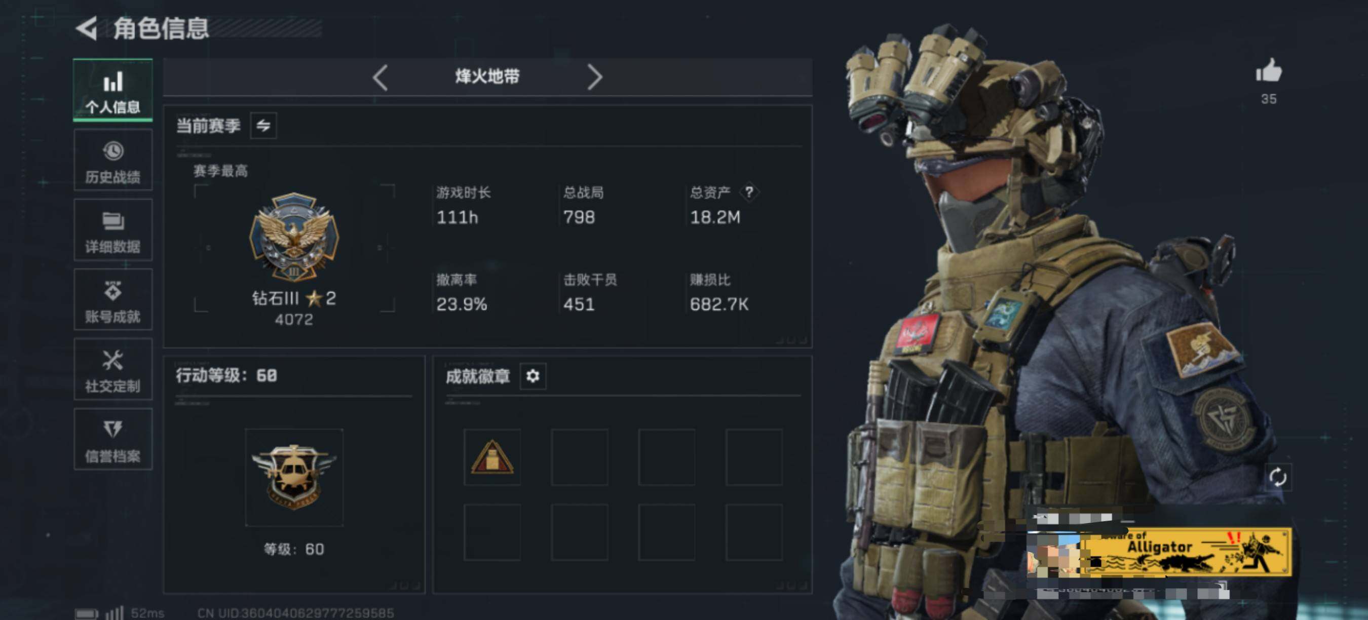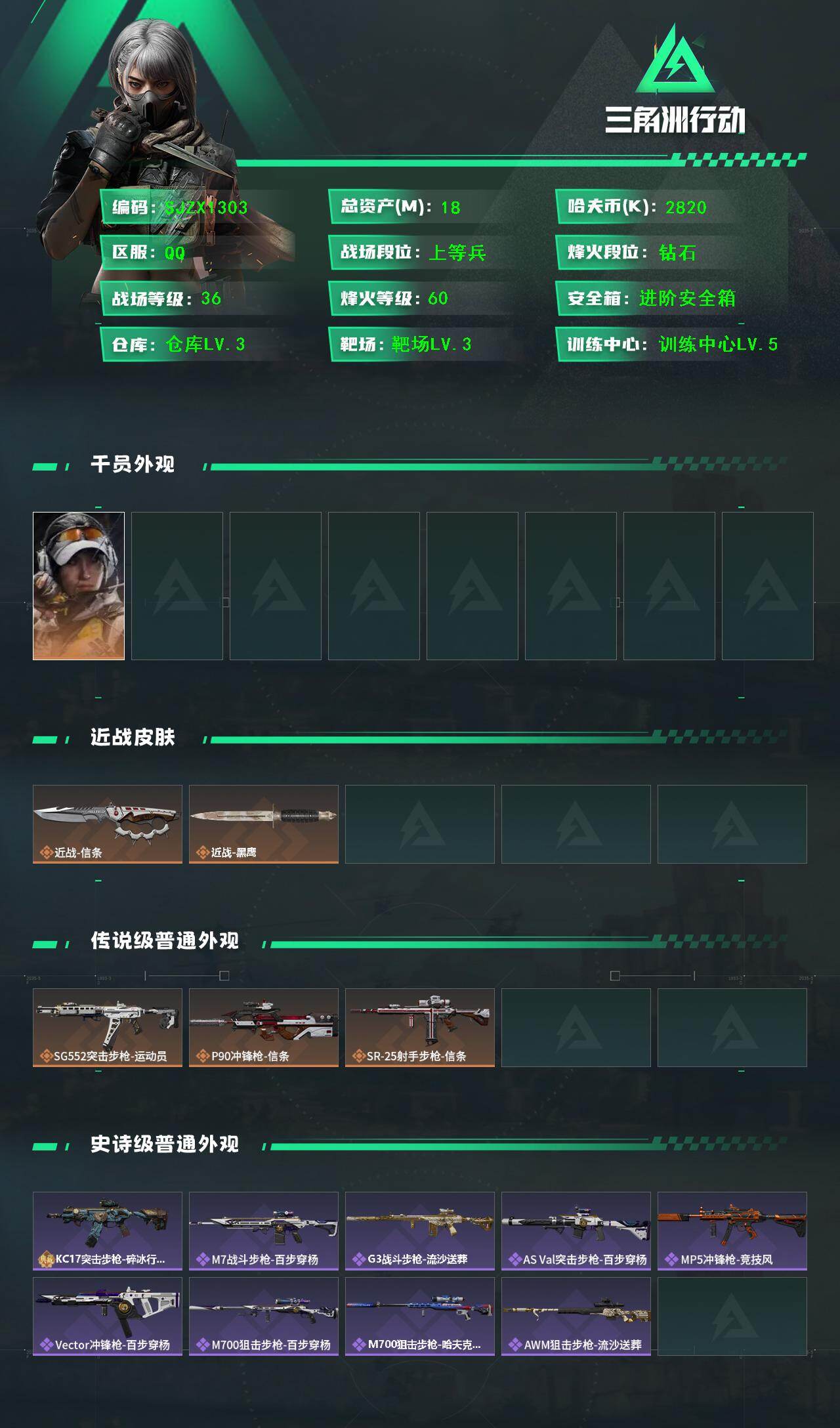 总资产(M):18M/哈夫币(K):2820K/传说枪皮数:3/全面战场等级:36_段位:上等兵/烽火地带等级:60_段位:钻石/