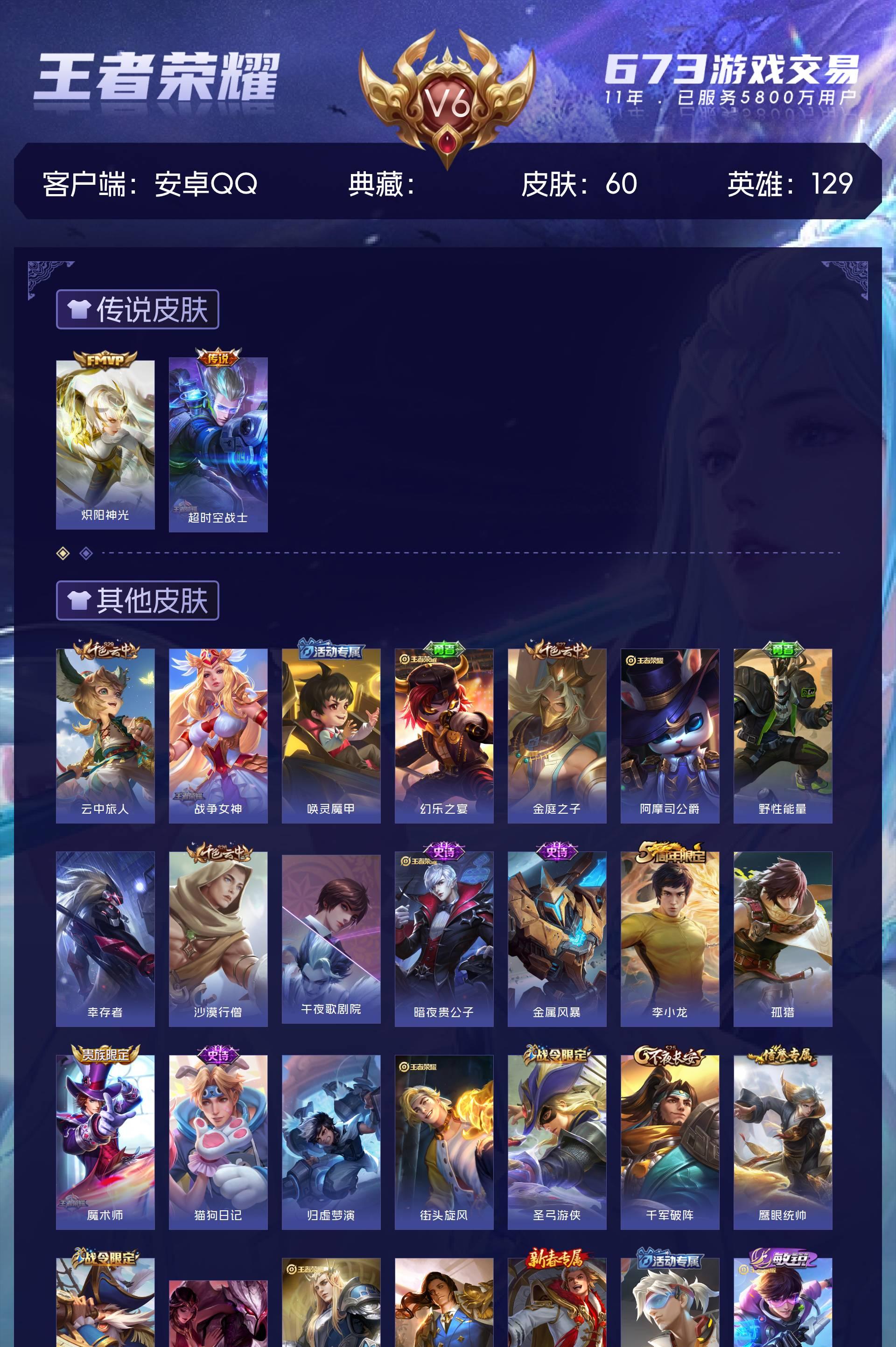 V6 皮肤60 英雄129 尊贵铂金 传说3 其他皮肤62