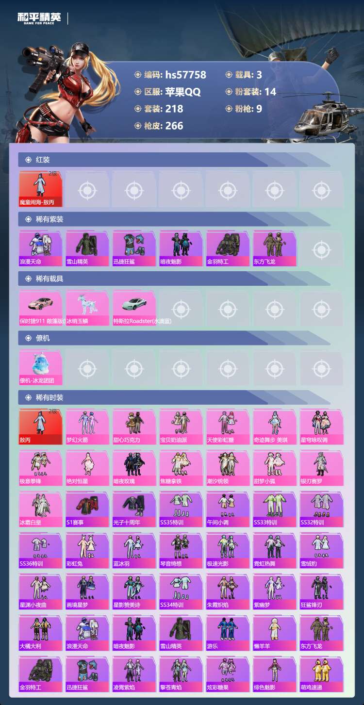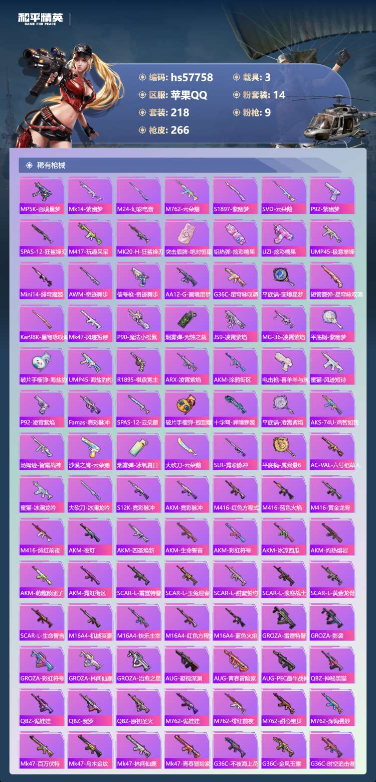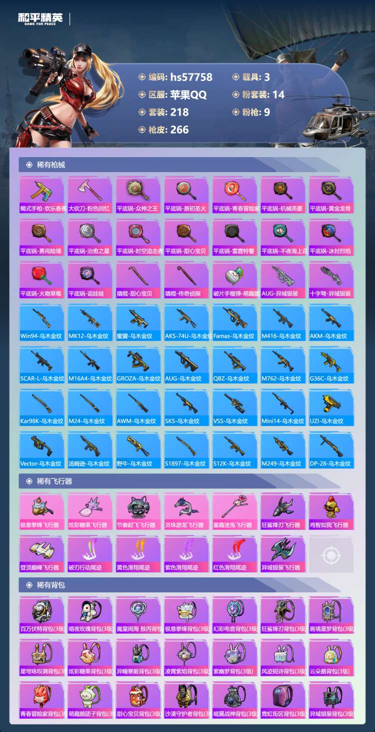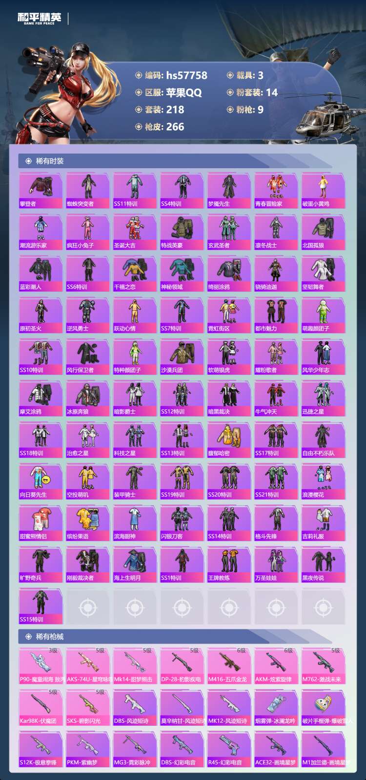 hs57758 苹果手Q-21王牌印记-有战神框-1红装-14粉装-9特效枪-3载具-97883热力