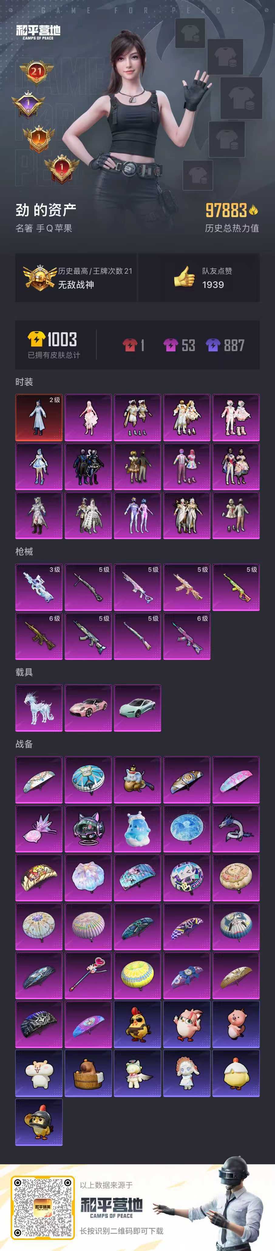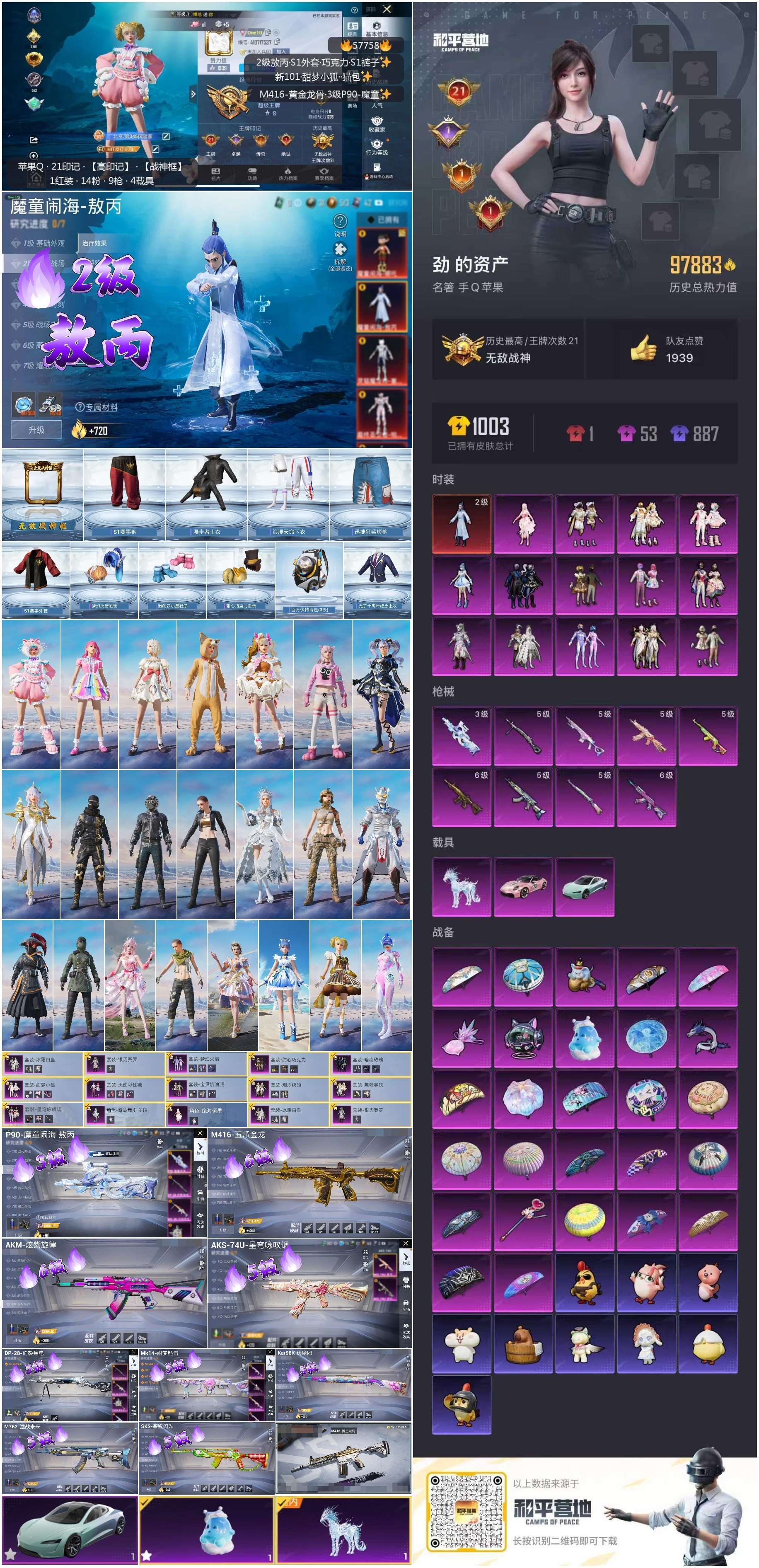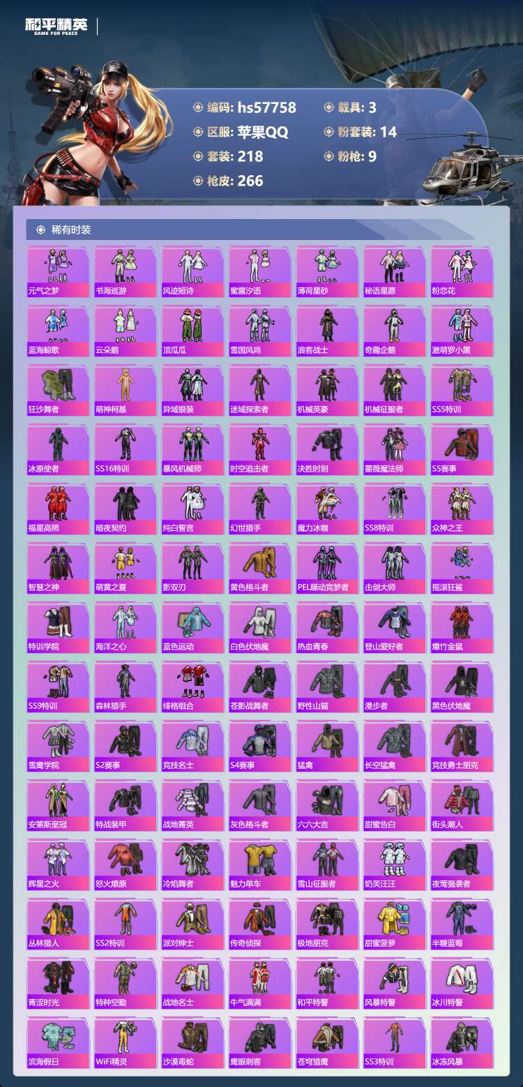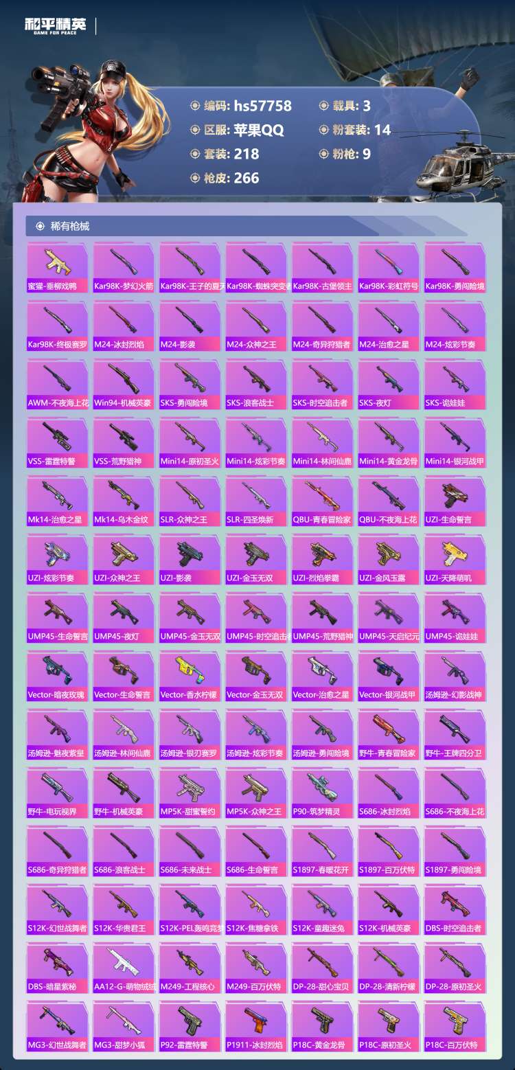 hs57758 苹果手Q-21王牌印记-有战神框-1红装-14粉装-9特效枪-3载具-97883热力