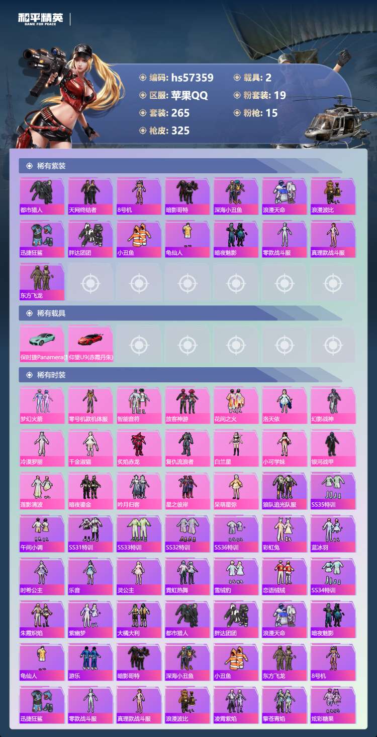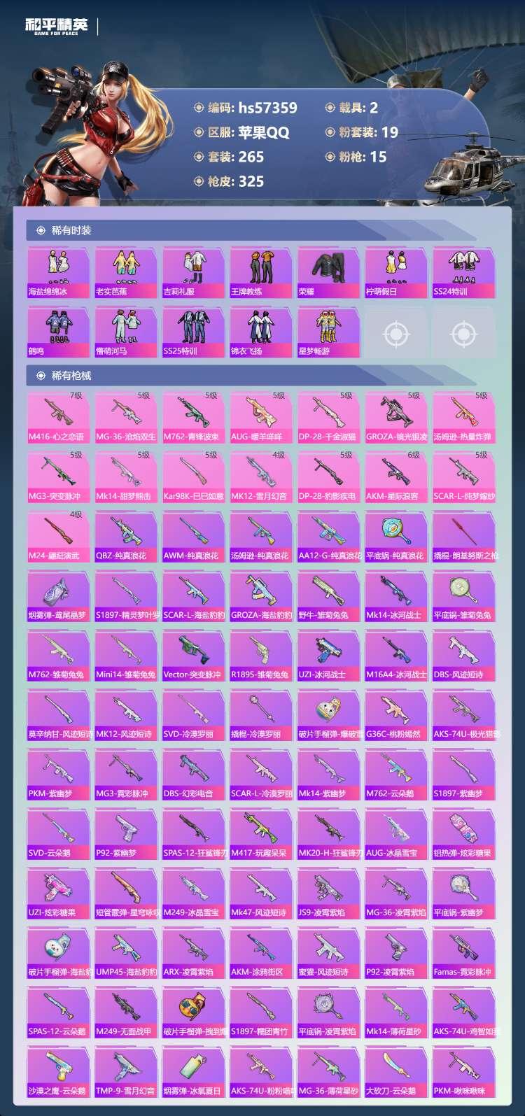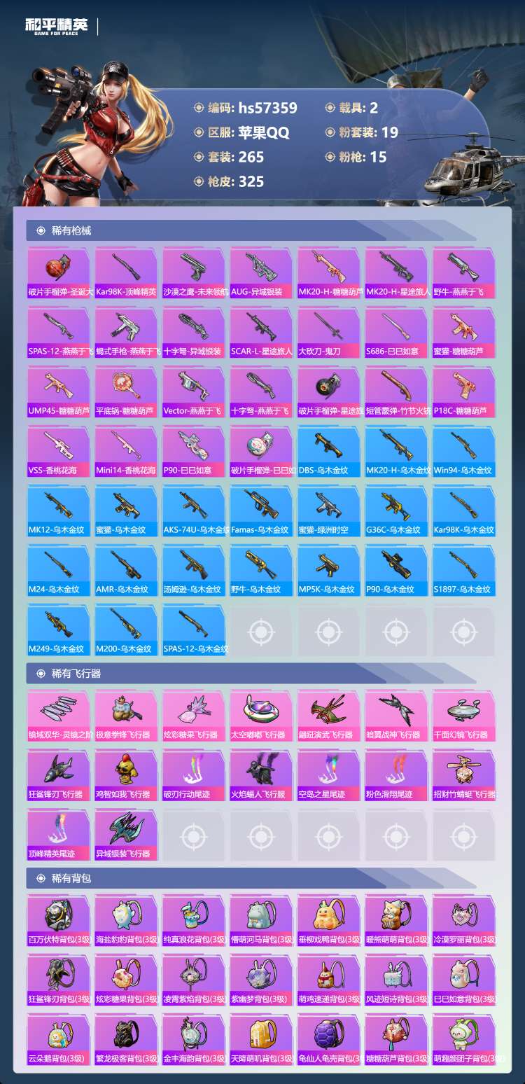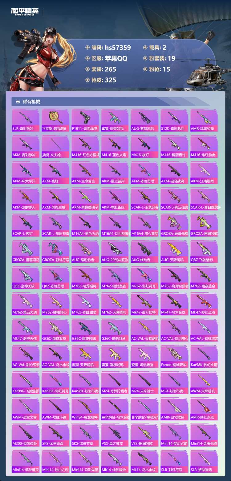 hs57359 苹果手Q-19王牌印记-19粉装-15特效枪-2载具-113751热力值-265套装