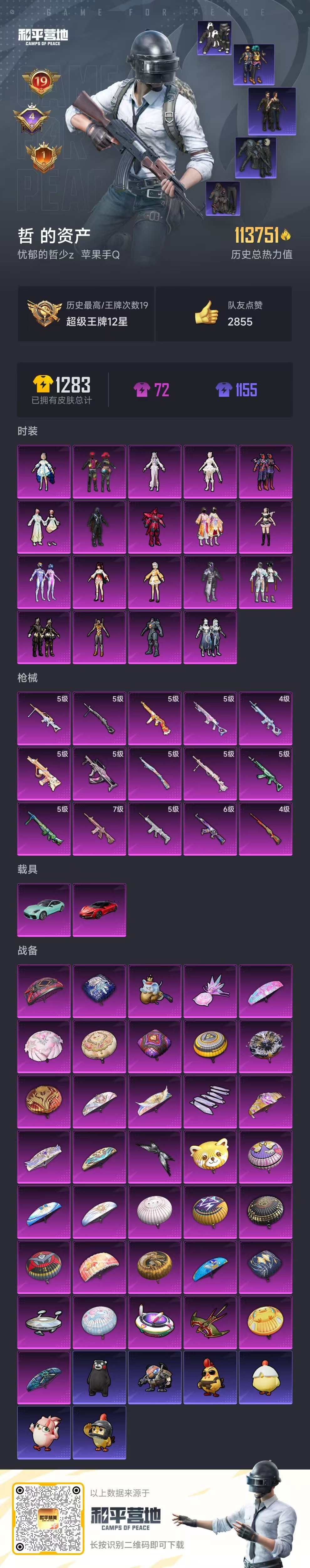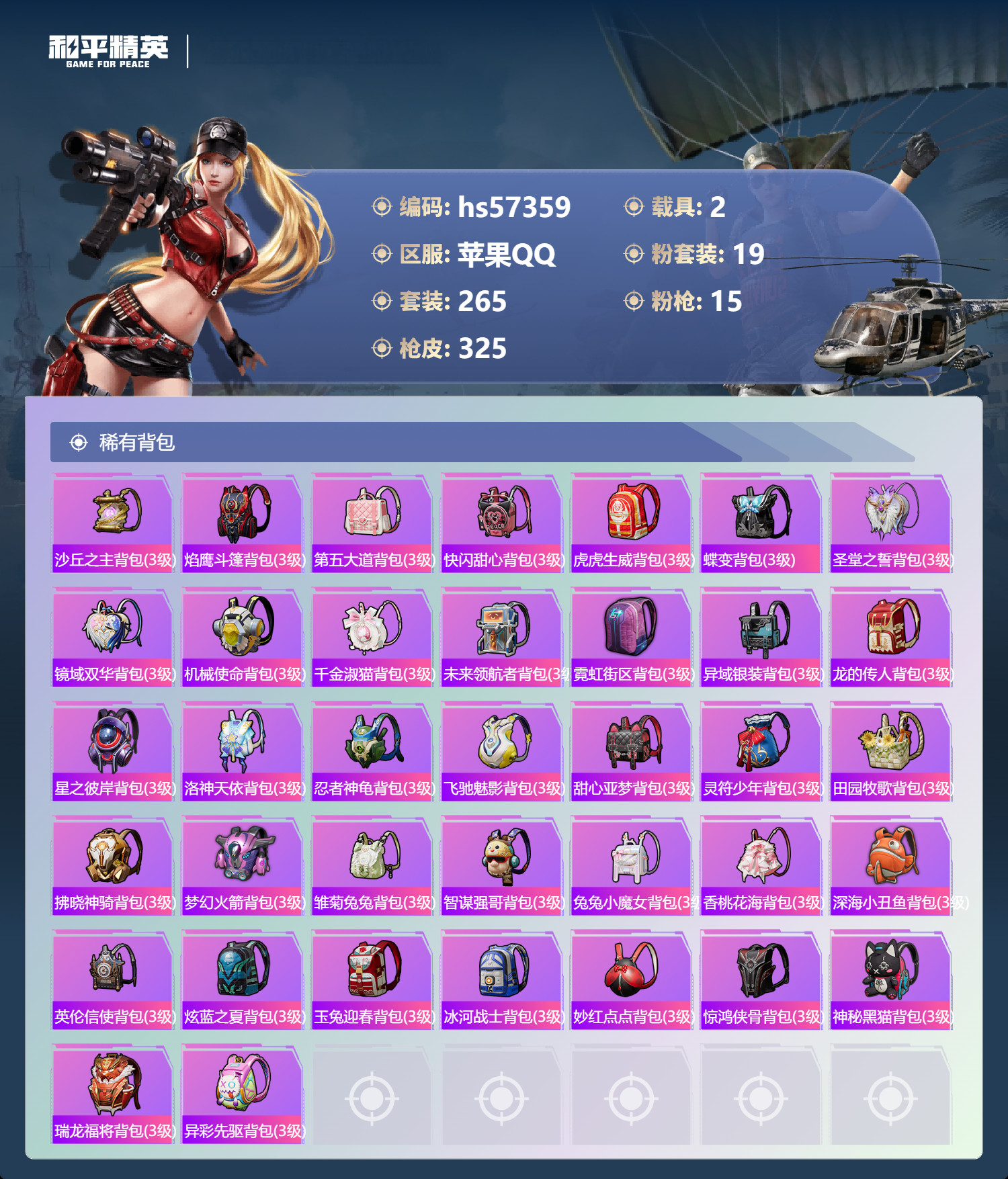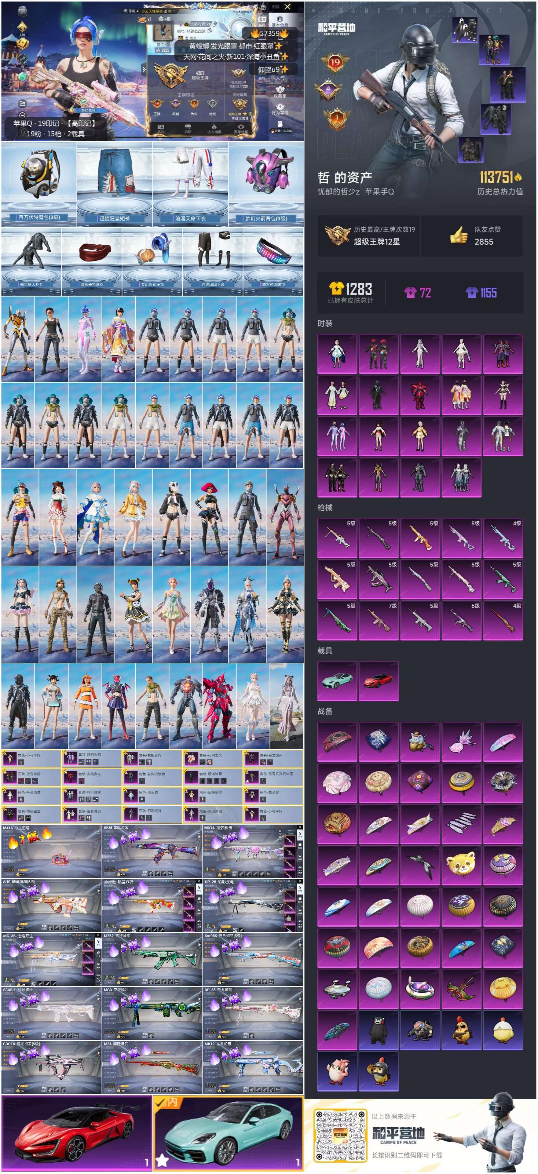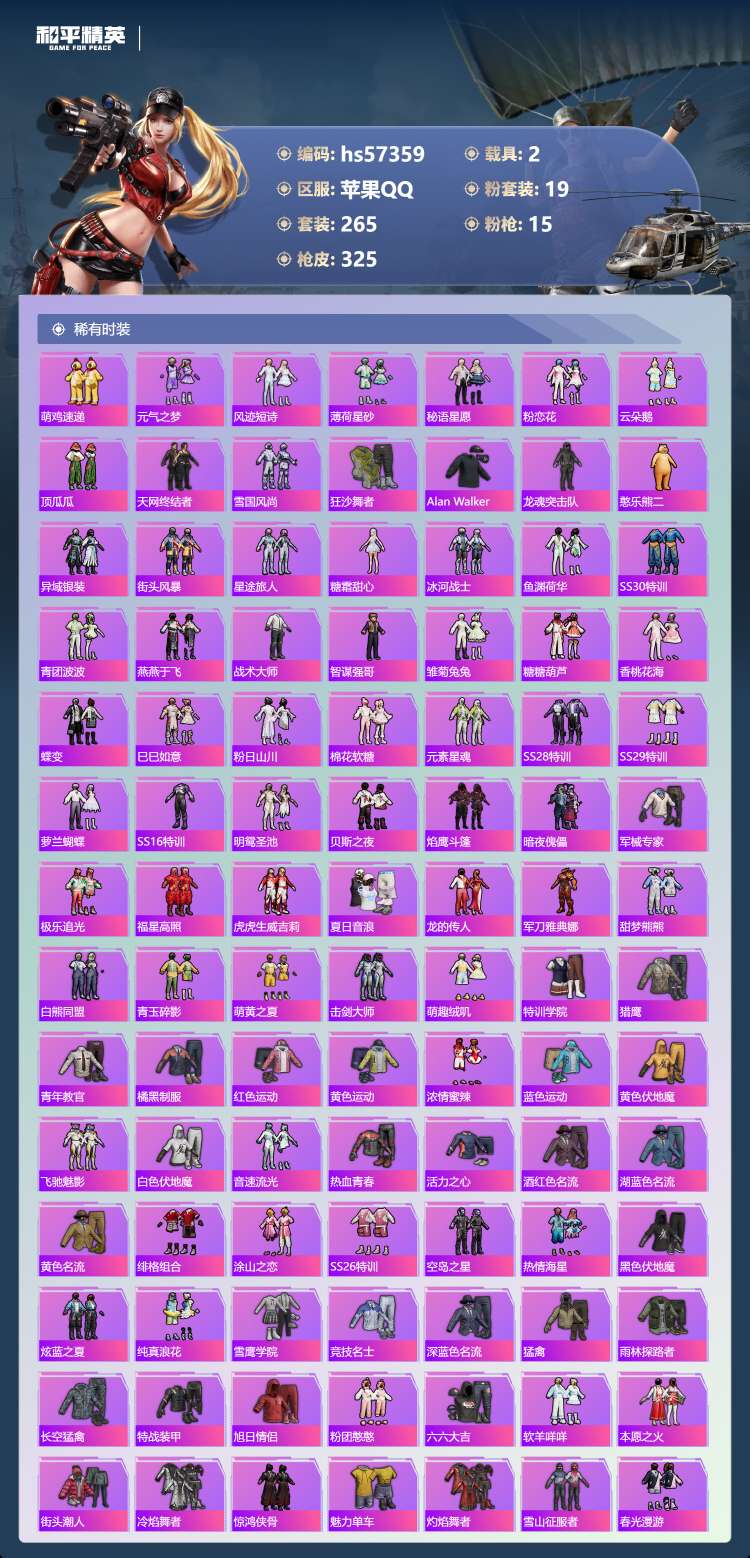 hs57359 苹果手Q-19王牌印记-19粉装-15特效枪-2载具-113751热力值-265套装