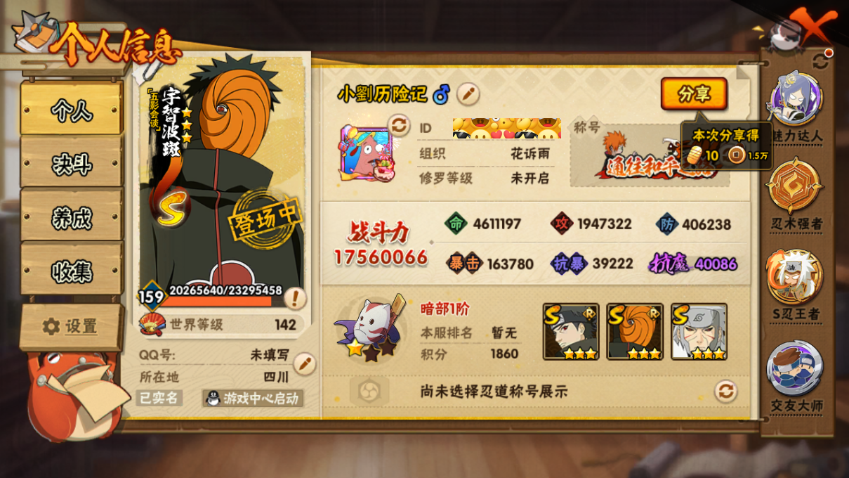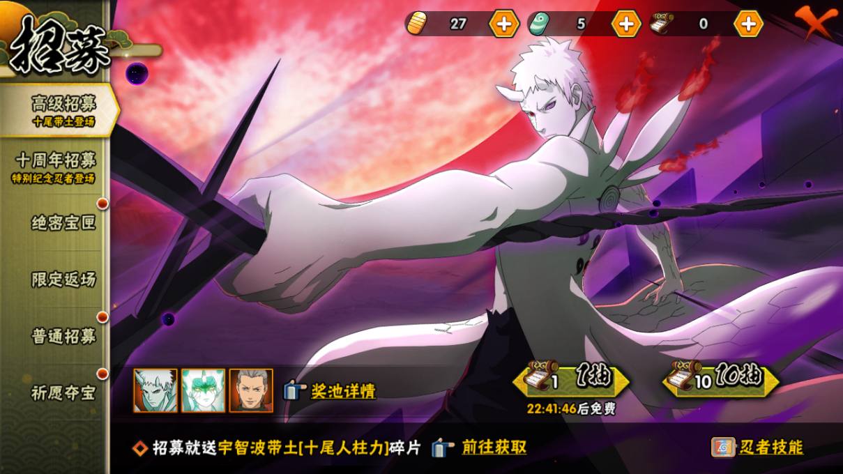 1756w战力超哥创柱48s+2个298点卷a14个198直购a68a+十尾带土碎片77个+国宝/螃蟹/万蛇