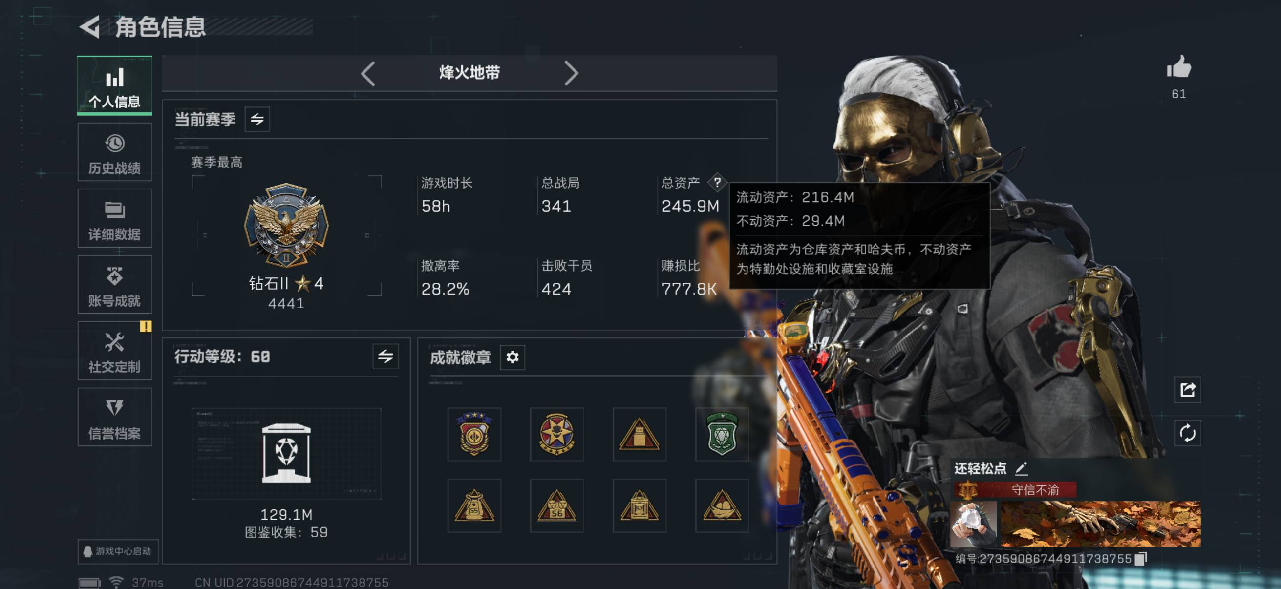 总资产247.8m 流动资产218.6M哈夫币24896k 2红皮 4金皮 3刀皮 顶级安全箱 仓库