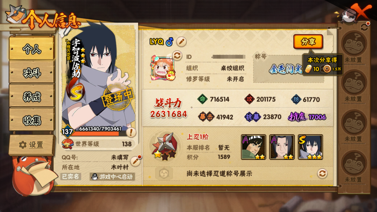 263W战力永恒佐助5A+泳装鼬6A战力263忍者总数49游