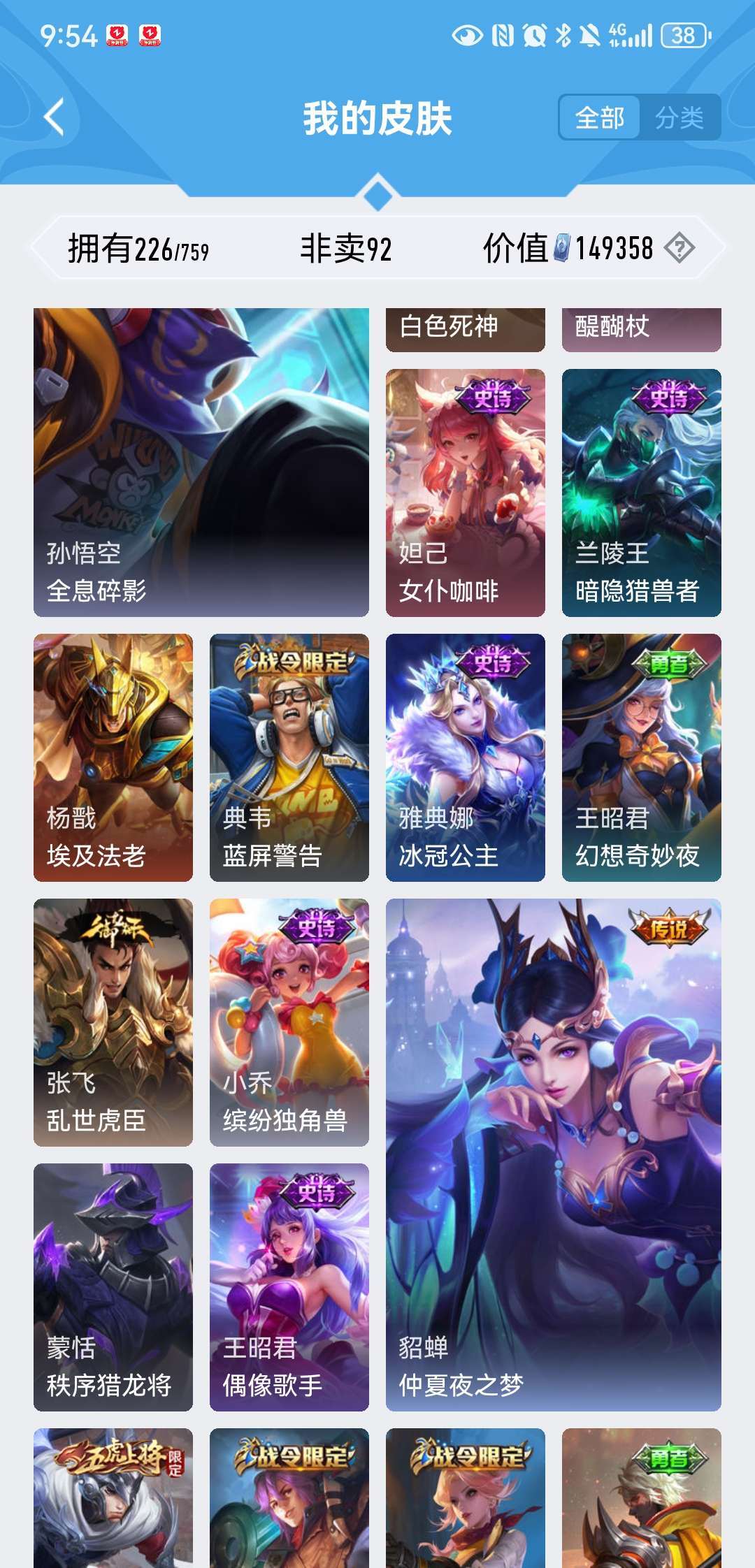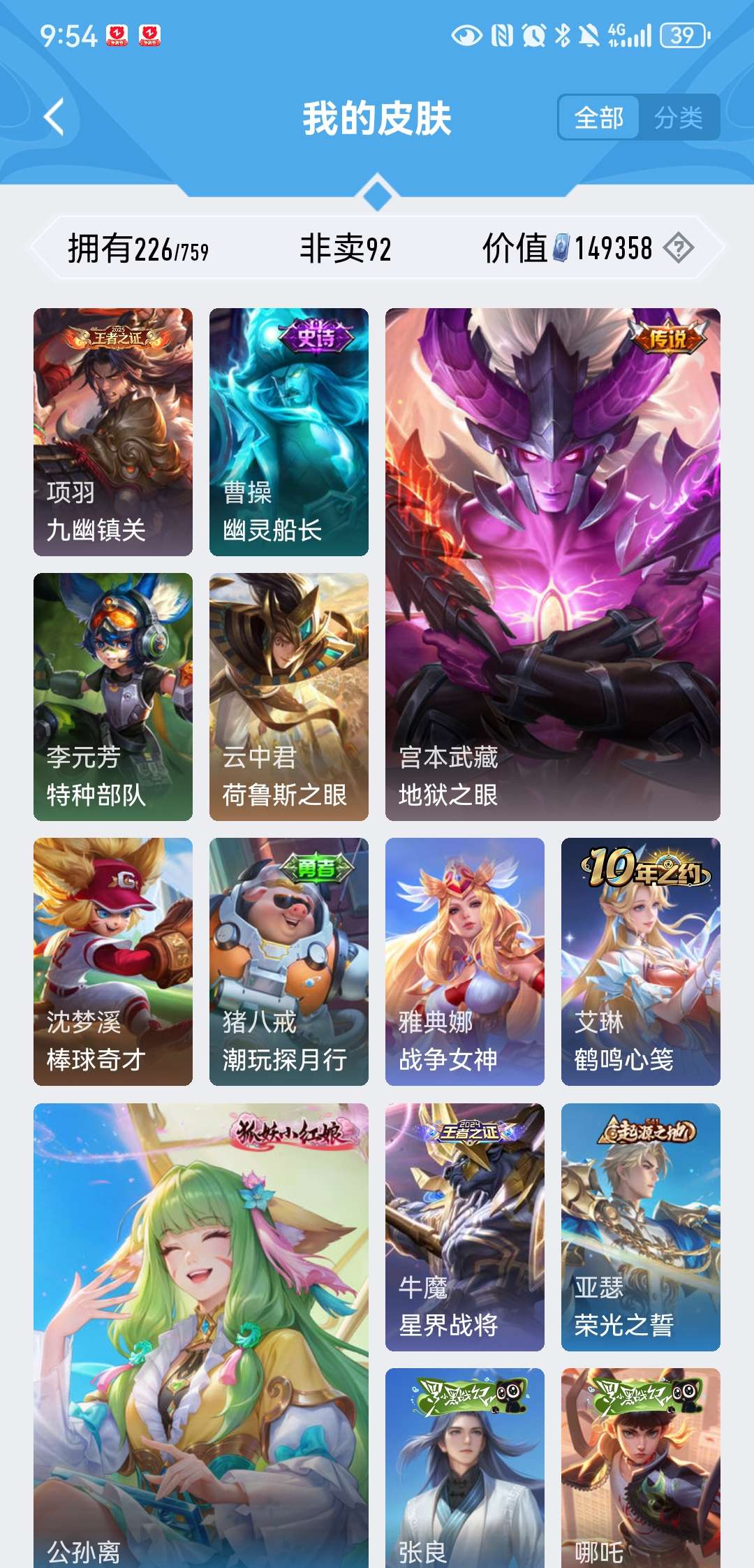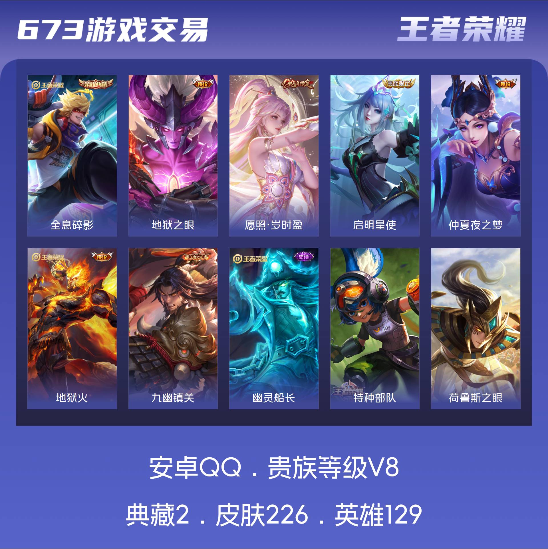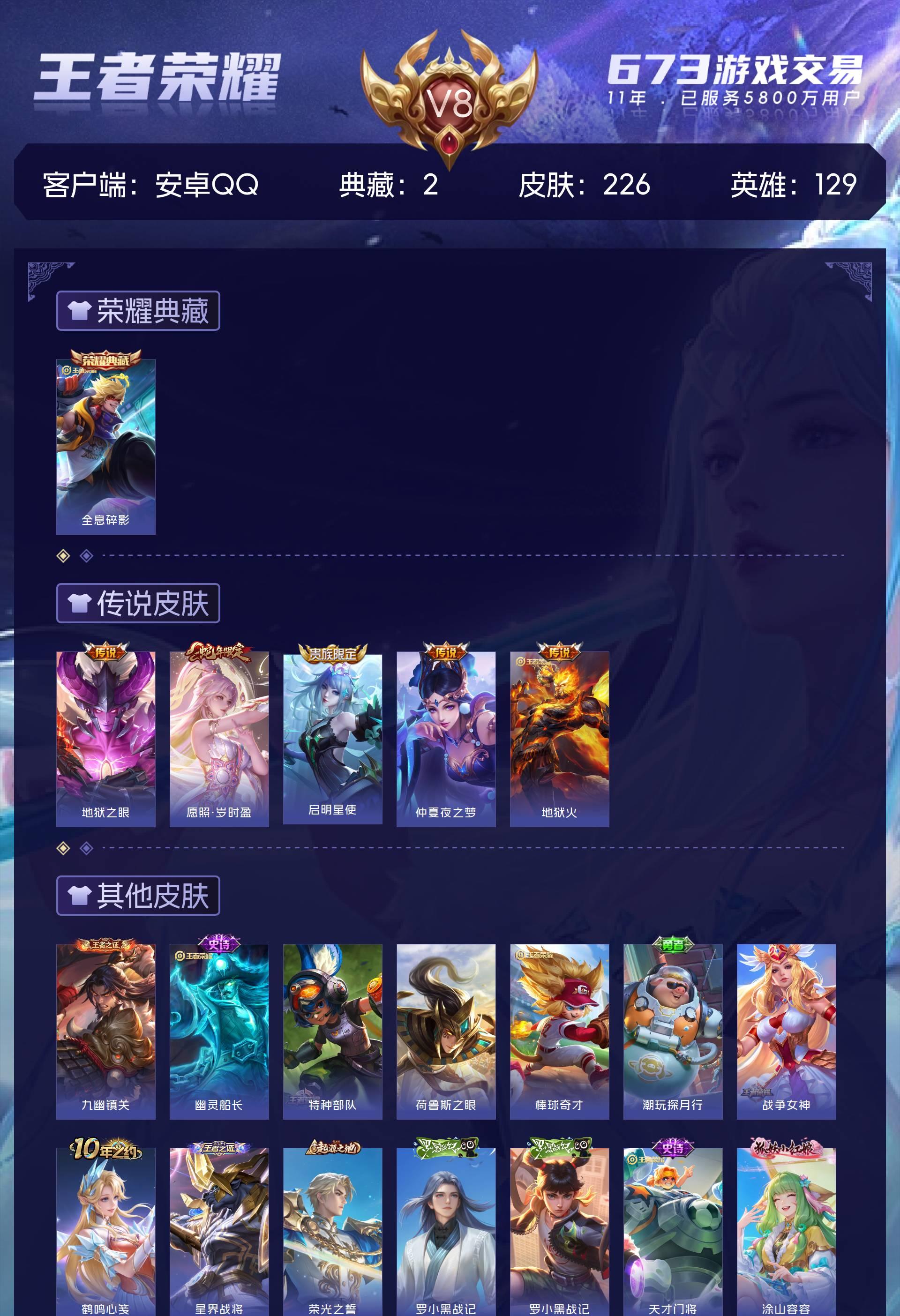 V8 皮肤226 英雄129 至尊星耀 荣耀典藏2 星传说1 传说5 其他皮肤226