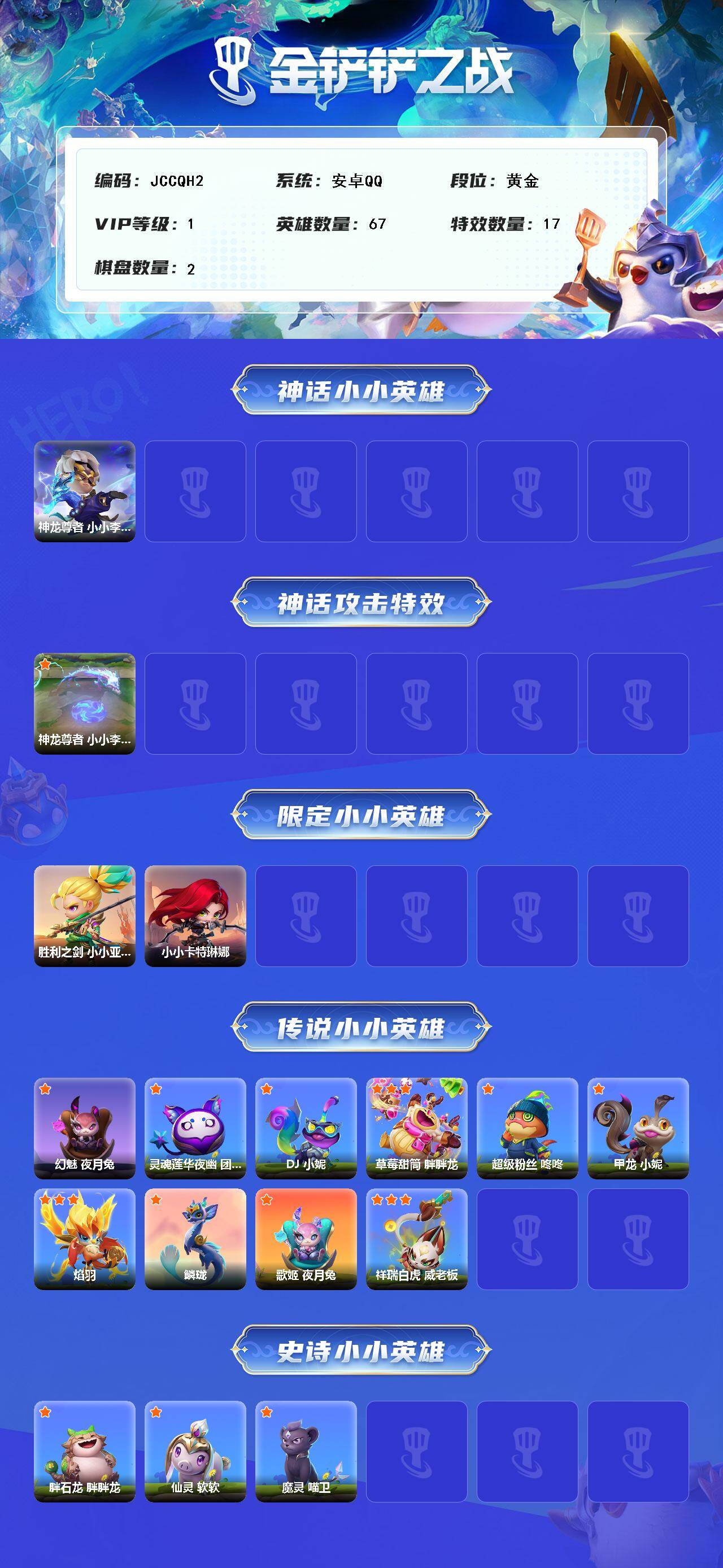 【JCCQH2】1神话/67小小英雄/2棋盘/神龙尊者 小小李青/神龙尊者 小小李青(专属)/胜利之剑 小小亚索/小小卡特琳娜/幻魅 夜月兔/灵魂莲华夜幽 团子/DJ 小妮/草莓甜筒 胖胖龙/超级粉丝 咚咚/甲龙 小妮/焰羽/鳞珑/歌姬 夜月兔/祥瑞白虎 威老板/胖石龙 胖胖龙/仙灵 软软/魔灵 喵卫