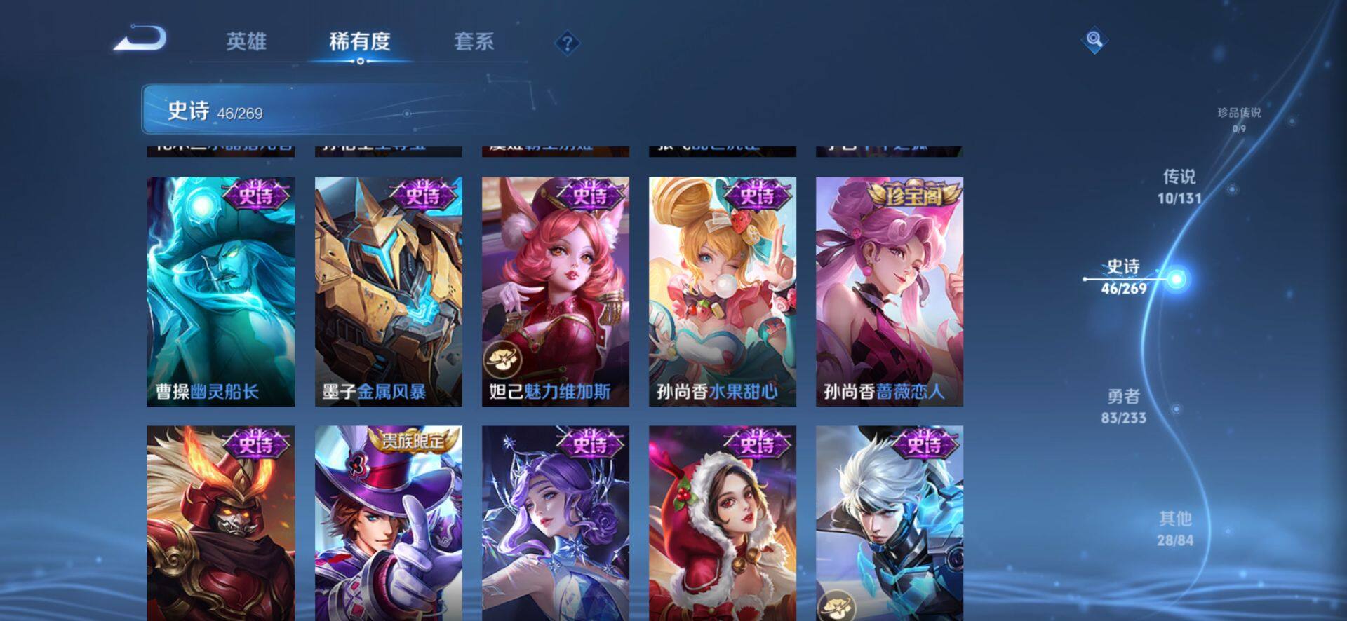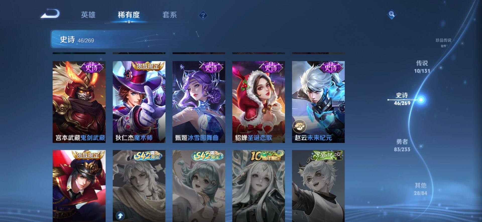 【传说皮肤】:裴擒虎祥瑞亨通,澜逐花归海,王昭君乞巧织情,西施游龙清影,曜李逍遥 ,诸葛亮时雨天司,孙悟空零号赤焰,李信一念神魔,百里玄策白虎志,宫本武藏地狱之眼