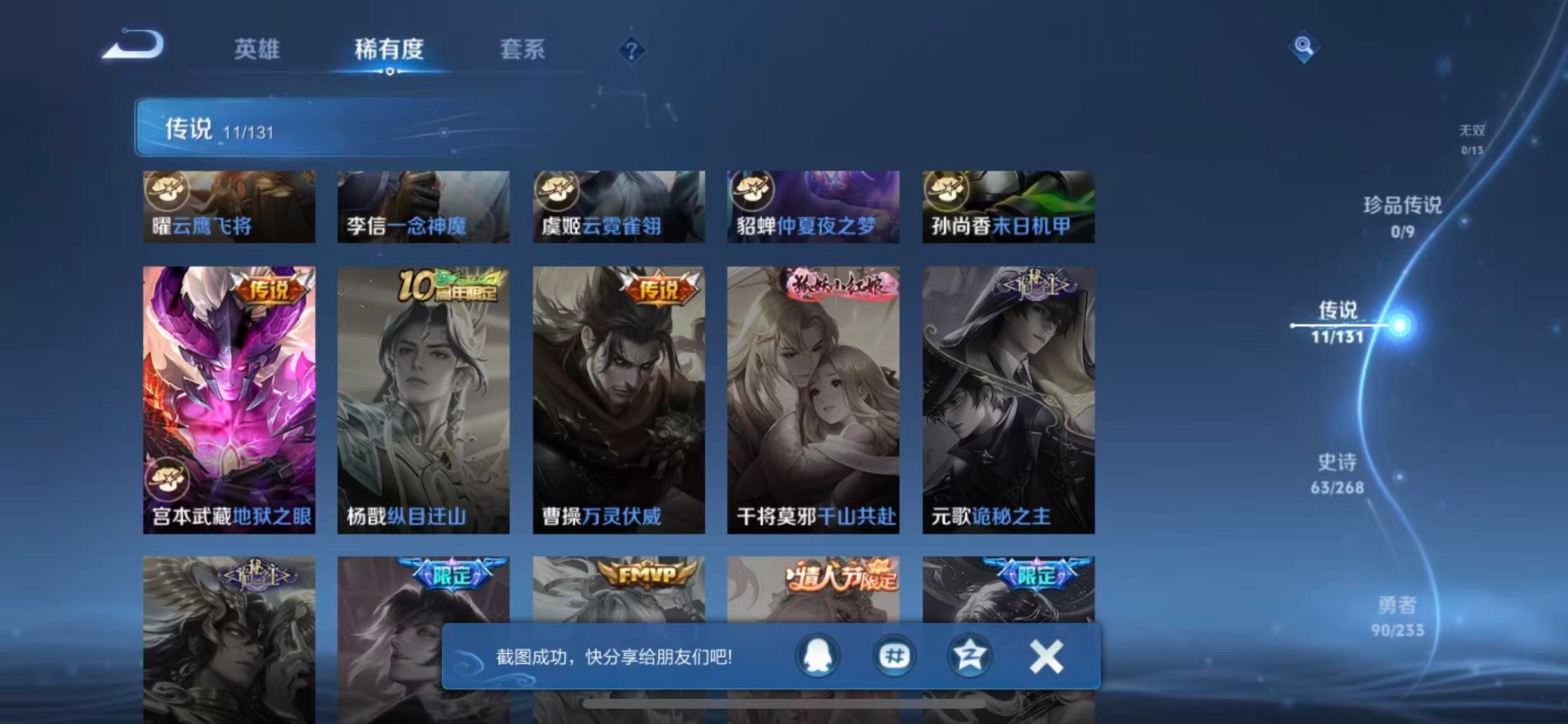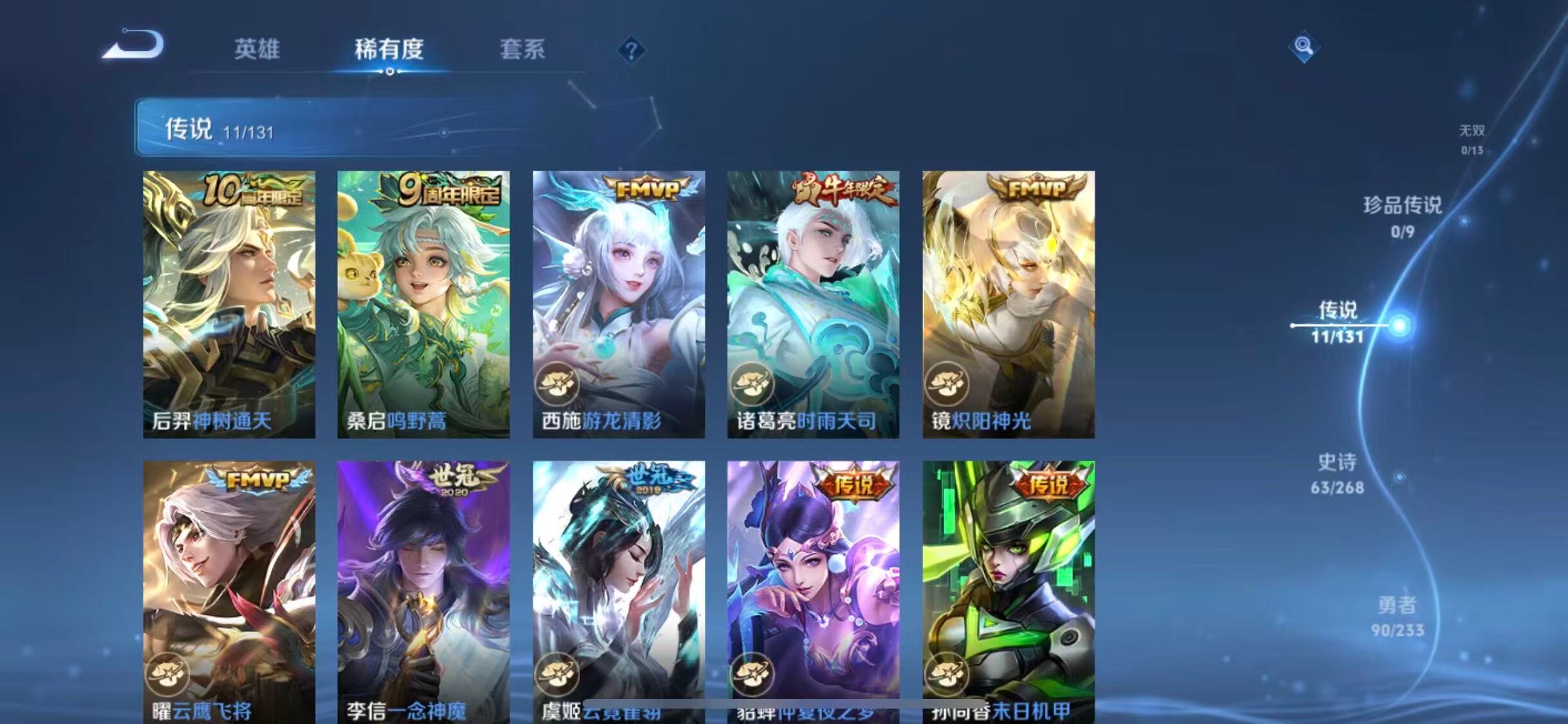 【传说皮肤】:后羿神树通天,桑启鸣野蒿,西施游龙清影,诸葛亮时雨天司,镜炽阳神光,曜云鹰飞将,李信一念神魔,虞姬云霓雀翎,貂蝉仲夏夜之梦,孙尚香末日机甲,宫本武藏地狱之眼