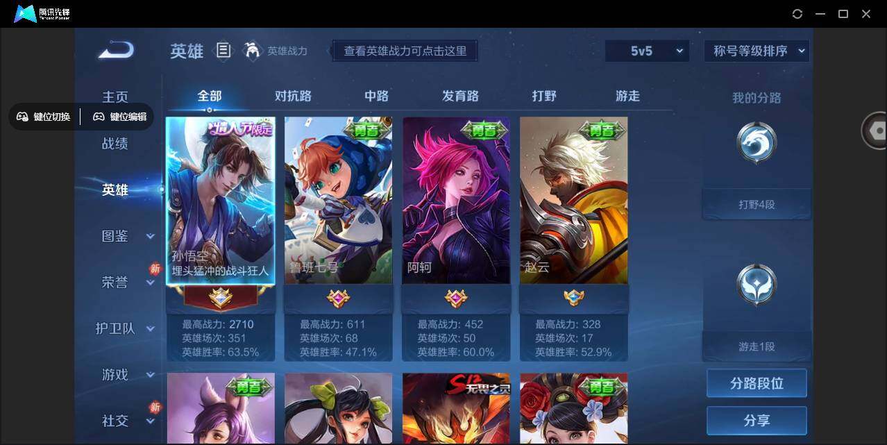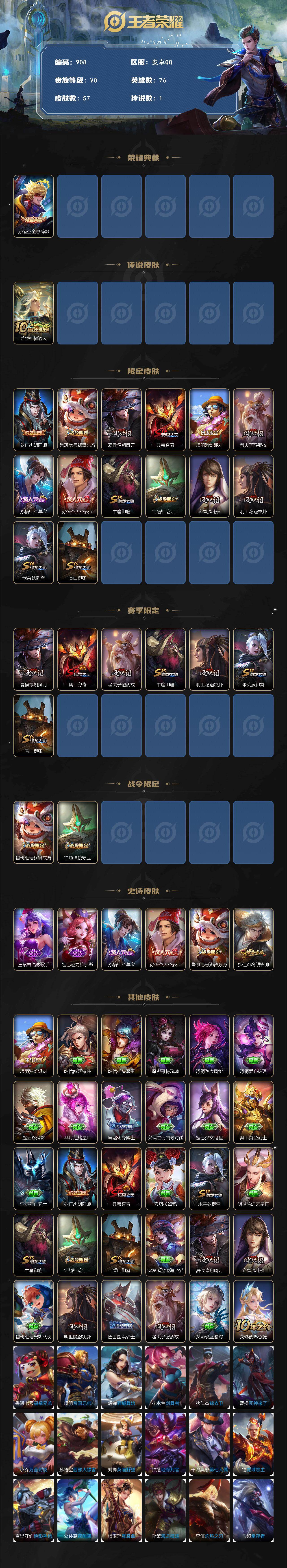 2028867 安卓Q-V4-尊贵铂金III段位-76英雄-57皮肤-1典藏皮肤-1传说-6史诗
