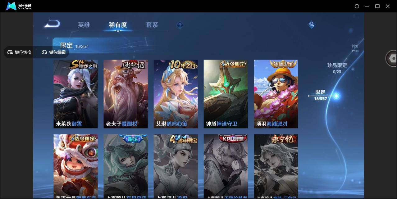 【限定皮肤】:狄仁杰阴阳师,鲁班七号狮舞东方,夏侯惇朔风刀,典韦穷奇,项羽海滩派对,老夫子醍醐杖,孙悟空至尊宝,孙悟空大圣娶亲,牛魔御旌,钟馗神迹守卫,弈星混沌棋,明世隐疑决卦,米莱狄御霄,盾山御銮