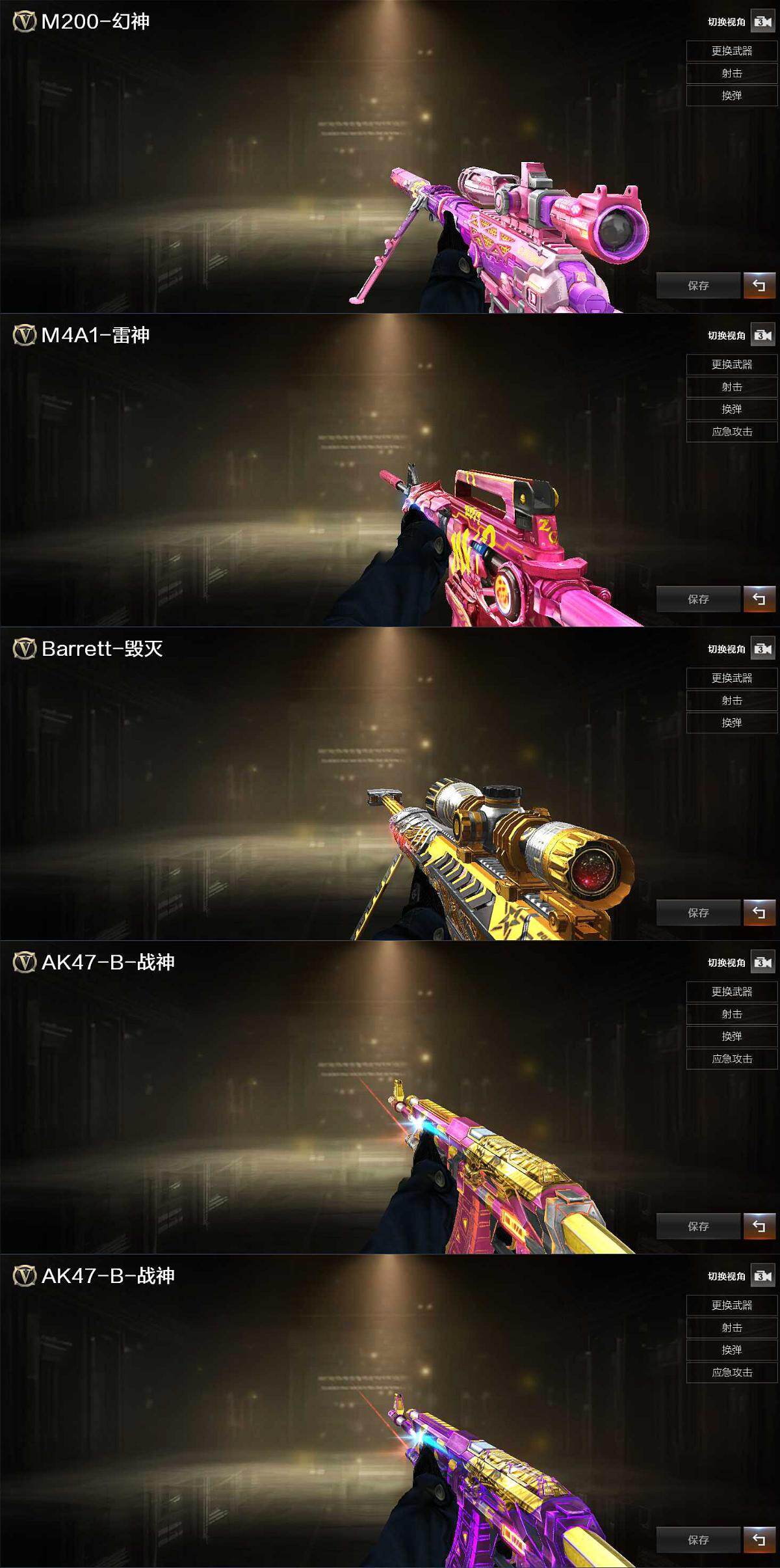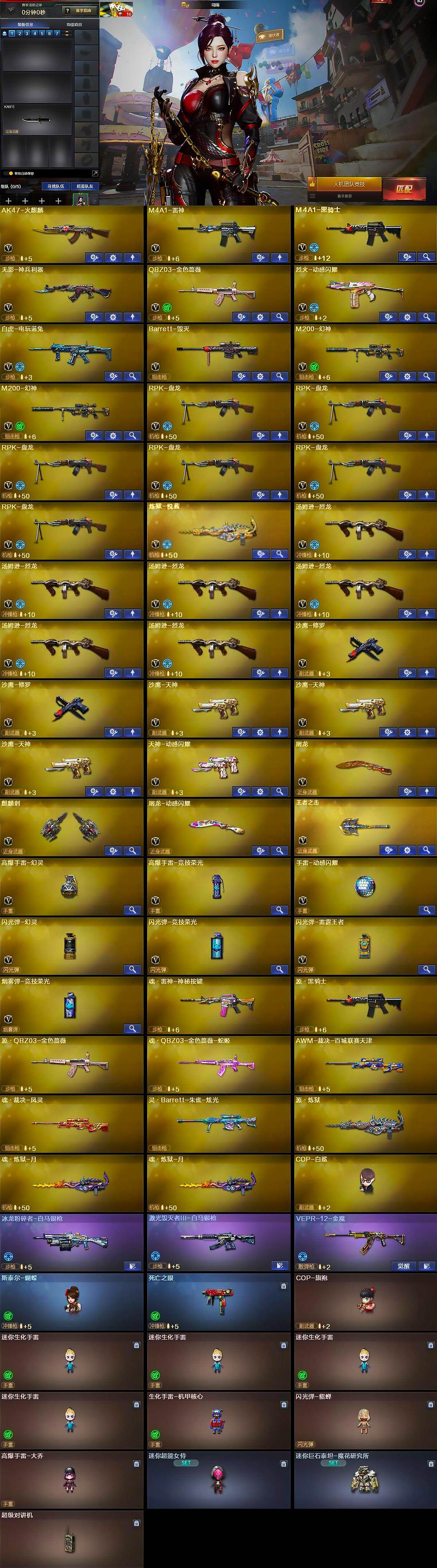 【热门武器】:QBZ03-金色蔷薇,M200-幻神*2,死亡之眼,白虎-电玩蓝兔,M4A1-黑骑士,汤姆逊-烈龙*6,RPK-盘龙*6,斯泰尔-蝴蝶,COP-白鲨,沙鹰-修罗*2,黄金猫猫手套-白鲨,金刚伞