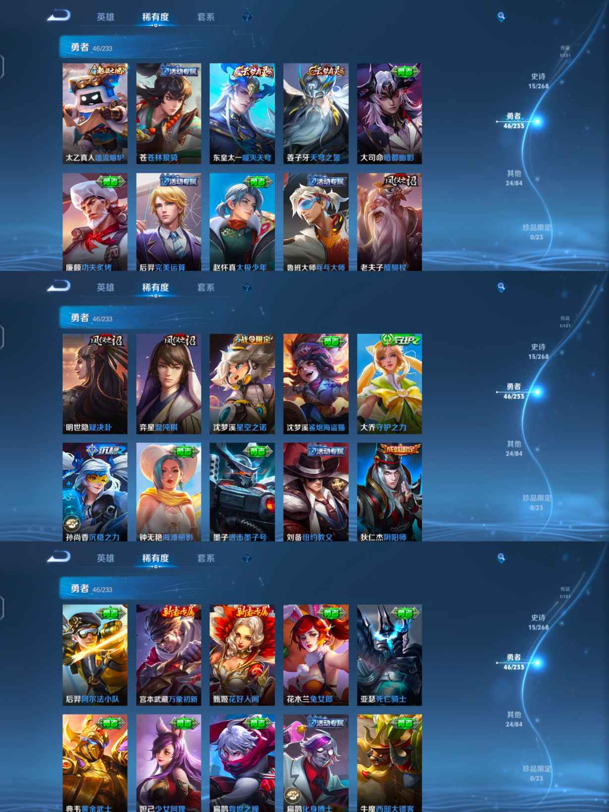 【勇者皮肤】 星梦巡礼 锦麟游梦 逆浪荇歌 孤猎 灼热之刃 铁骨偃魂 苍林狼骑 噬灭天穹 暗都幽影 天穹之誓 功夫炙烤 虚灵犬护 雪境奇遇 玫蓝誓约 完美运算 谧流熔炉 万象初新 街头霸王 教廷