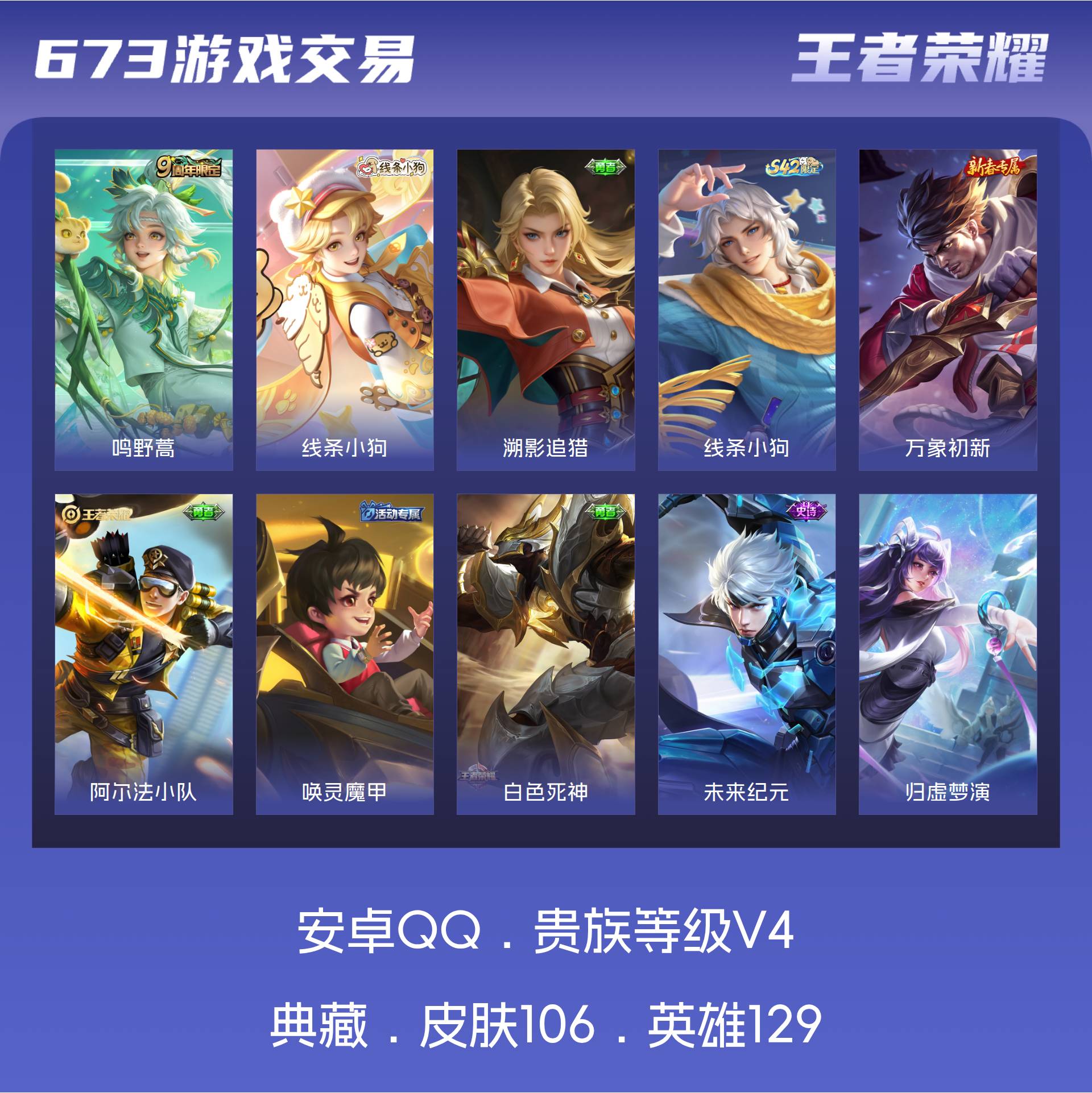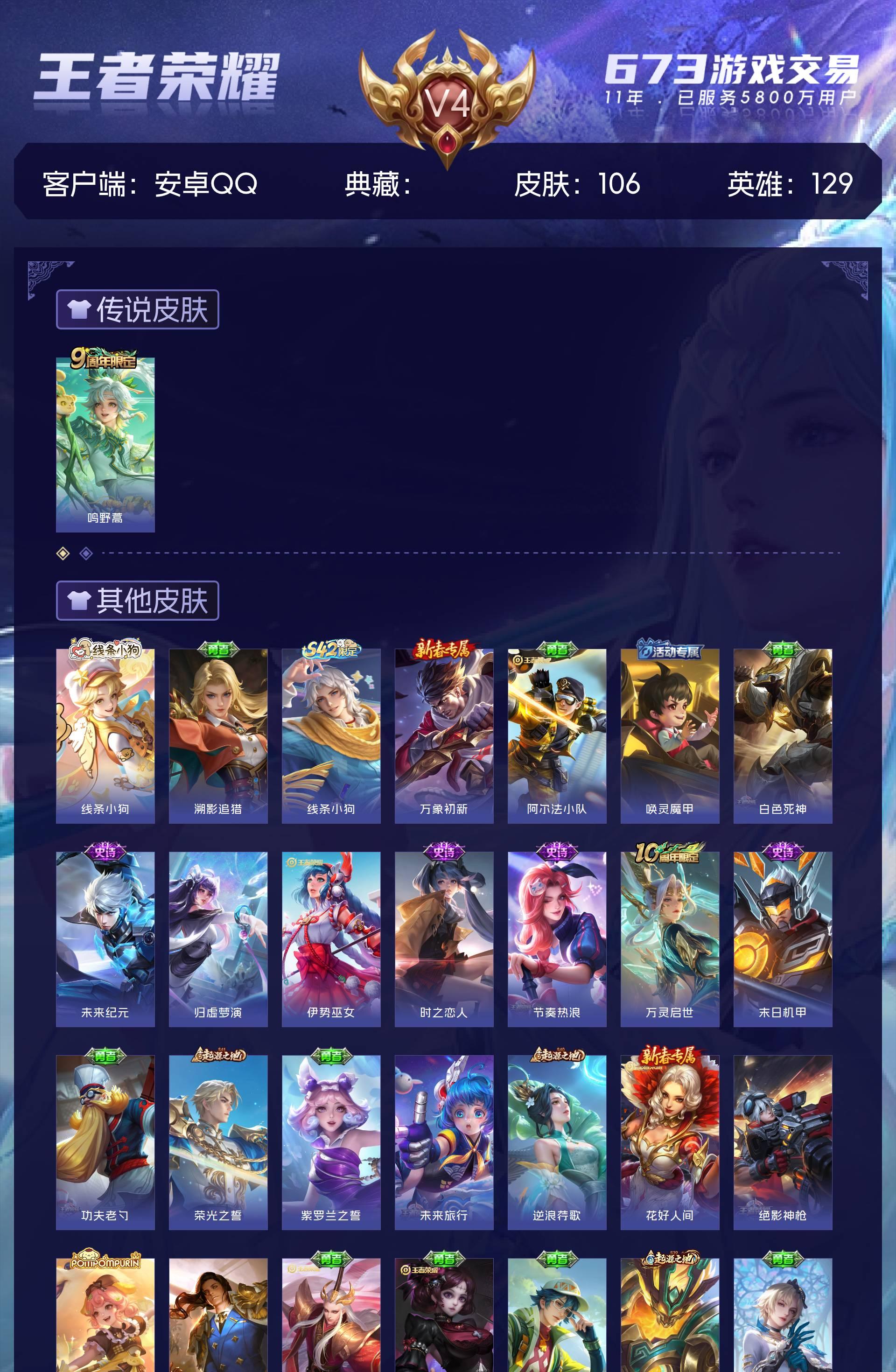 V4 皮肤106 英雄129 尊贵铂金 传说1 其他皮肤110
