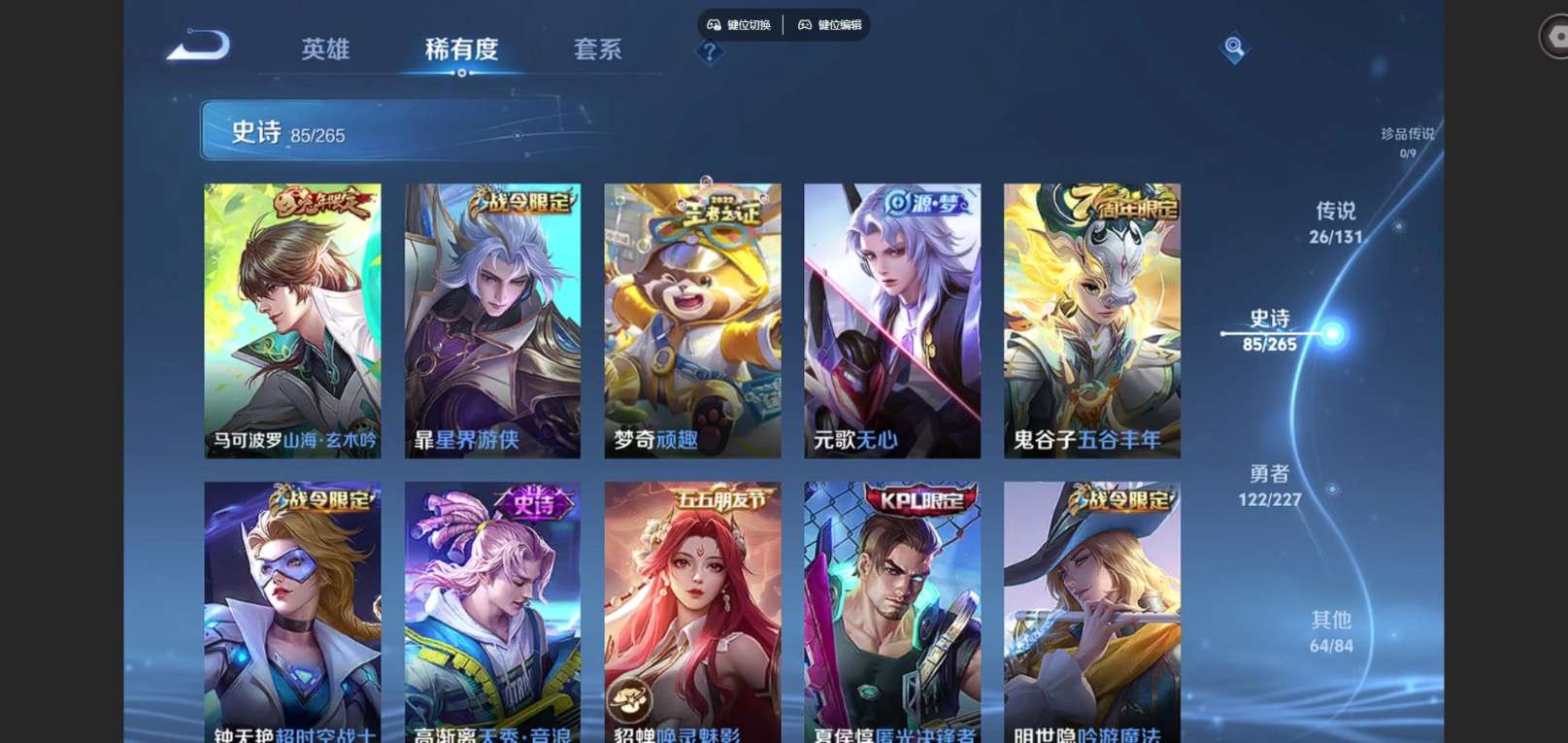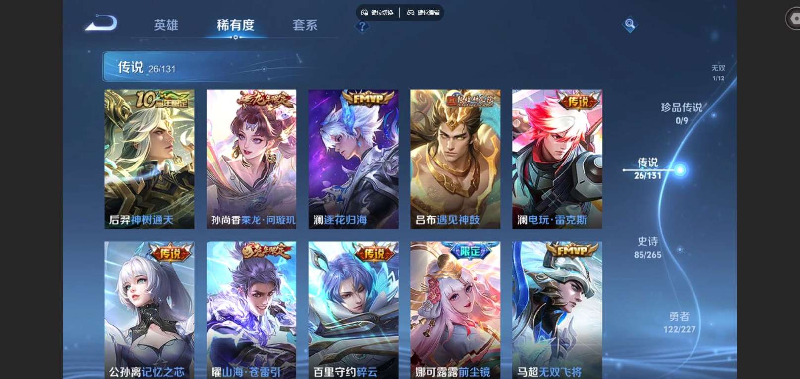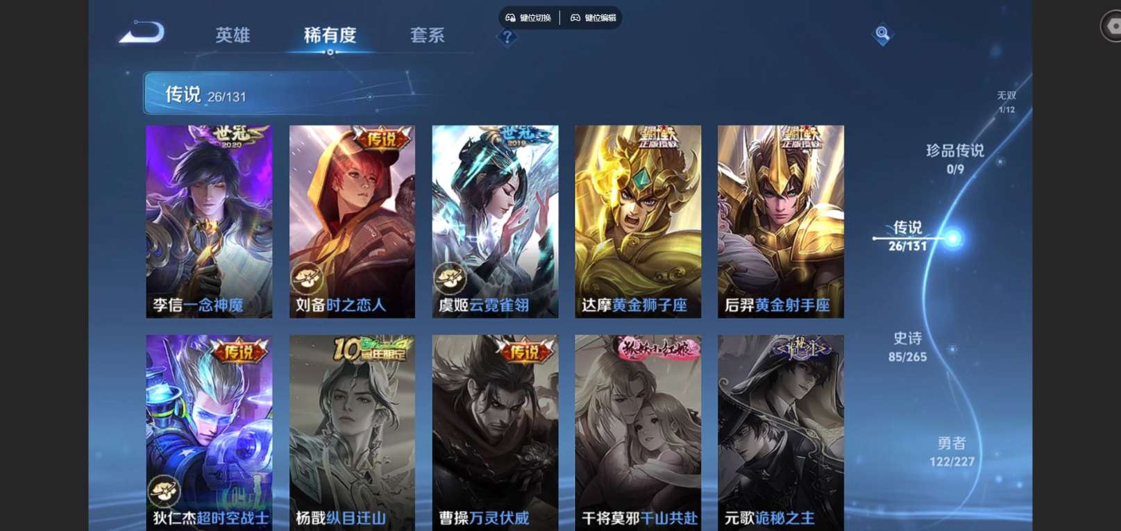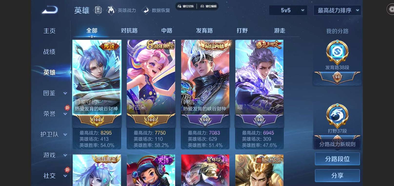 127英雄-300皮肤--V9-2典藏1无双26传说 发育路38段 打野37段 金标百里守约 阿古朵