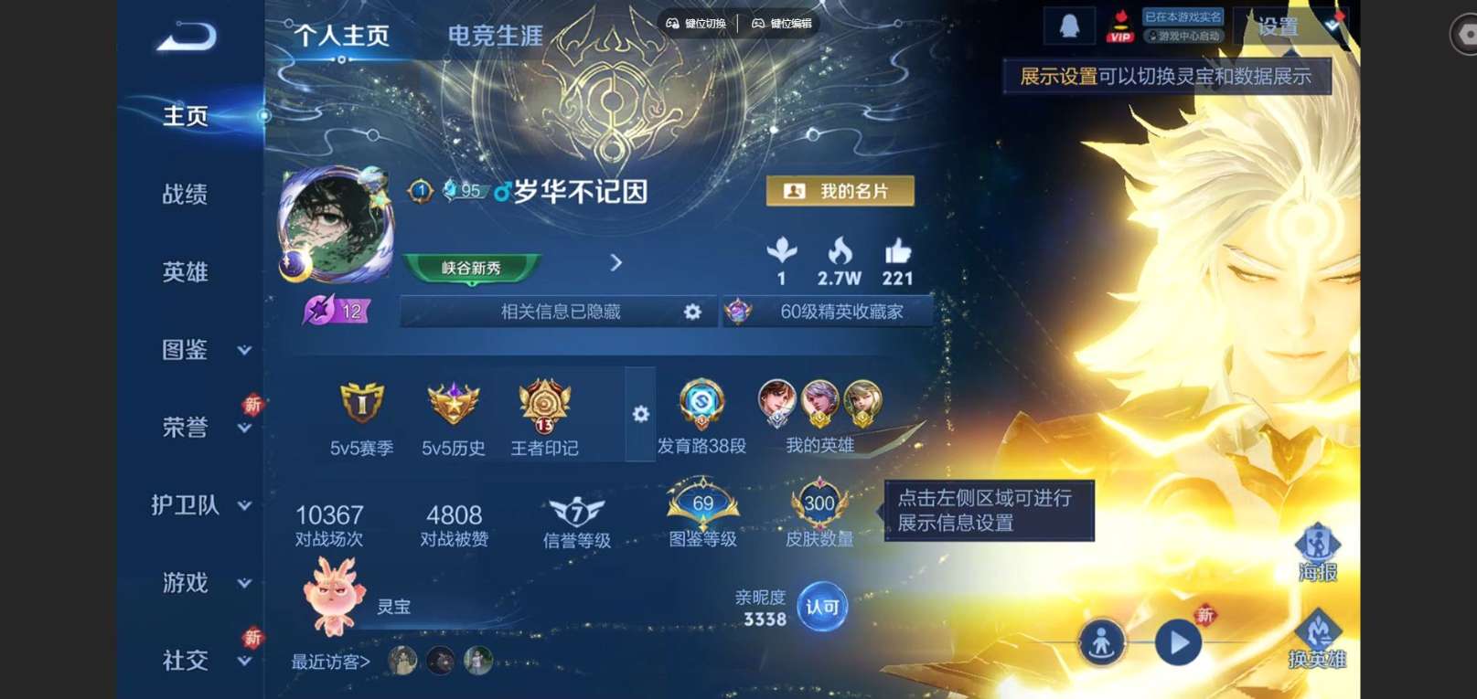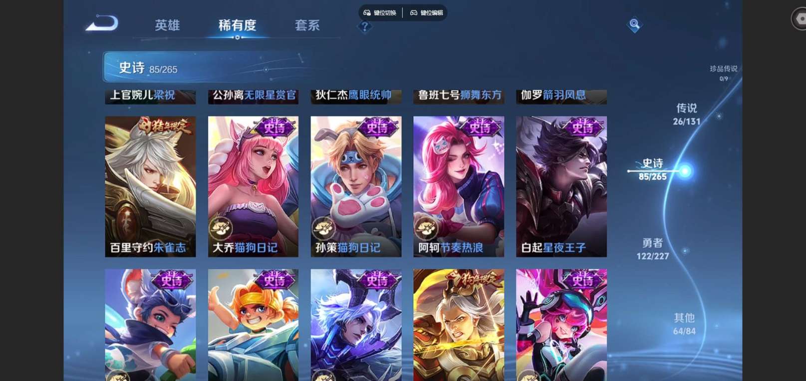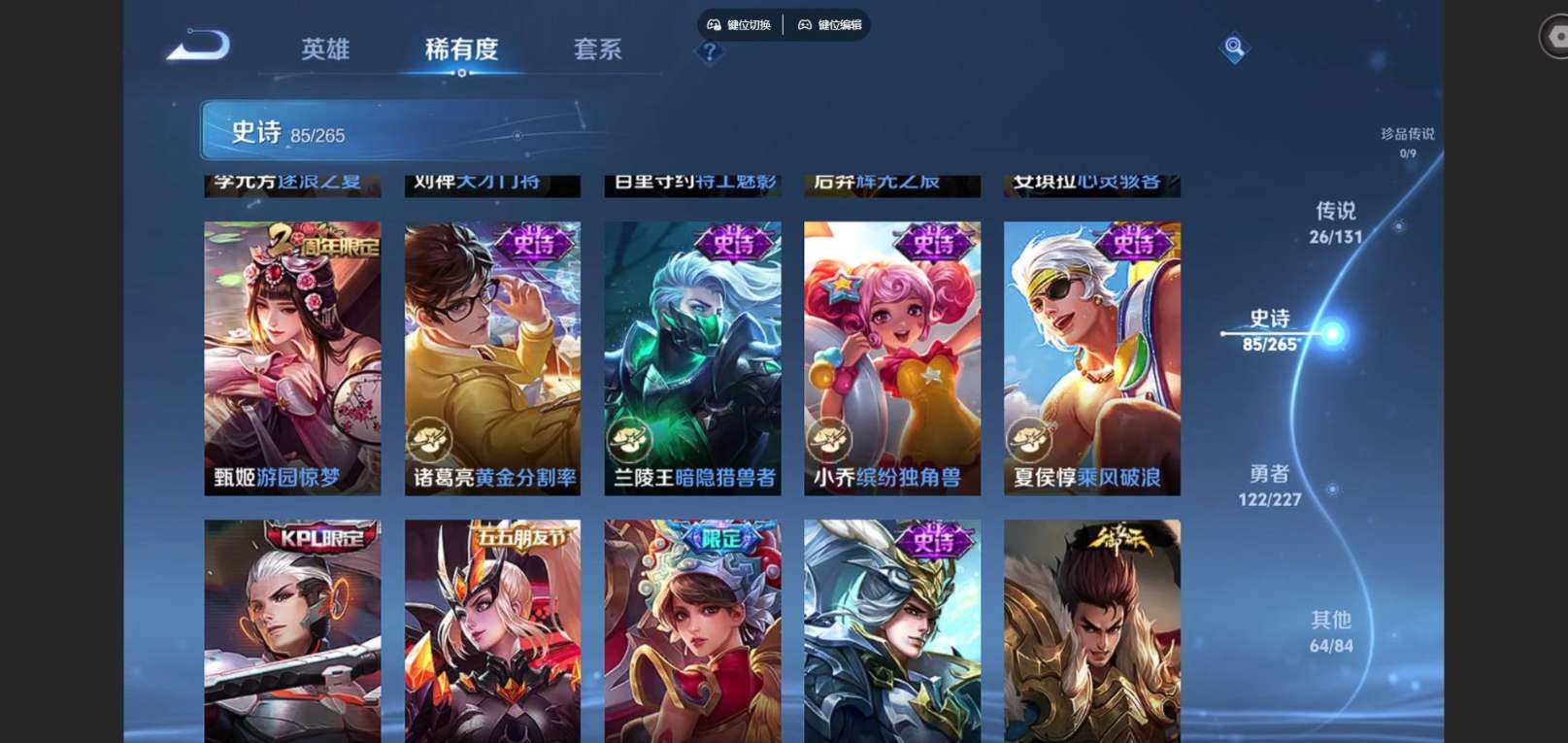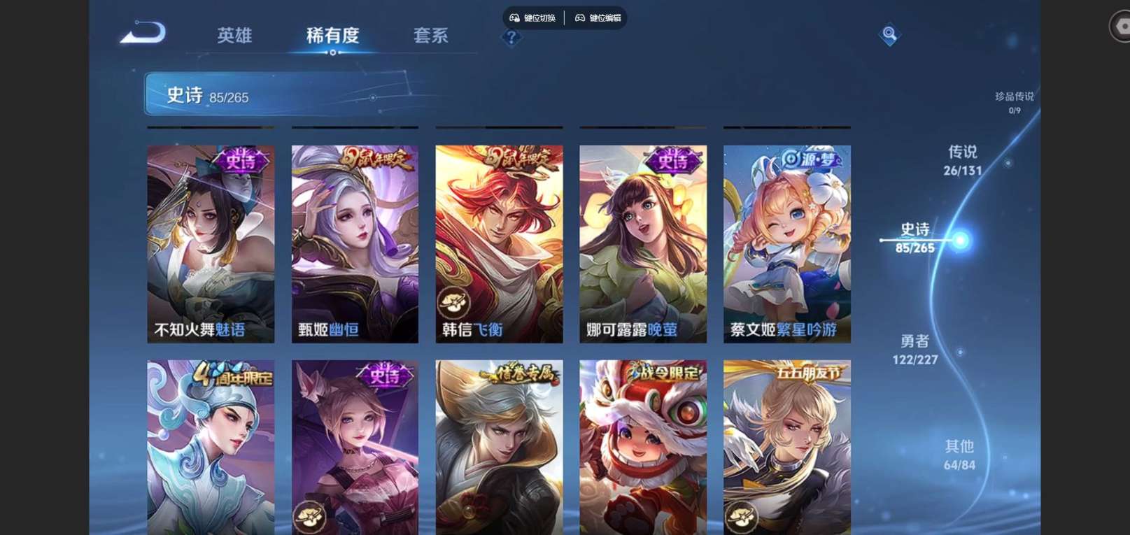 127英雄-300皮肤--V9-2典藏1无双26传说 发育路38段 打野37段 金标百里守约 阿古朵