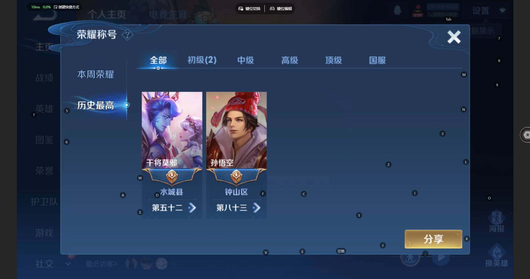 安卓Q-V7-最强王者段位-126英雄-201皮肤-8传说-66限定-2按键-5印记