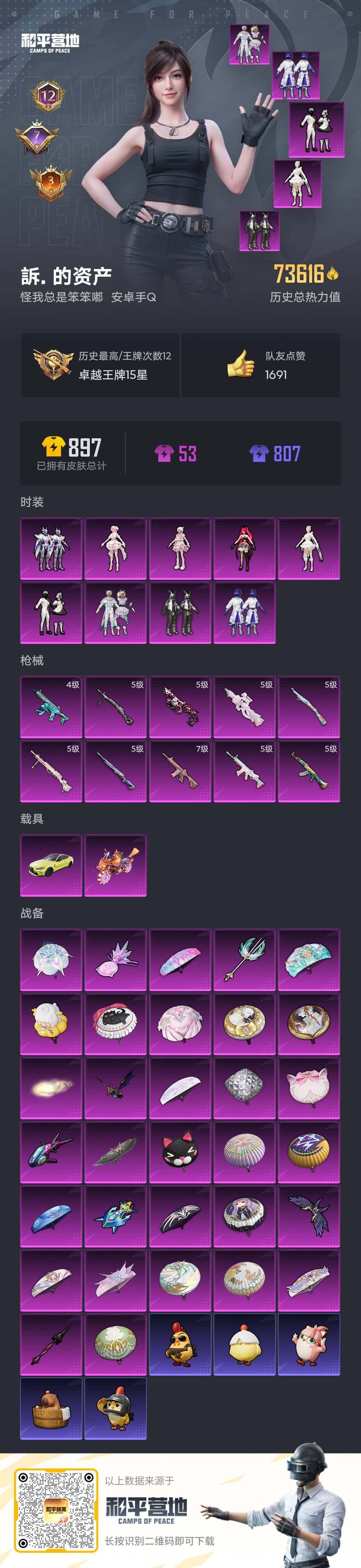 【店主推荐捡漏号!可直接换绑】安卓 手Q-9粉装-10特效枪-2载具-8粉色飞行器-73616热力值-12王牌印记-152套装-220枪皮【热门品类】:套装-浪漫天命,套装-深海小丑鱼,套装-小丑鱼,套装-动感兔斯基人偶服,套装-龟仙人,套装-暗影哥特,角色-8号机【粉色套装】:粉装-数码大师,粉装-新星烈龙,粉装-彩虹鹿灵,粉装-紫电风暴,粉装-冰川幽秘,角色-千金淑猫,角色-绯穹魔姬,角色-