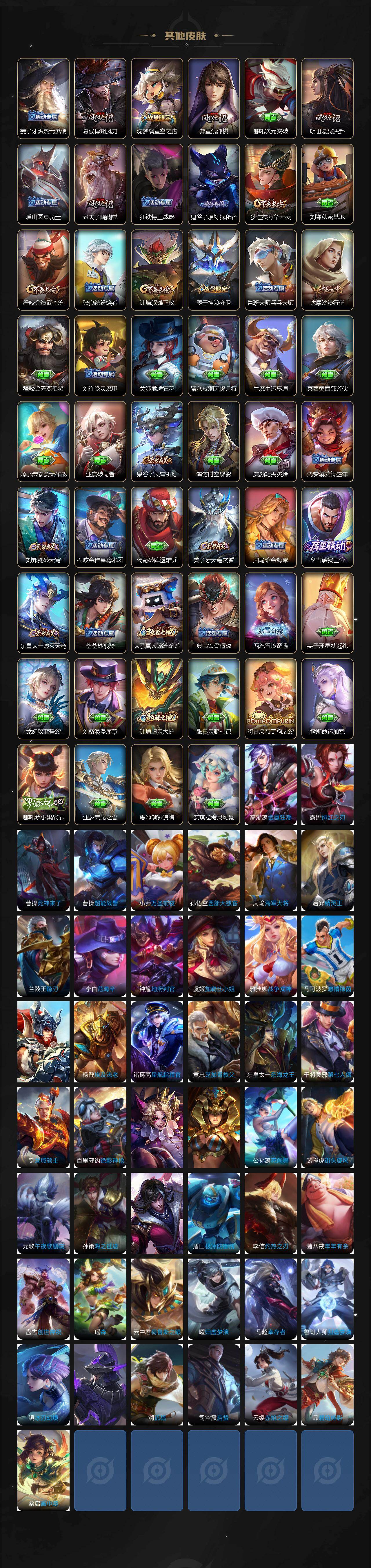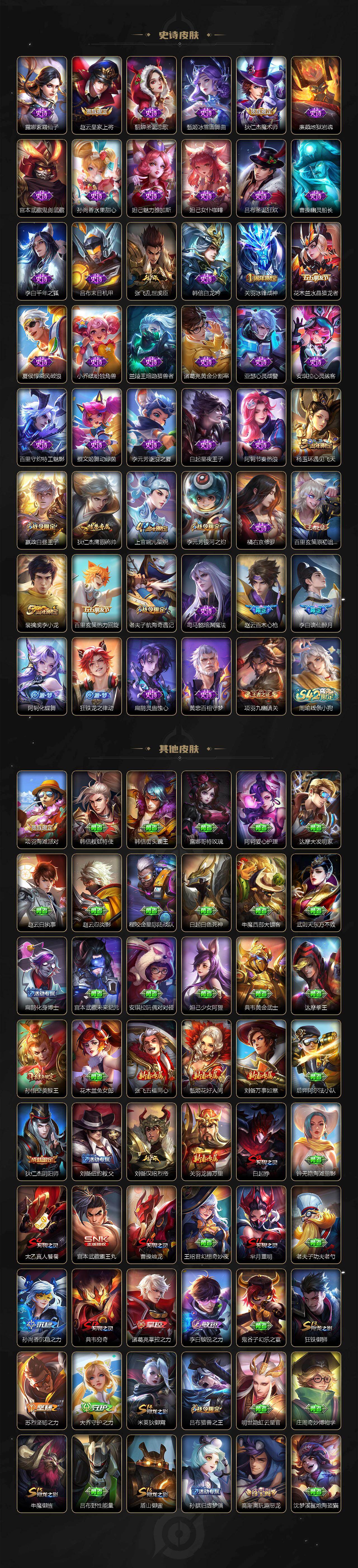 【传说皮肤】:裴擒虎祥瑞亨通,桑启鸣野蒿,典韦战鼓燎原,马超无双飞将,虞姬启明星使,李信一念神魔,干将莫邪久胜战神,后羿黄金射手座,李白凤求凰,宫本武藏地狱之眼,孙悟空地狱火