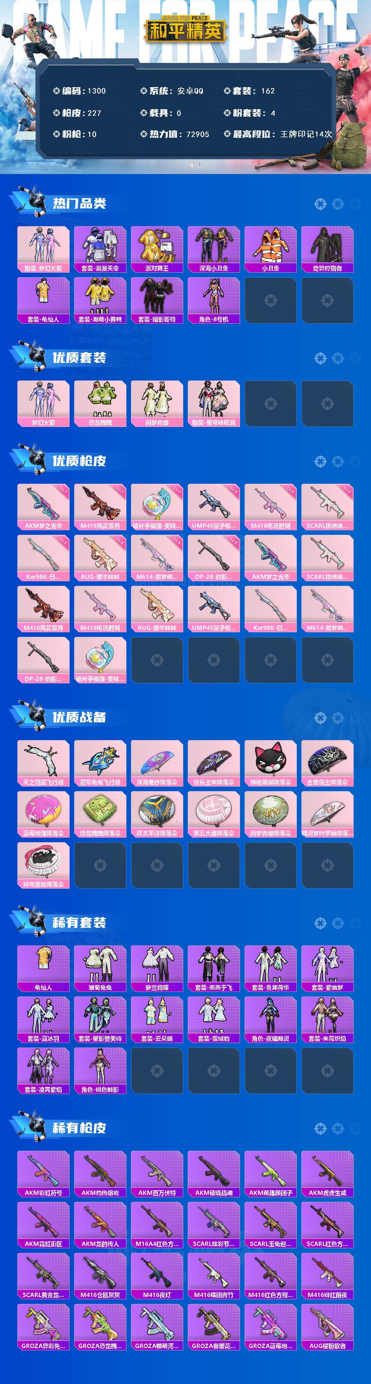 安卓 手Q-4粉装-10特效枪-0载具-3粉色飞行器-72905热力值-14王牌印记-162套装-227枪皮
