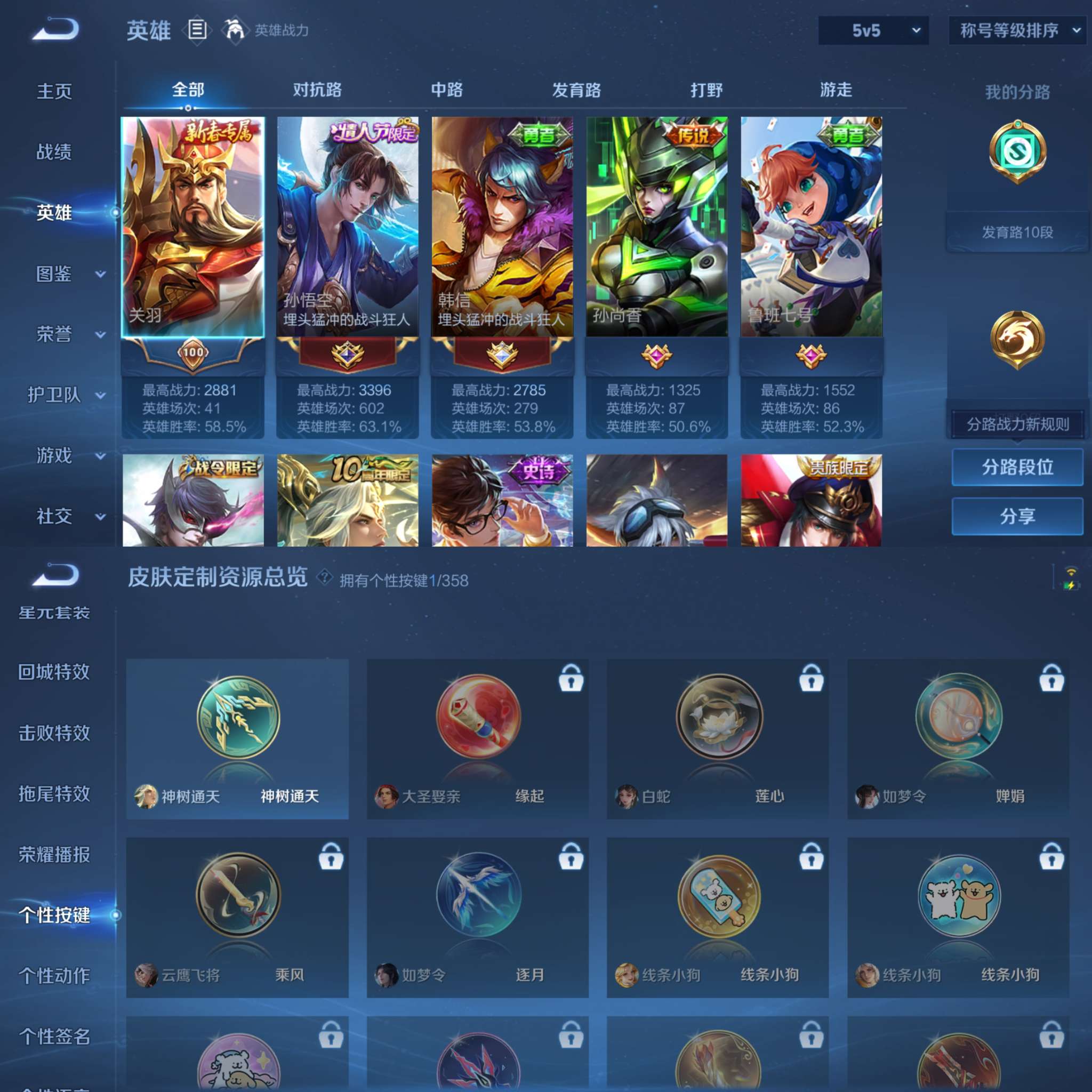铜标关羽1按键 韩信星元皮 至尊宝 飞衡 神树通天 地狱火 末日机甲女 冰冠公主 暗影游猎 死神