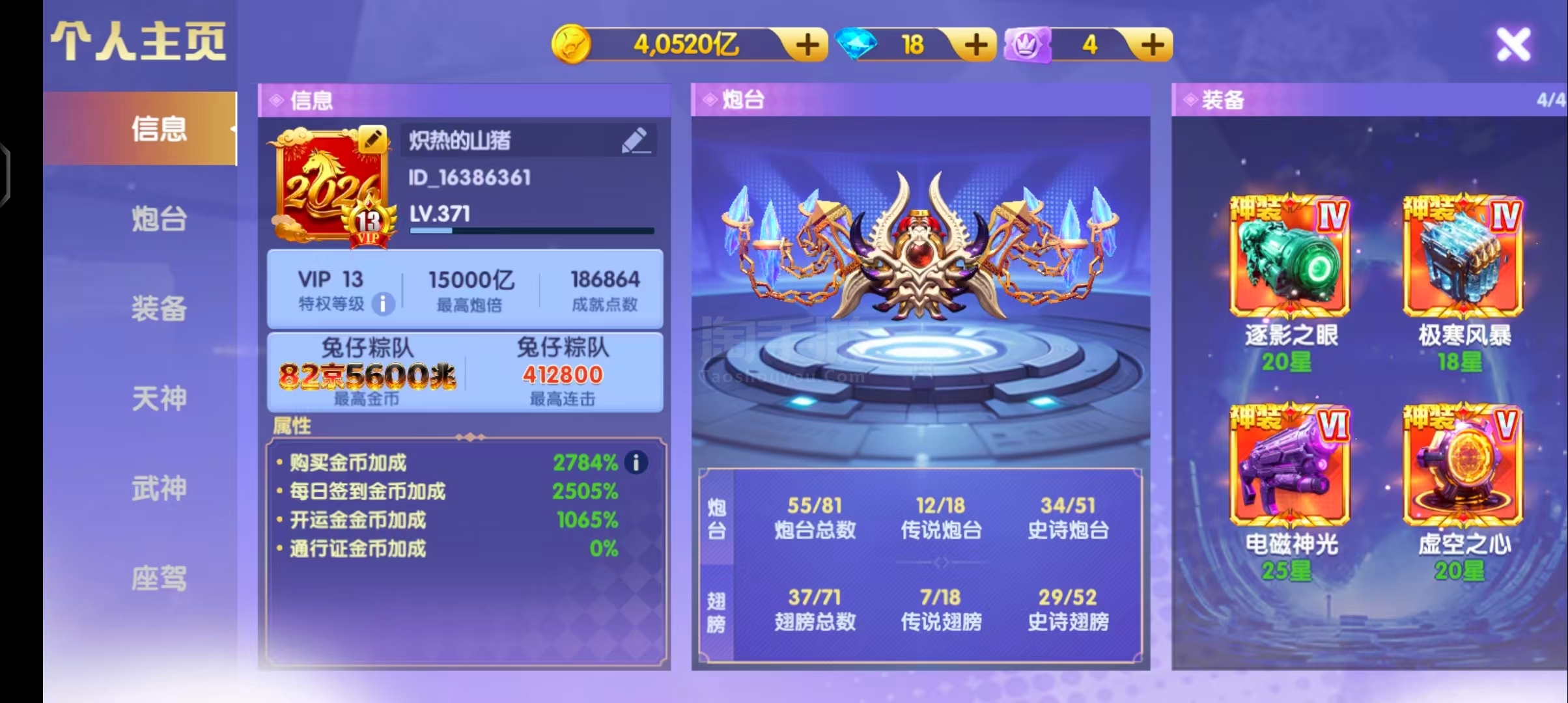 安卓vivo v13 2784加成 1.5万炮倍 11天神 30武神 8座驾