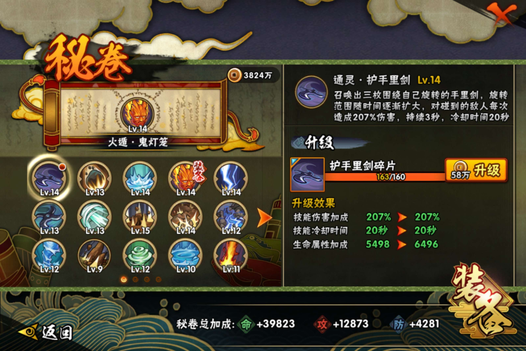 【S级忍者】宇智波带土「忍界大战」(3星),宇智波斑「木叶创立」(3星),迈特凯「死门」(3星),宇智波佐助「永恒万花筒」(3星),艾「忍界大战」(3星),波风水门「九喇嘛连结」(3星),自来也「舞之豪杰」(3星),宇智波鼬「须佐能乎」(3星),佩恩「天道」(3星)