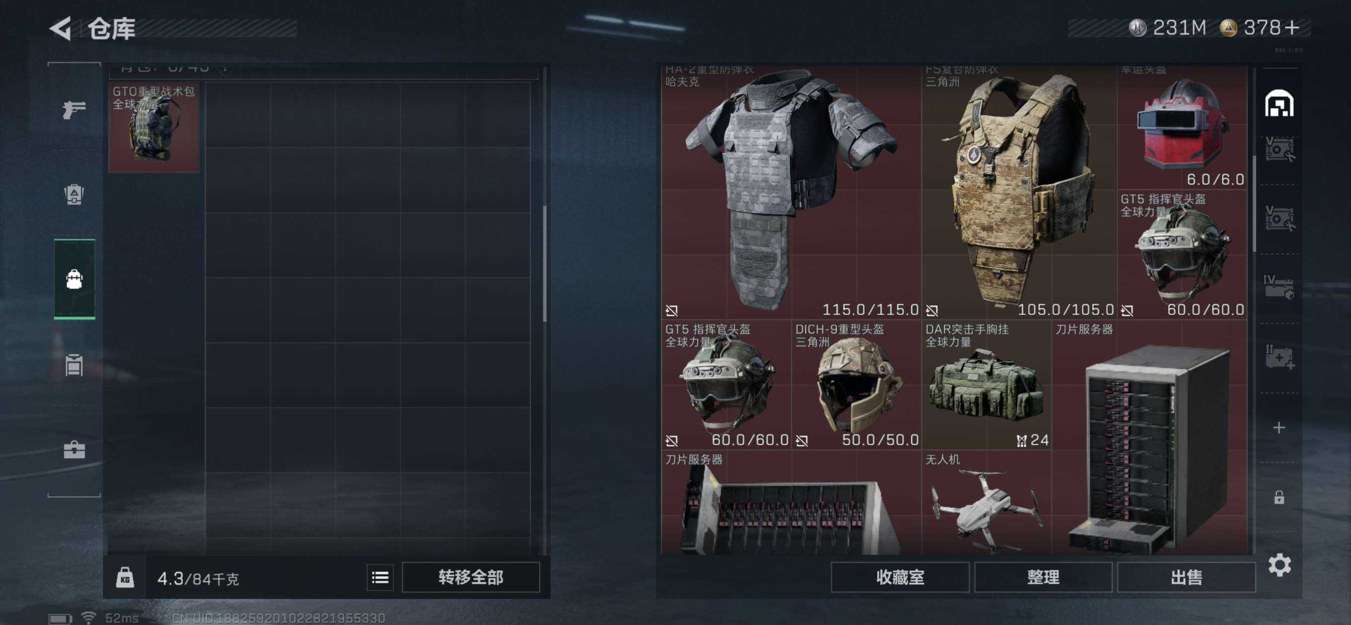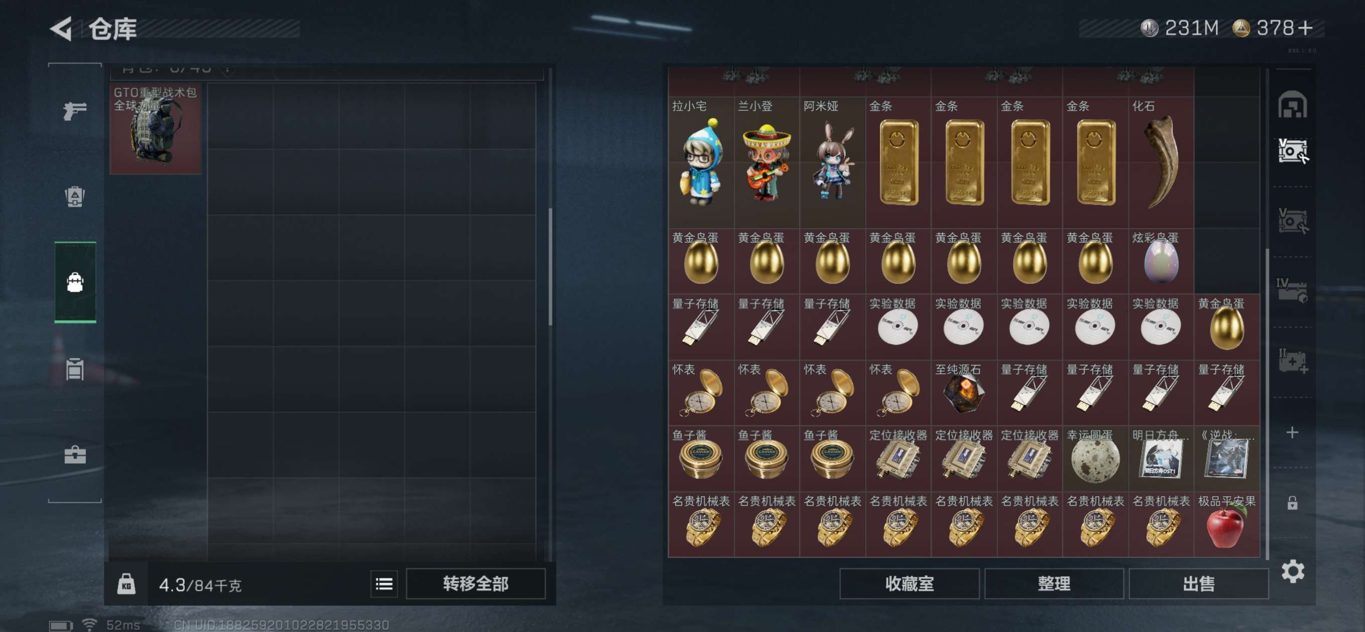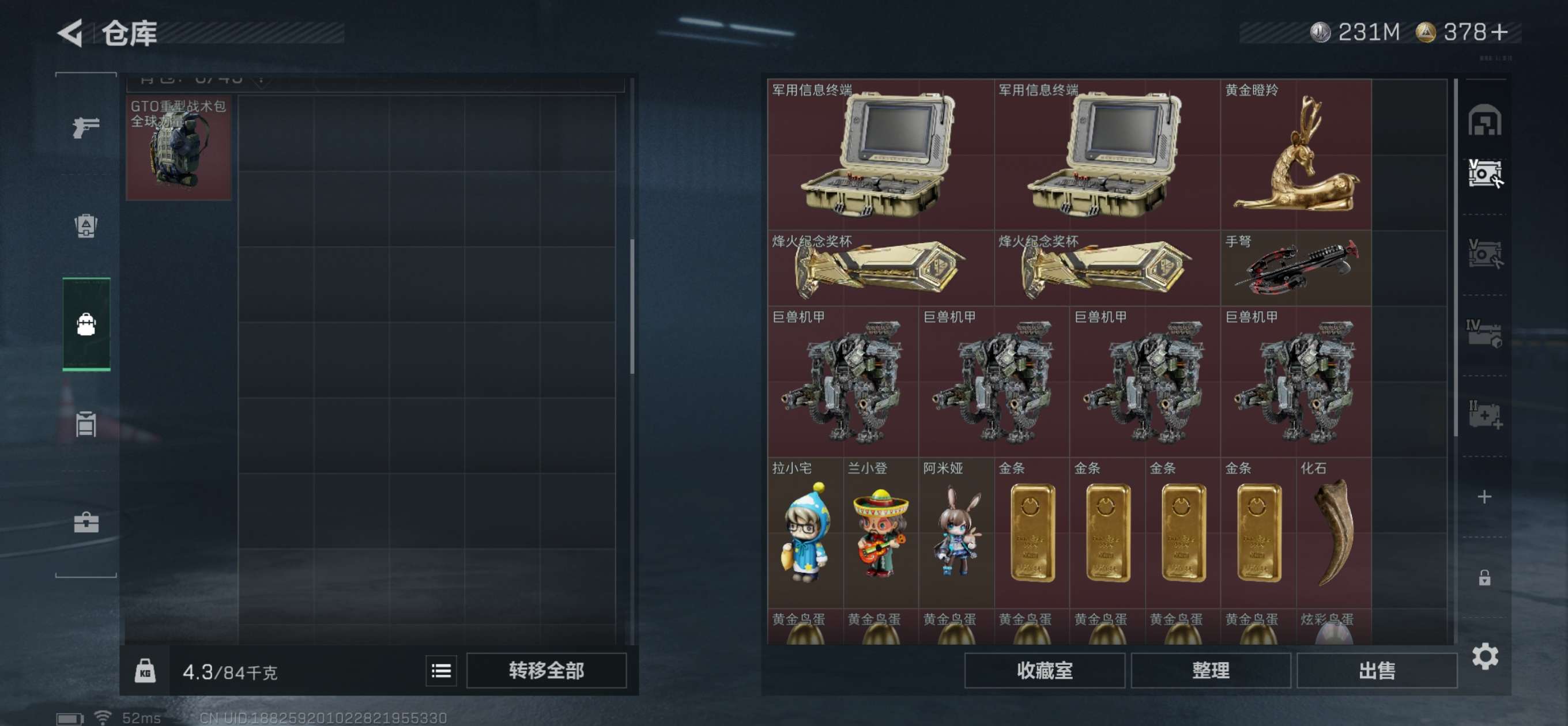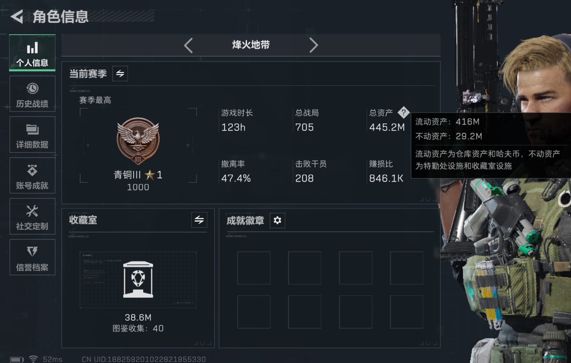 总资产445M。纯币230M还有6个6甲4个6头,20发AW