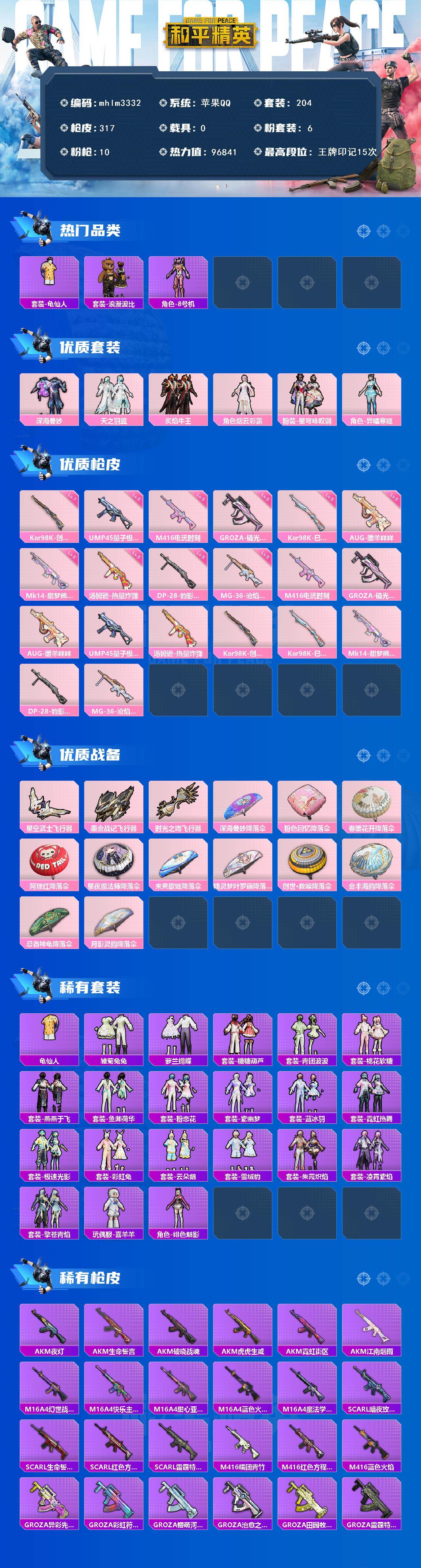 【mhlm3332】苹果 手Q-6粉装-10特效枪-0载具-4粉色飞行器-96841热力值-15王牌印记-204套装-317枪皮