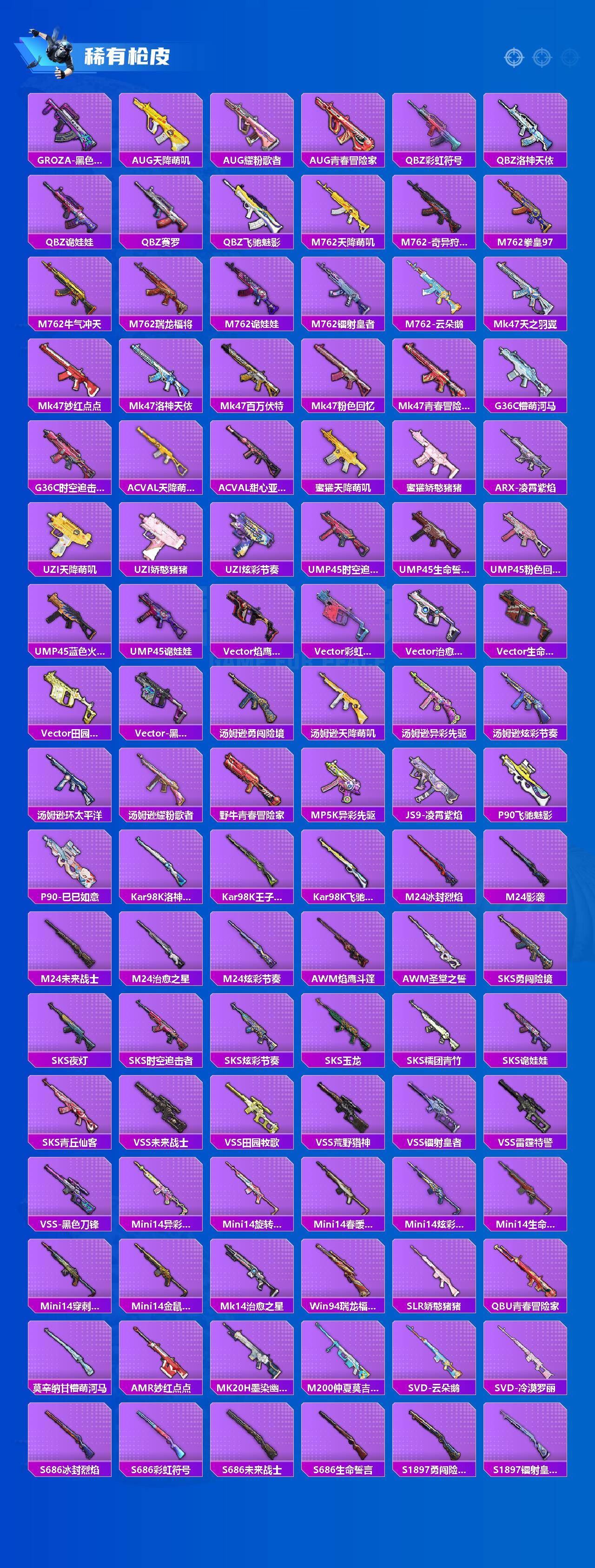 【粉色枪皮等级】:M416-电玩时刻(五级),GROZA-镜光银凌(五级),AUG-暖羊咩咩(五级