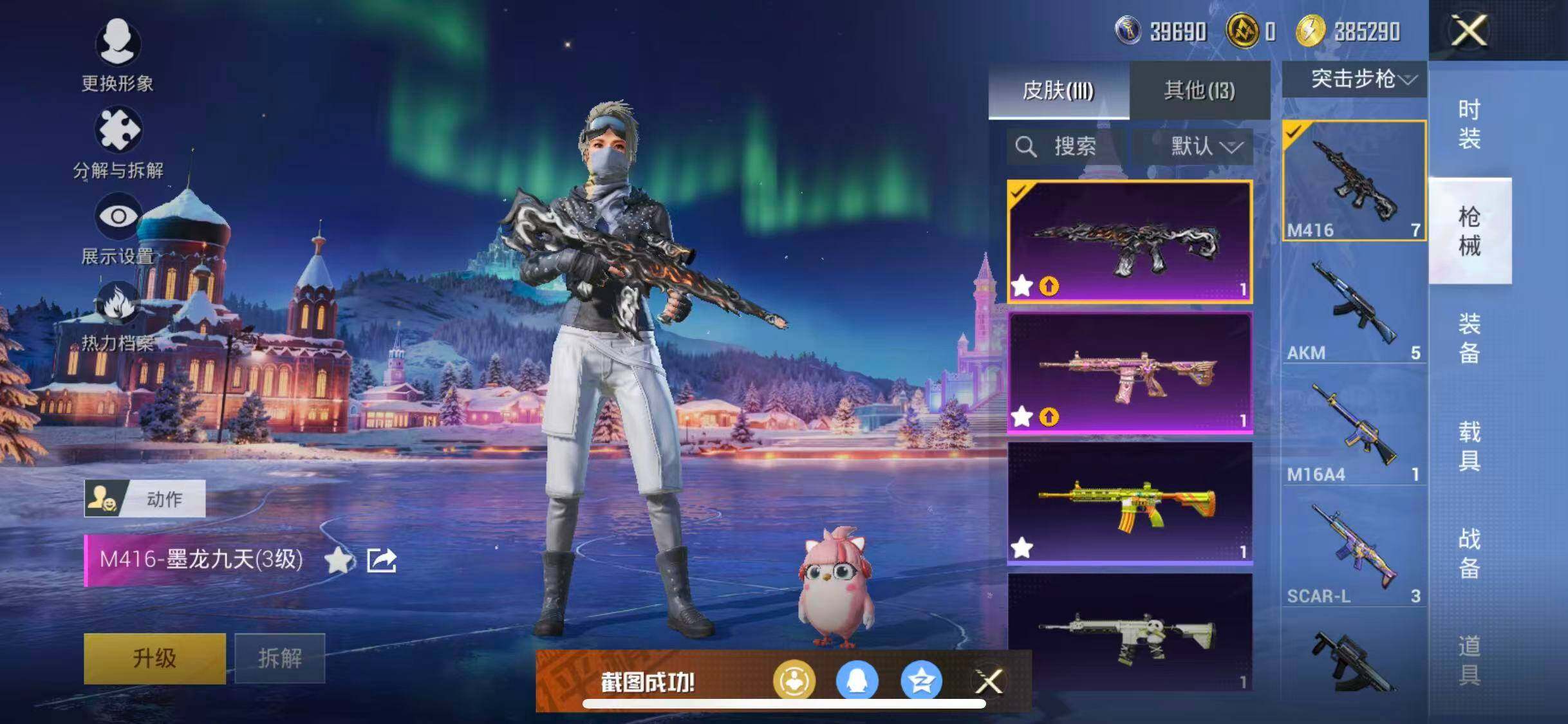 【粉色枪皮等级】:M416-心之恋语(六级),M416-墨龙九天(三级),Kar98K-巳巳如意(五级)