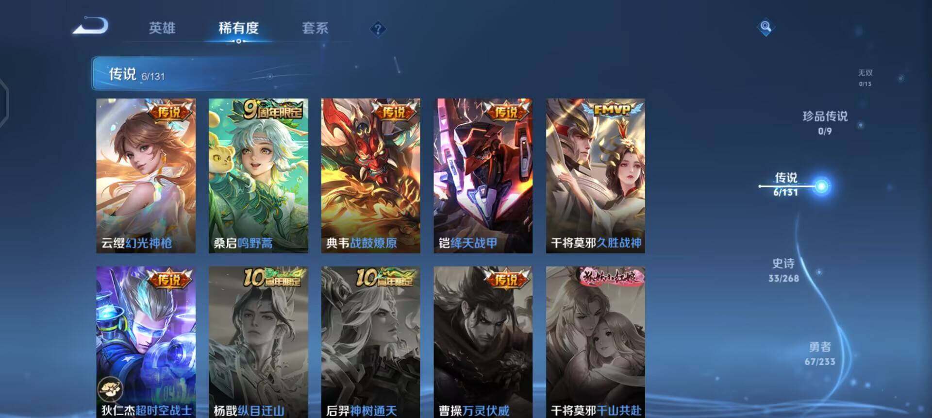 【传说皮肤】:云缨幻光神枪,桑启鸣野蒿,典韦战鼓燎原,铠绛天战甲,干将莫邪久胜战神,狄仁杰超时空战士
