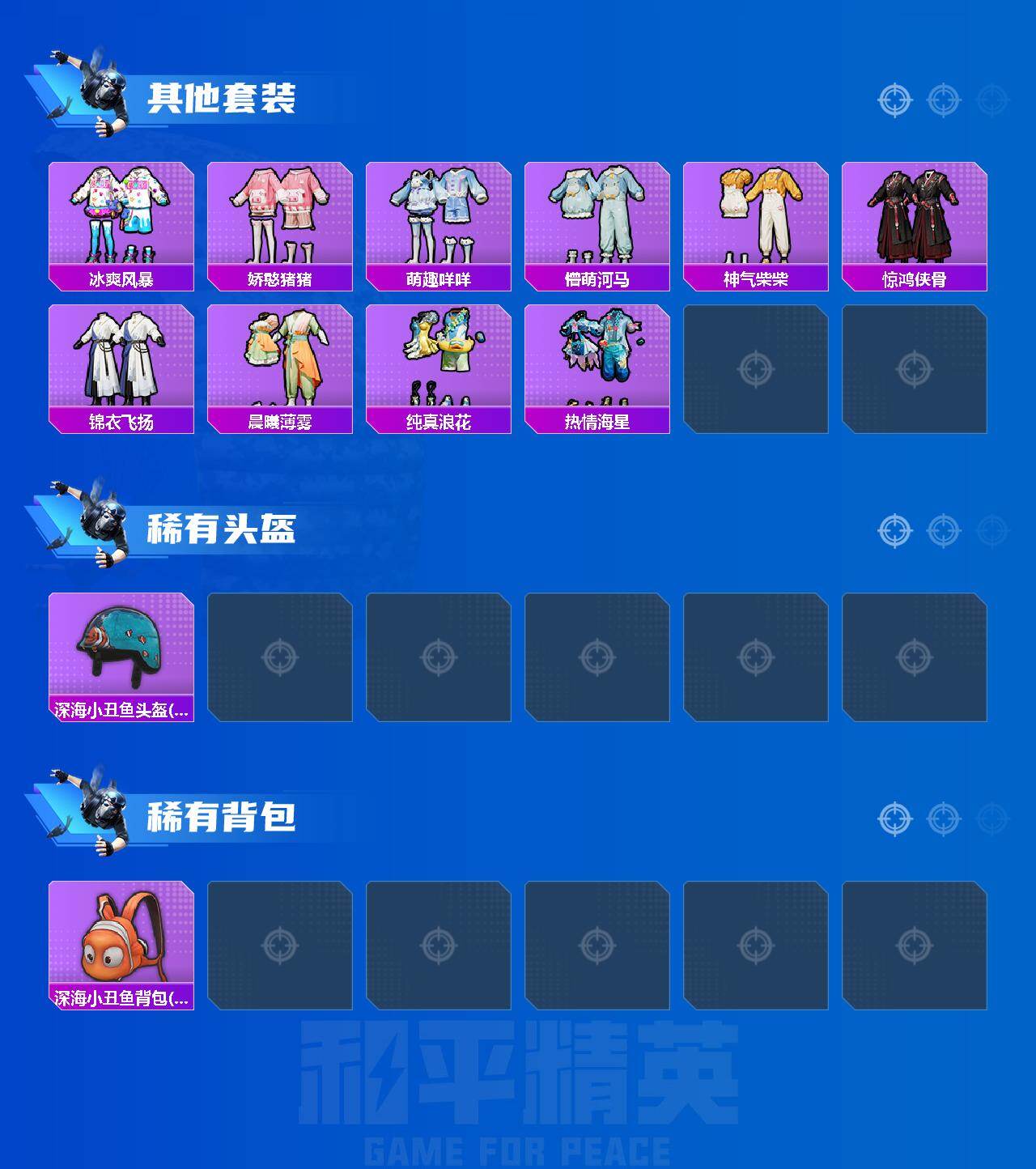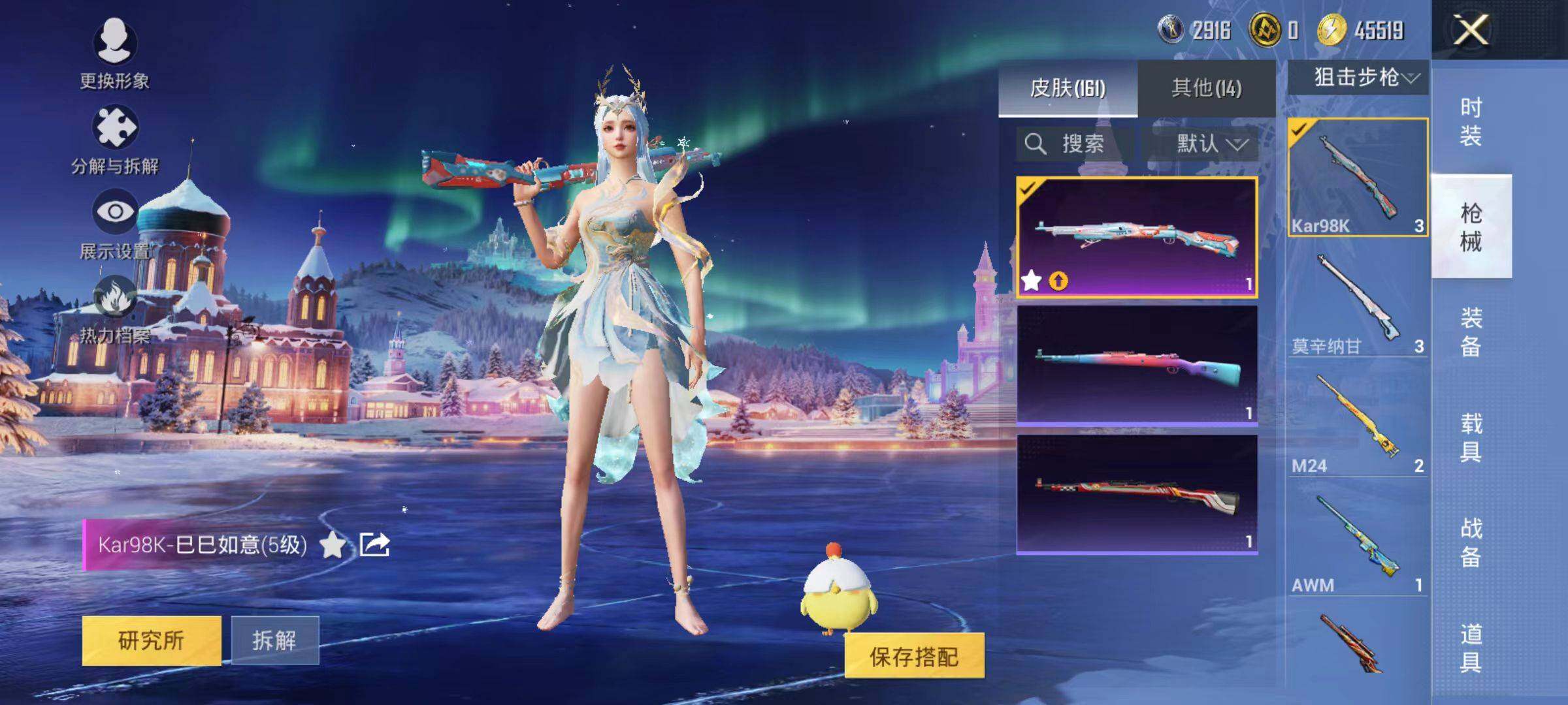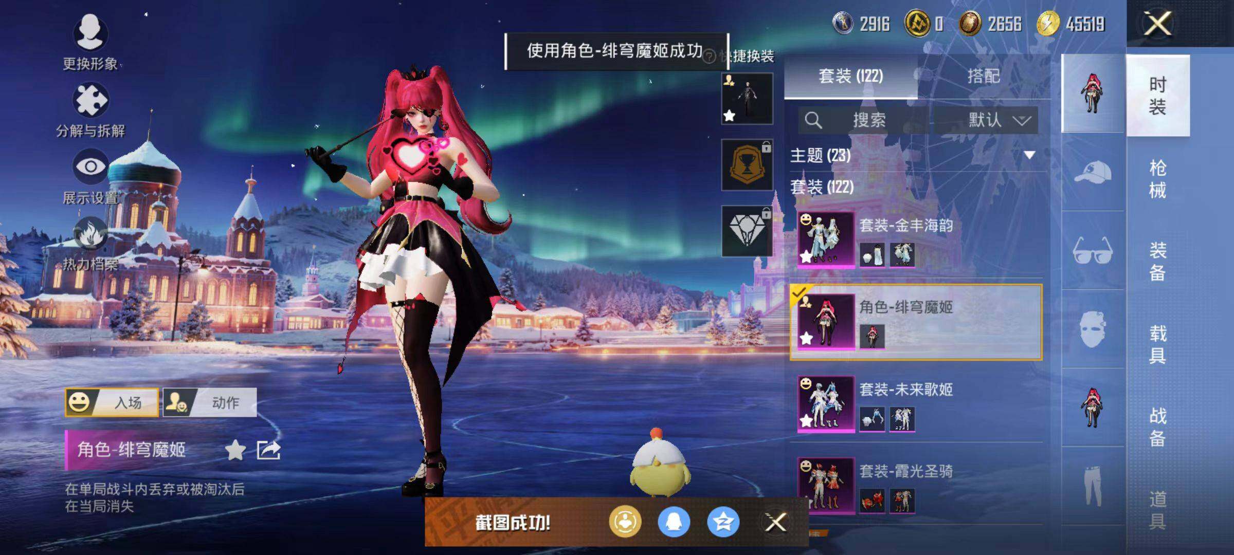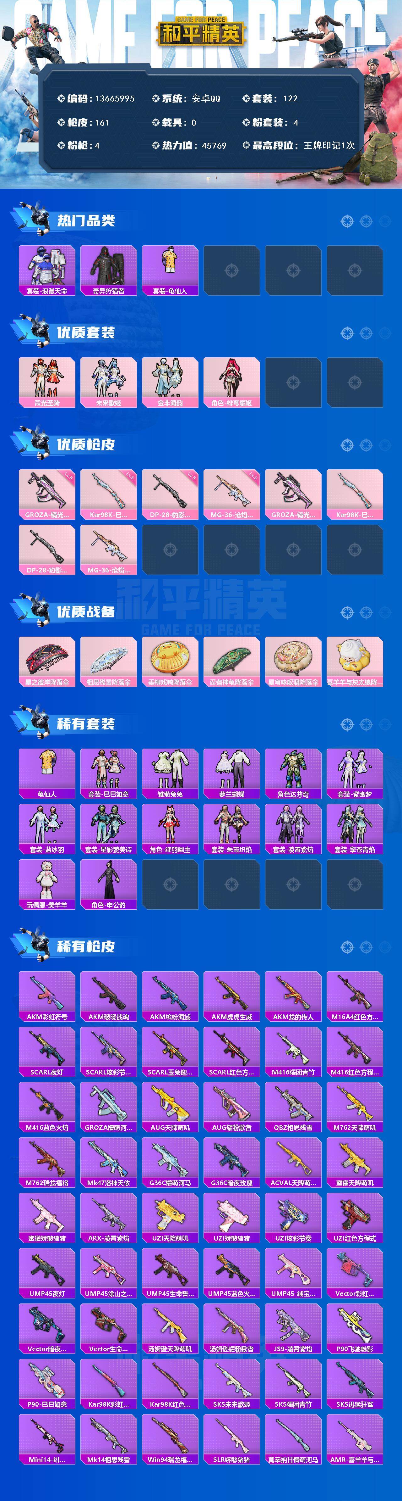122套装/枪械4/装备162/战备118/王牌印记1/热力值45769/五级GROZA-镜光银凌/五级Kar98K-巳巳如意/五级DP-28-豹影疾电/五级MG-36-沧焰双生/套装-浪漫天命/奇异狩猎者/套装-龟仙人/霞光圣骑/未来歌姬/金丰海韵/角色-绯穹魔姬/GROZA-镜光银凌/Kar98K-巳巳如意/DP-28-豹影疾电/MG-36-沧焰双生/星之彼岸降落伞/相思残雪降落伞/垂柳戏鸭