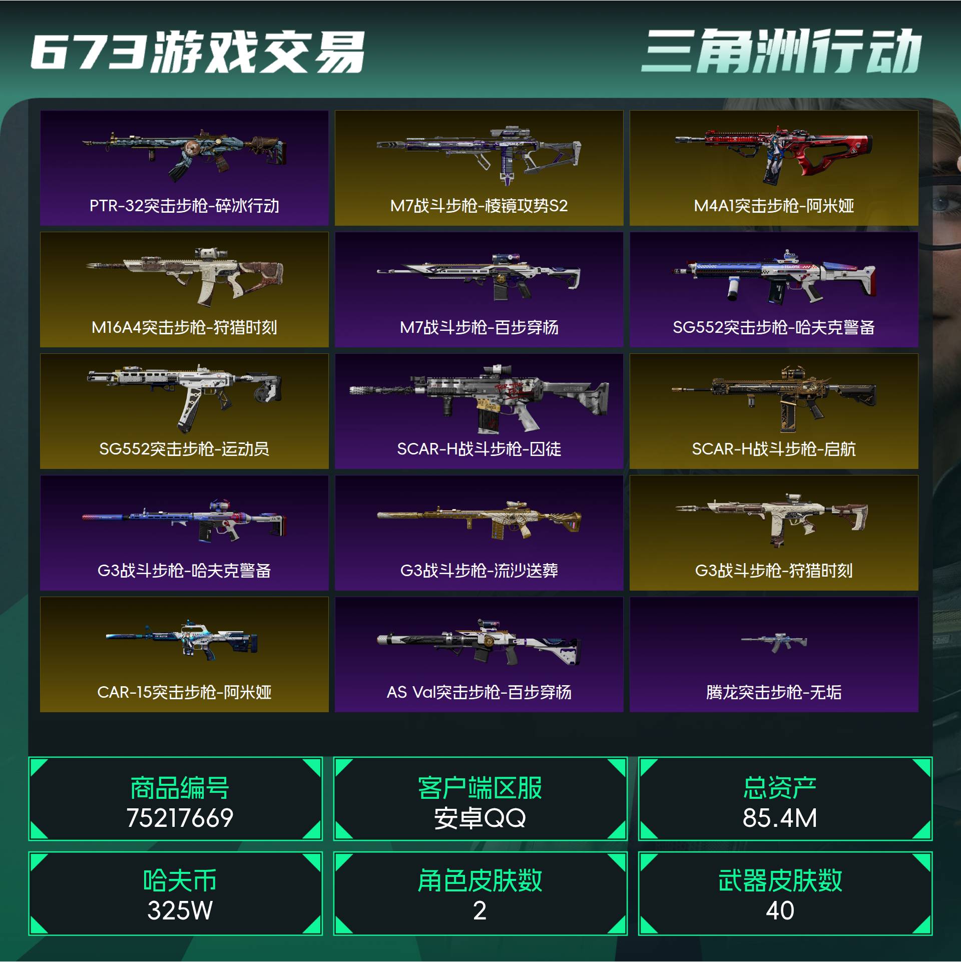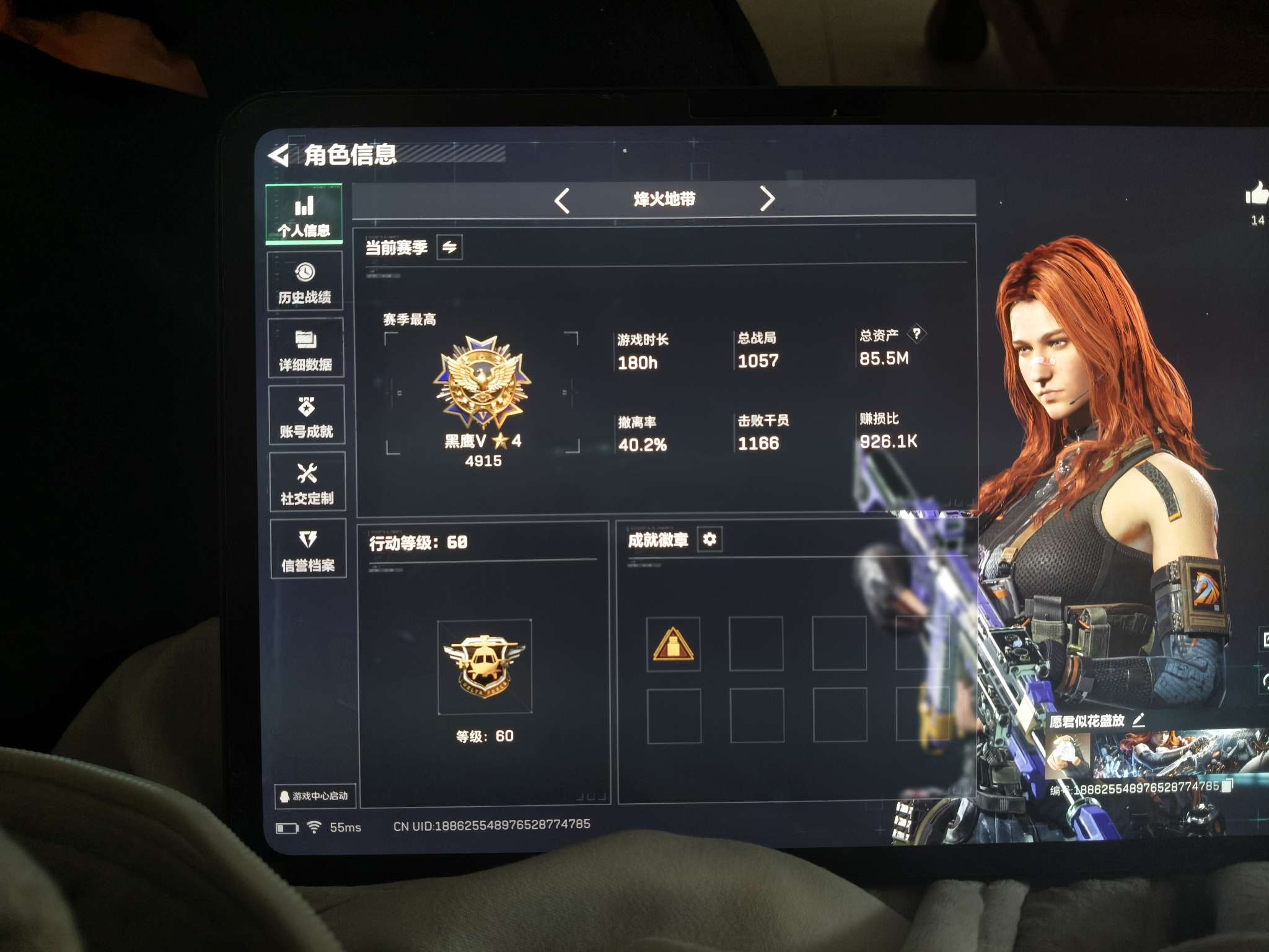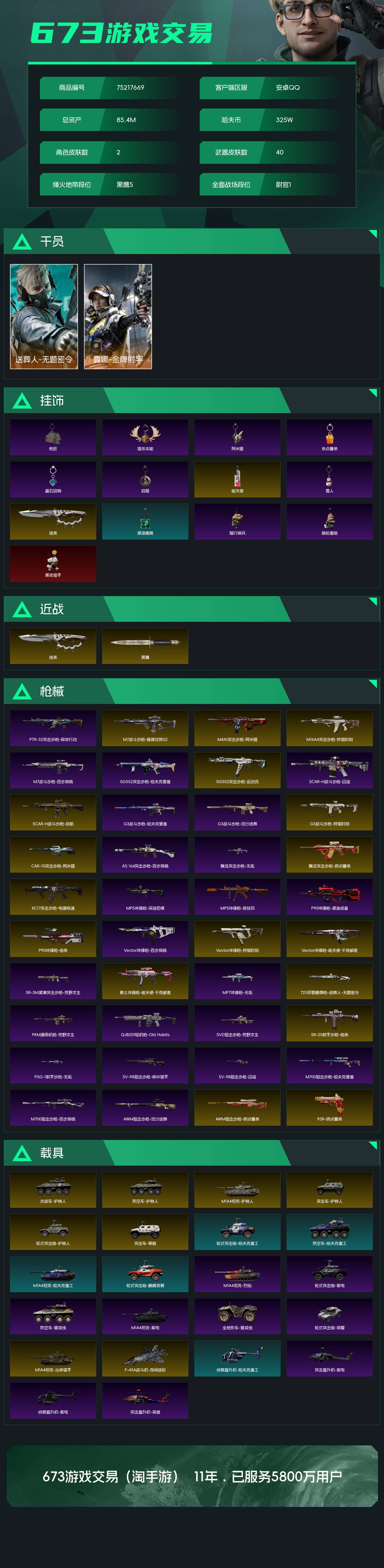 烽火段位黑鹰5 战场段位尉官1 总资产85.4M 哈夫币325W 干员2 挂饰13 近战2 枪械40 载具22