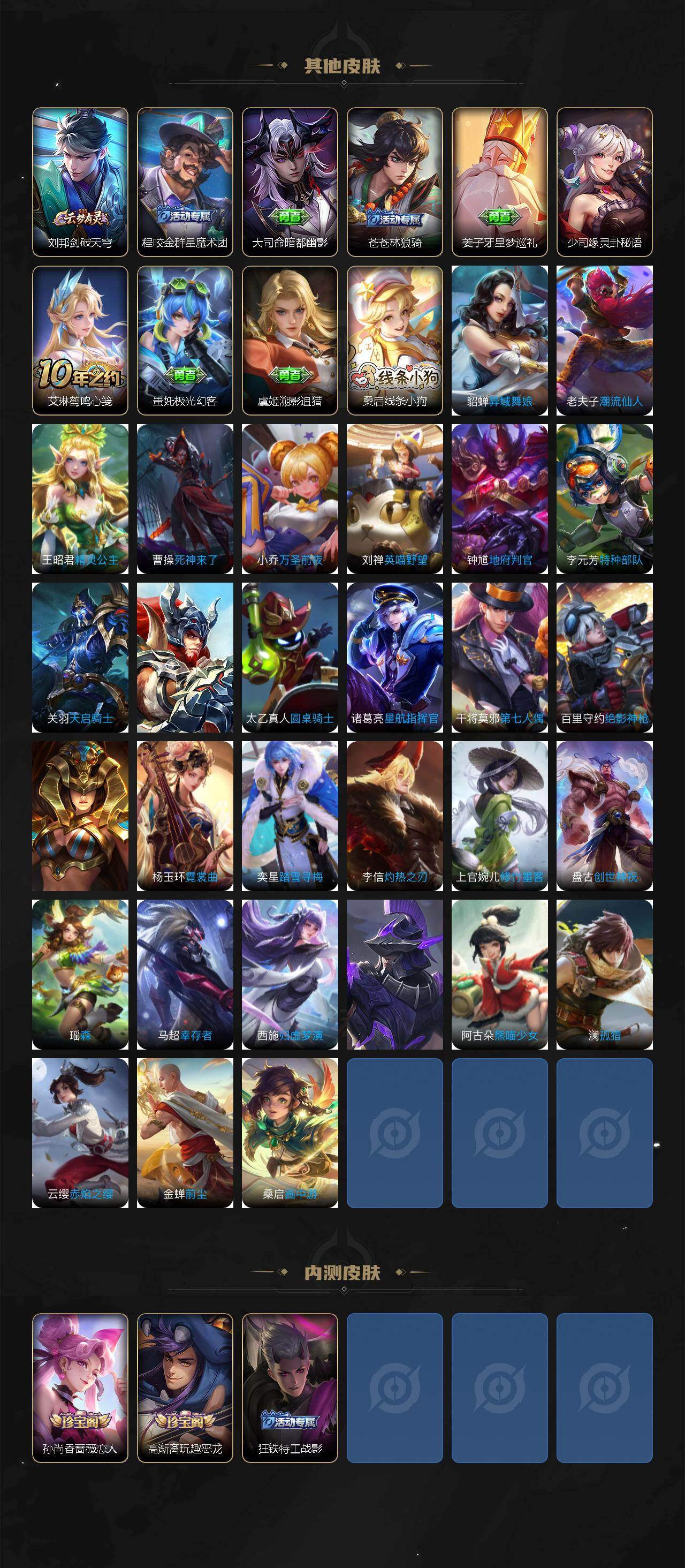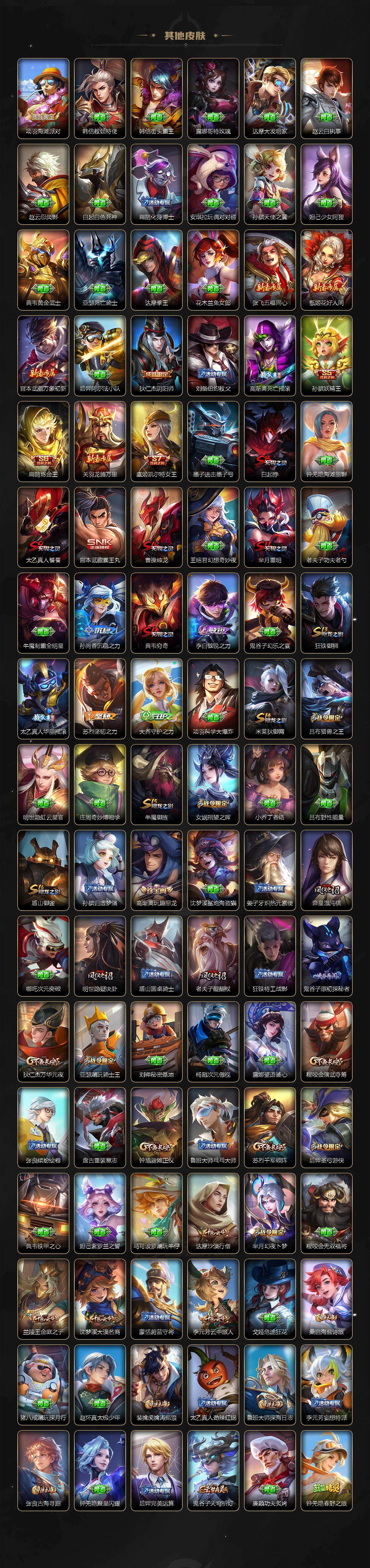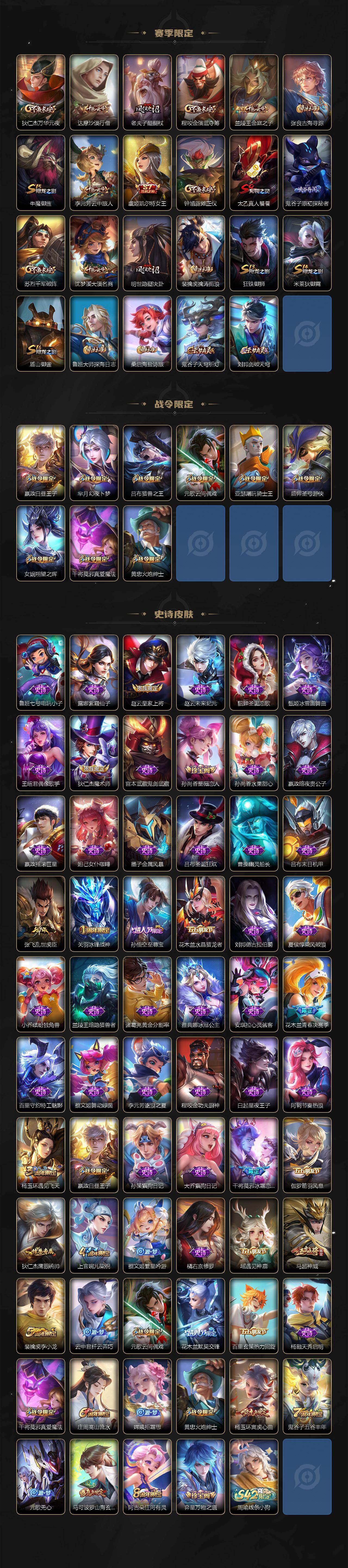 【限定皮肤】:白起狰,狄仁杰阴阳师,虞姬凯尔特女王,赵云皇家上将,嬴政白昼王