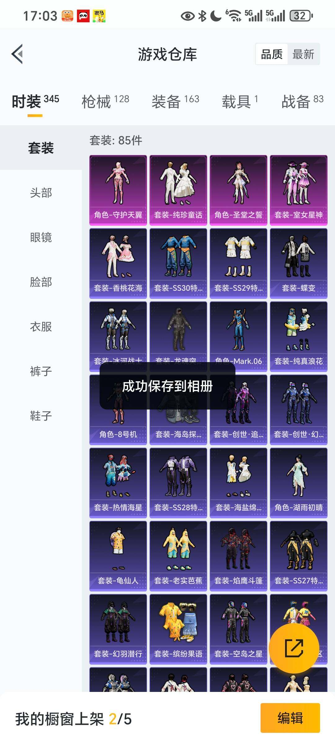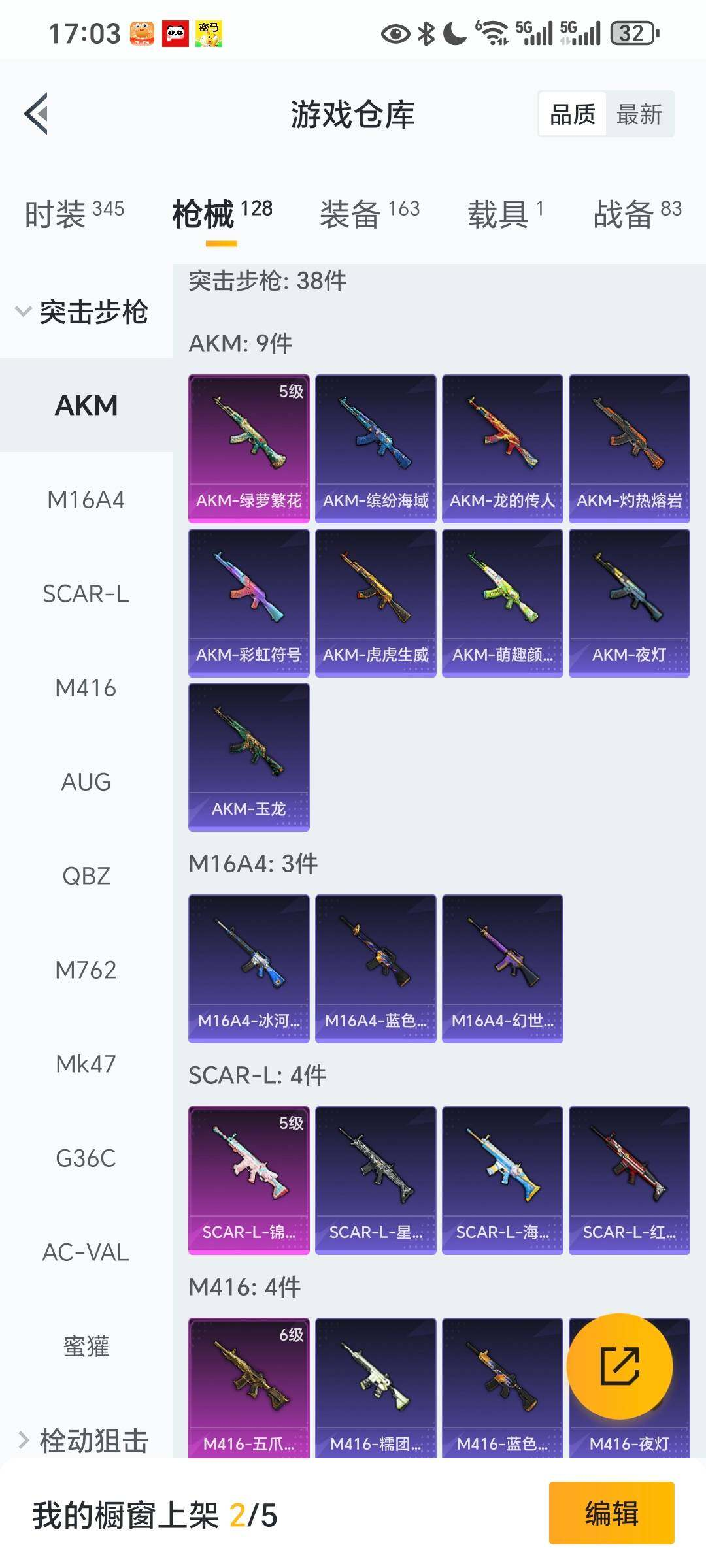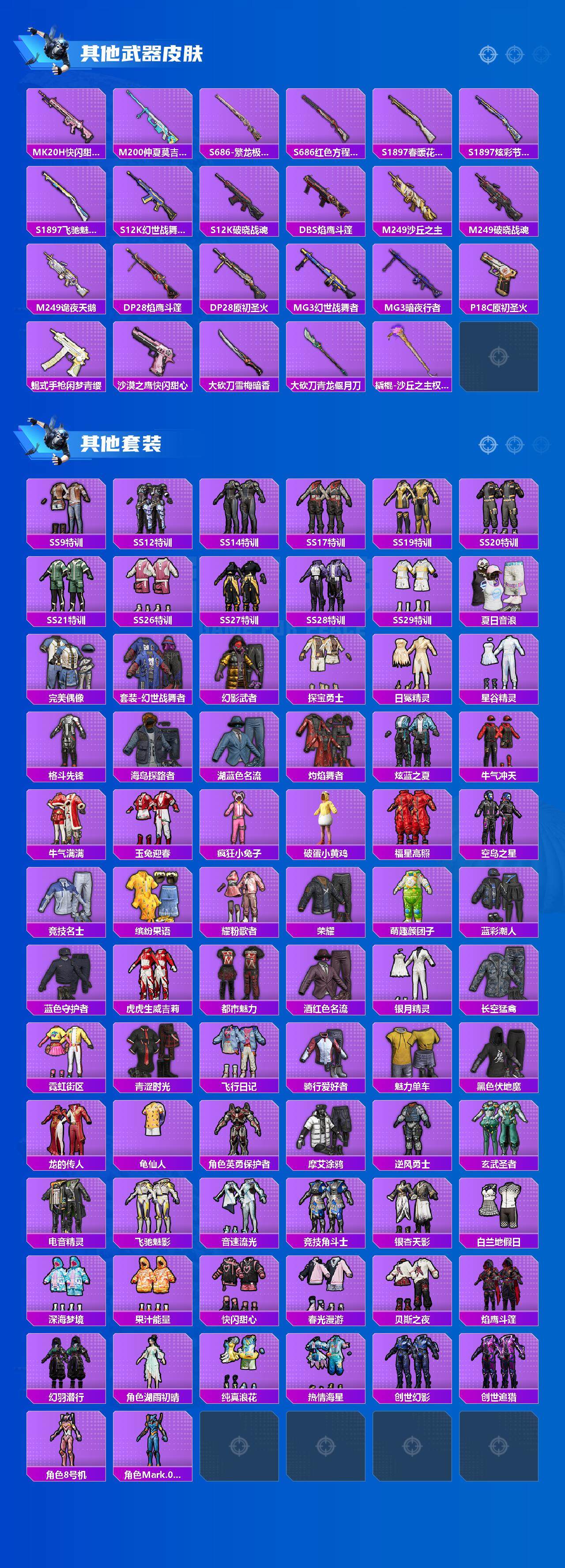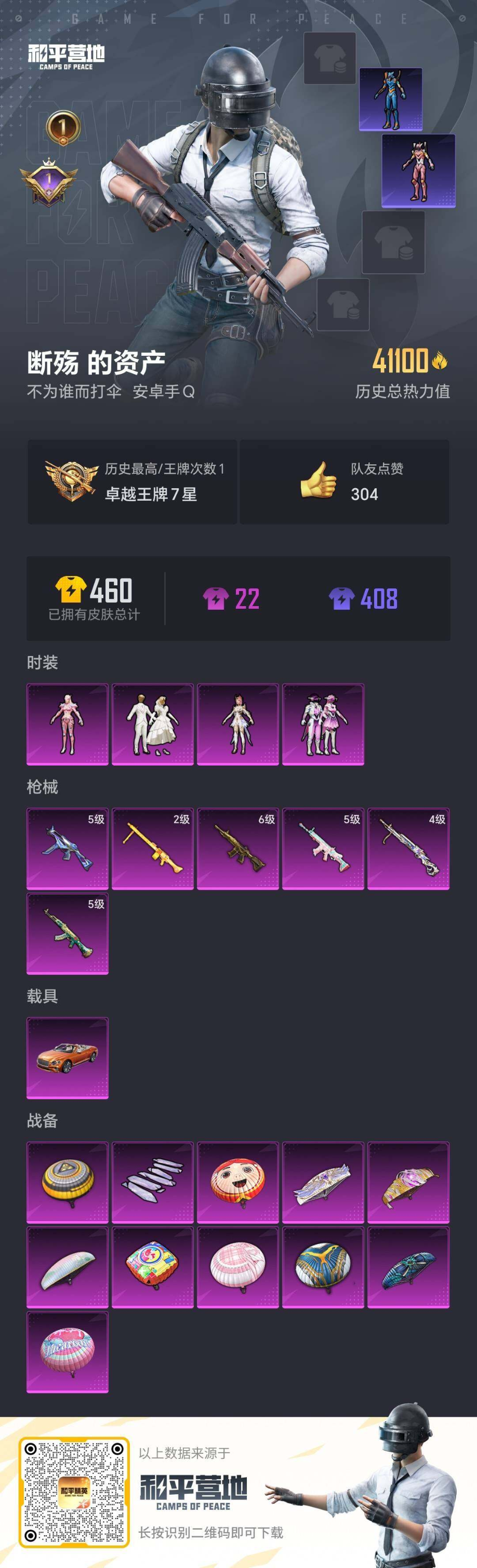 85套装/枪械6/装备163/载具1/战备87/王牌印记1/热力值41100/五级AKM-绿萝繁花/五级SCAR-L-锦绣绵绵/六级M416-五爪金龙/五级UMP45-量子极限/四级DP-28-圣堂之誓/二级MG3-酷泡奶龙/旭日初心兜帽大衣/套装-龟仙人/角色-8号机/角色-Mark.06/大砍刀-青龙偃月/纯珍童话/室女星神/圣堂之誓/守护天翼/宾利欧陆GT敞篷(火焰橘)/AKM-绿萝繁华/