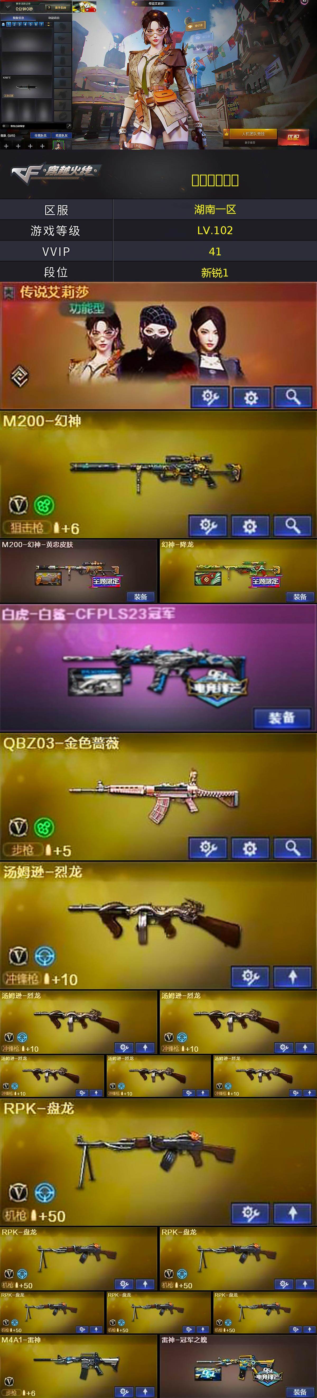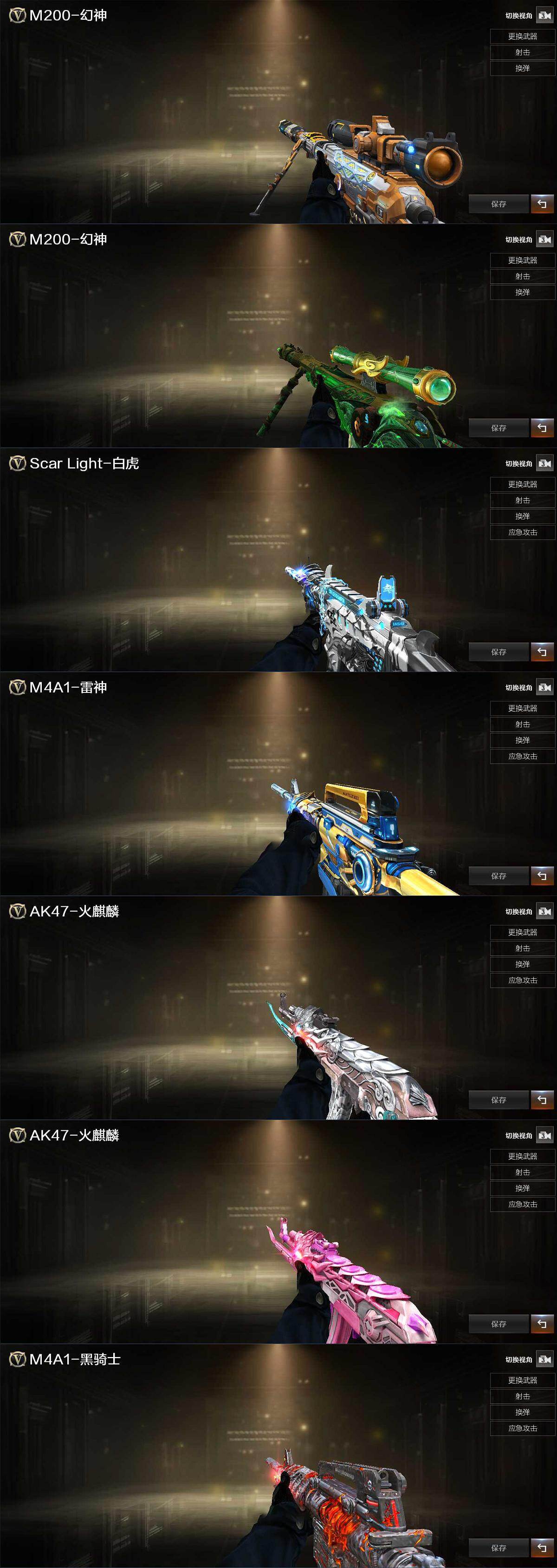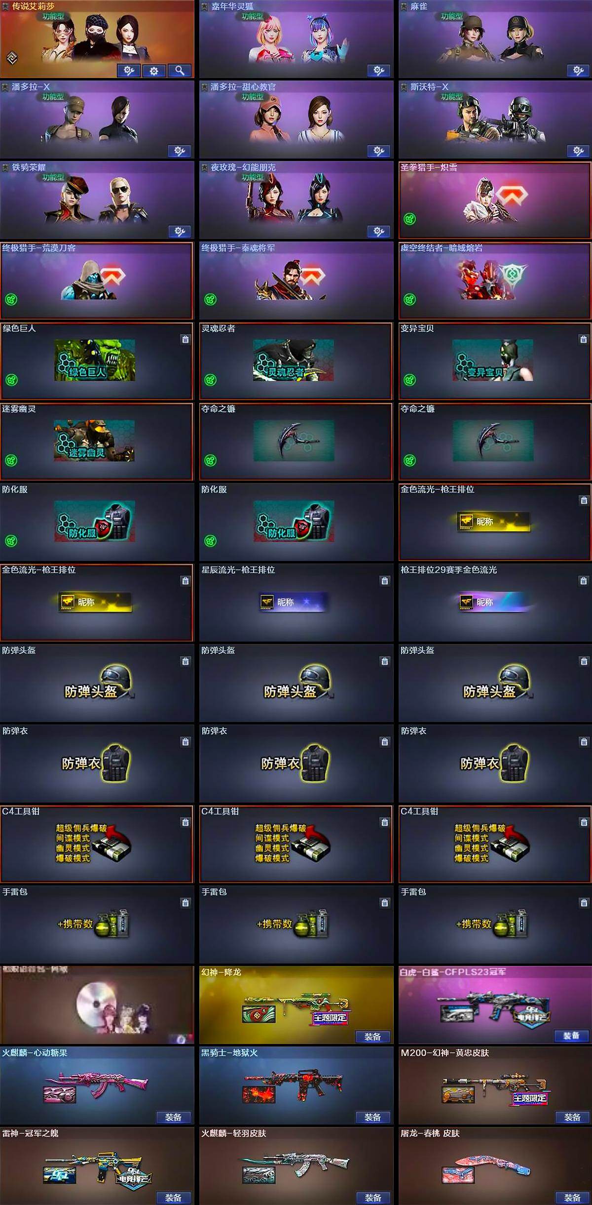 【皮肤】:M200-幻神-黄忠皮肤,幻神-降龙,白虎-白鲨-CFPLS23冠军,雷神-冠军之魄,火麒麟-轻羽皮肤,火麒麟-心动糖果,黑骑士-地狱火,屠龙