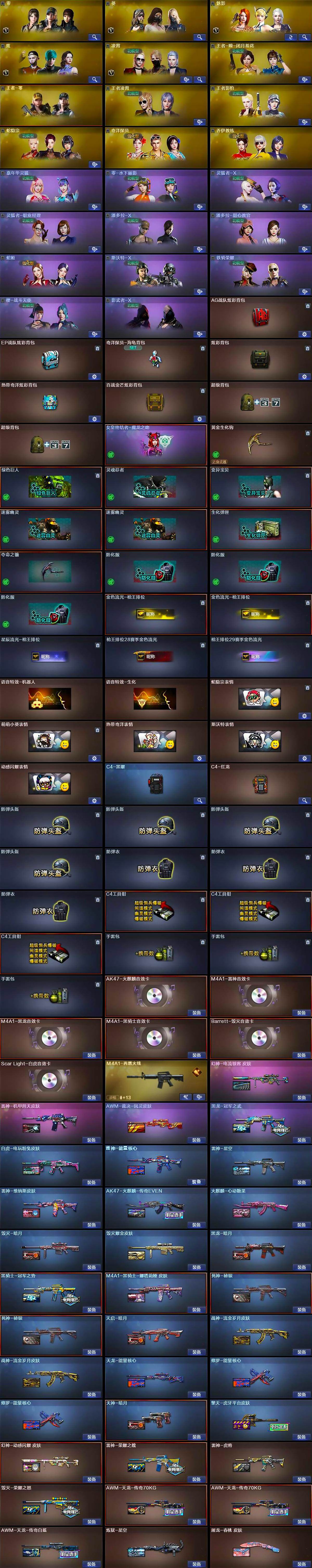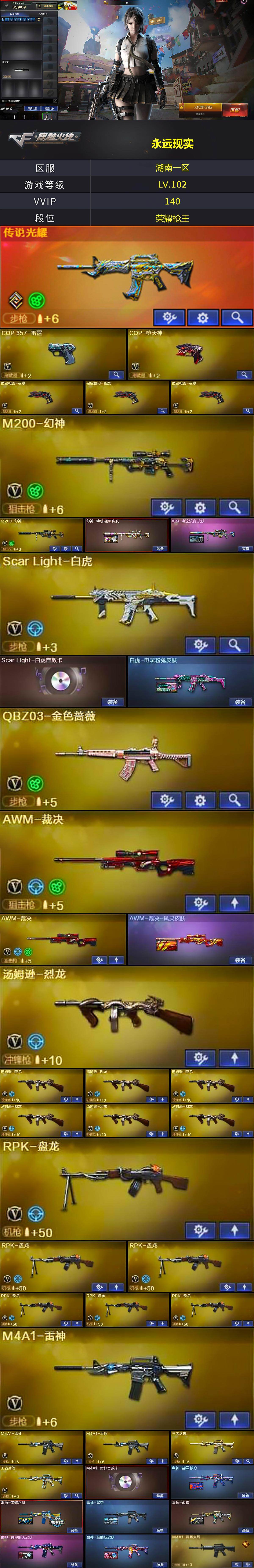 【热门武器】:传说光耀,QBZ03-金色蔷薇,Scar Light-白虎,HK417-朱雀,M4A1-青龙,M200-幻神*2,死亡之眼,金色小号,Cat-刀锋,毒蜂,M4A1-黑骑士*4,汤姆逊-烈龙*7,RPK-盘龙*6,加特林-炼狱*2,降世魔童,COP-堕天神,沙鹰-修罗*4,COP 357-极地霜雄