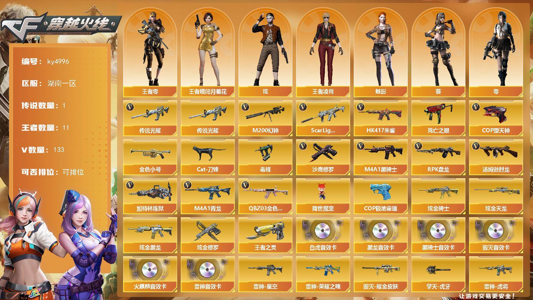 湖南一区-133V-11王者-7炫金【传说武器】:传说光耀【热门武器】:传