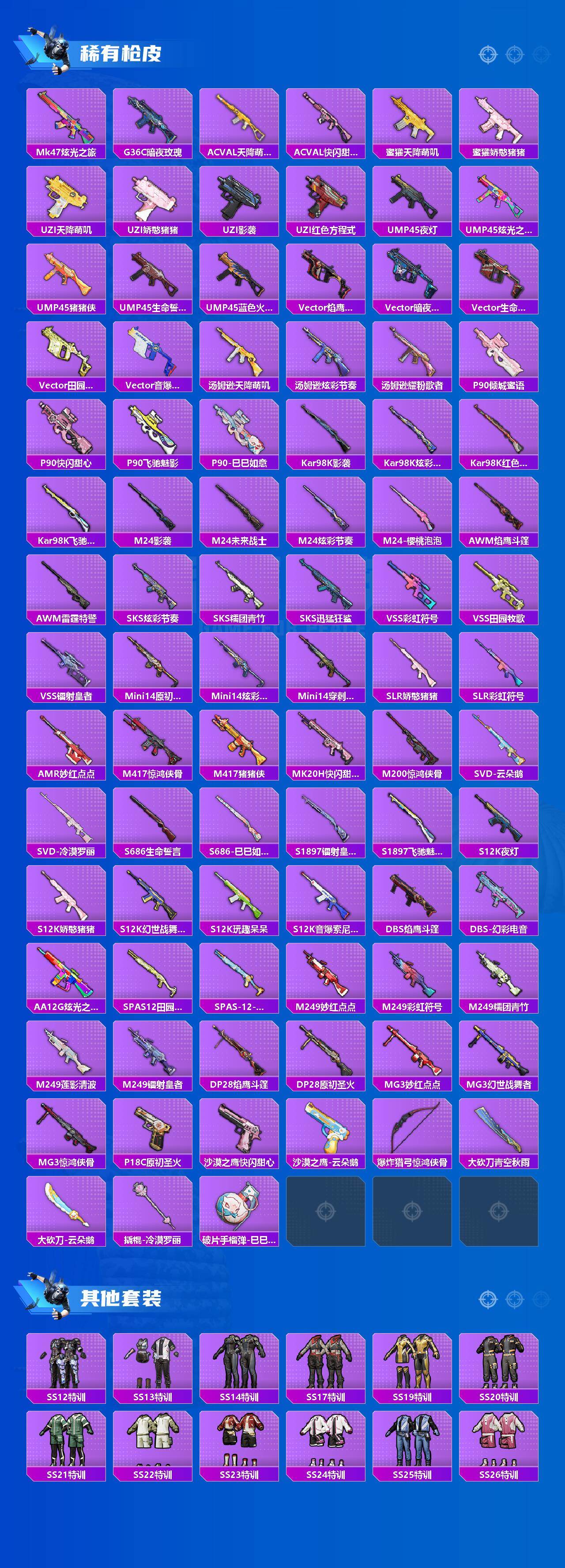 【粉色枪皮等级】:AKM-炫紫旋律(六级),SCAR-L-锦绣绵绵(五级),M416-五爪金龙(六级),GROZA-镜光银凌(五级),P90-冷漠罗丽(四级),Kar98K-创世·救赎(一级),