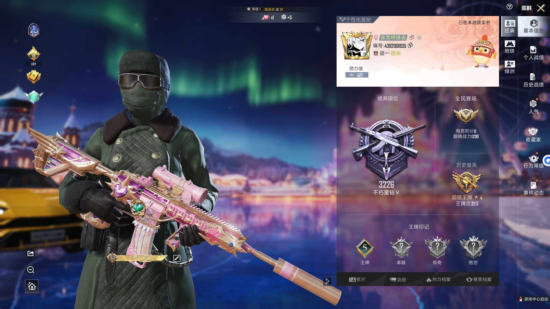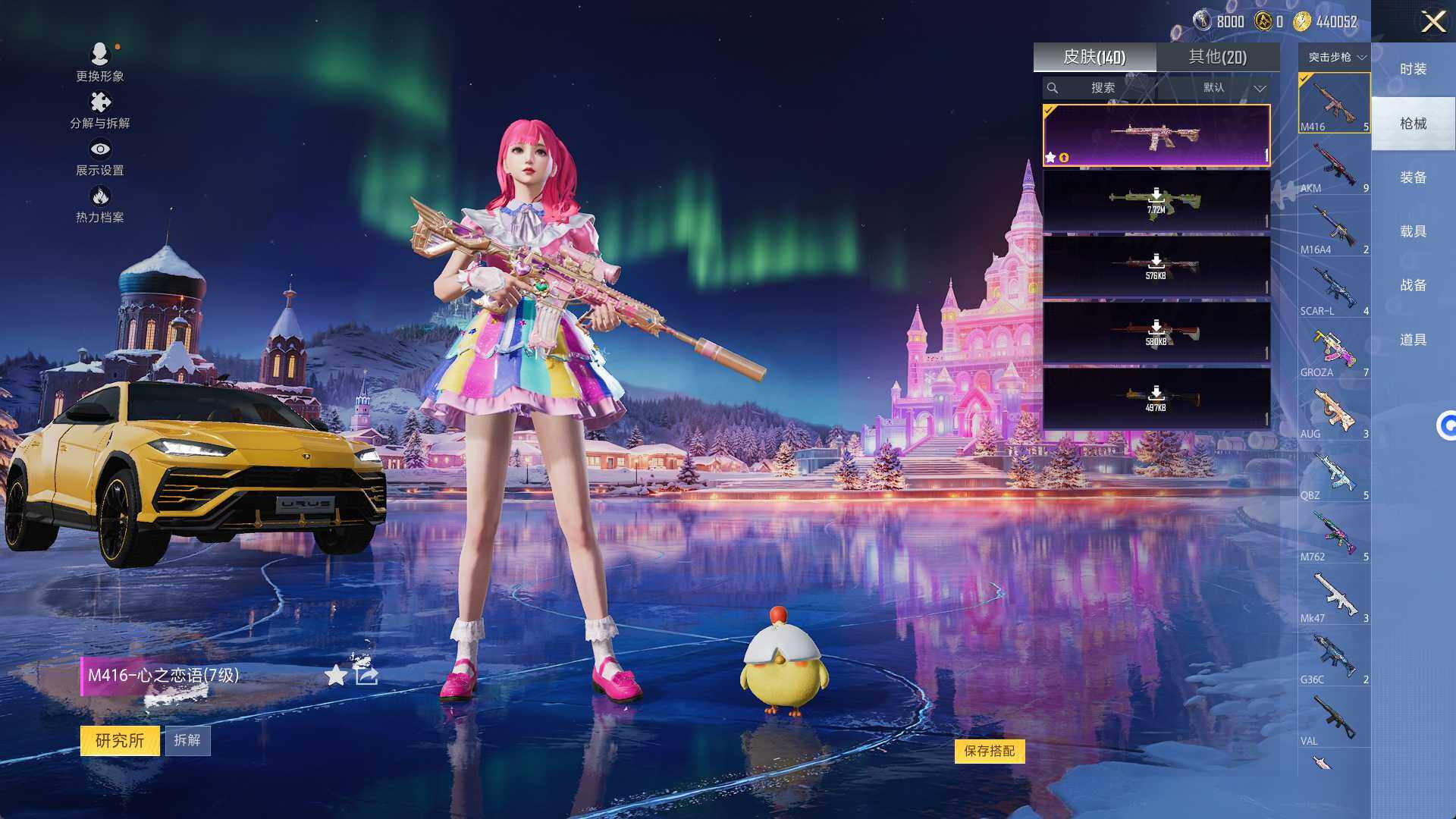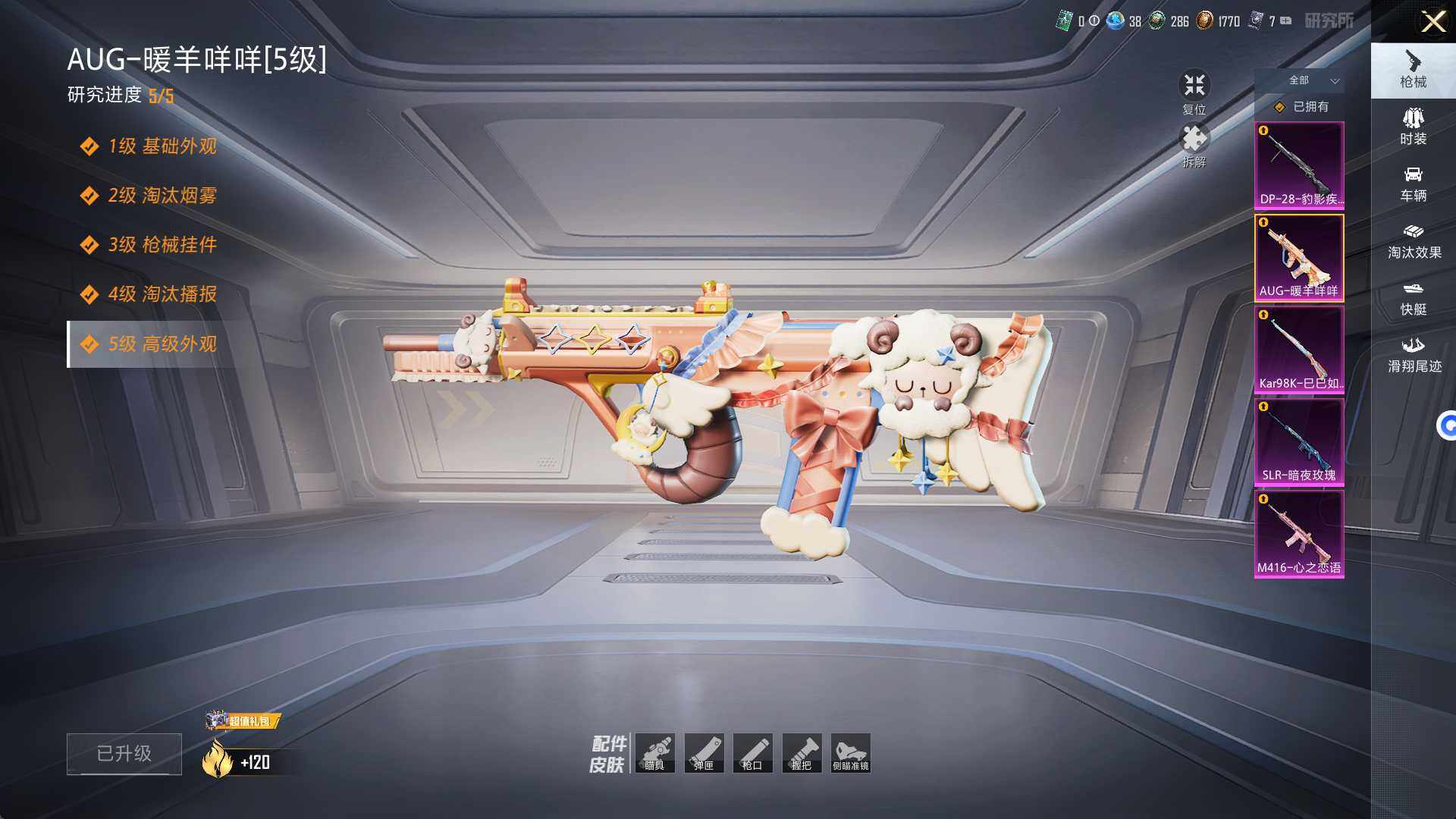 【粉色枪皮等级】:M416-心之恋语(七级),AUG-暖羊咩咩(五级),Kar98K-巳巳如意(二级),SLR-暗夜玫瑰(四级),DP-28-豹影疾电(三级)