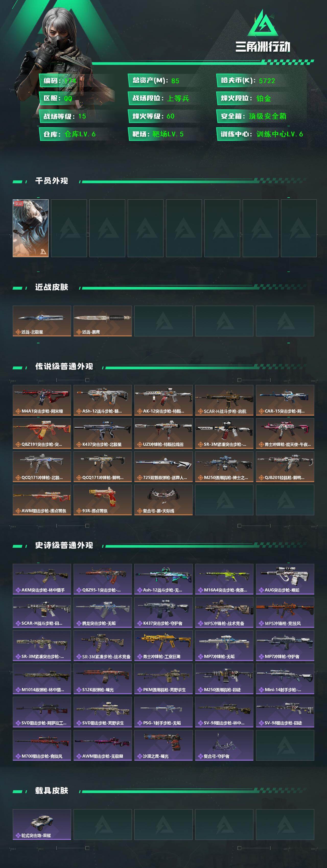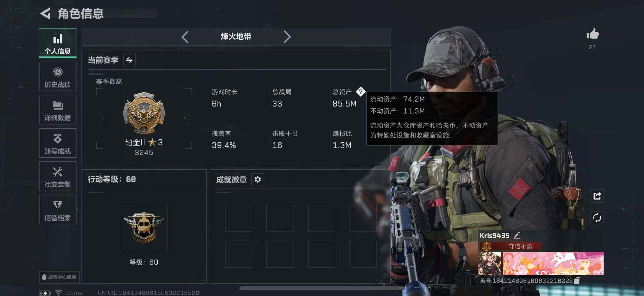 85m总资产-5722k哈伏币-60烽火等级-铂金-15战场等级-上等兵