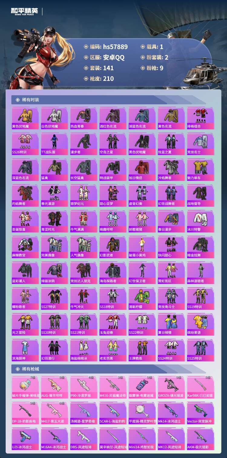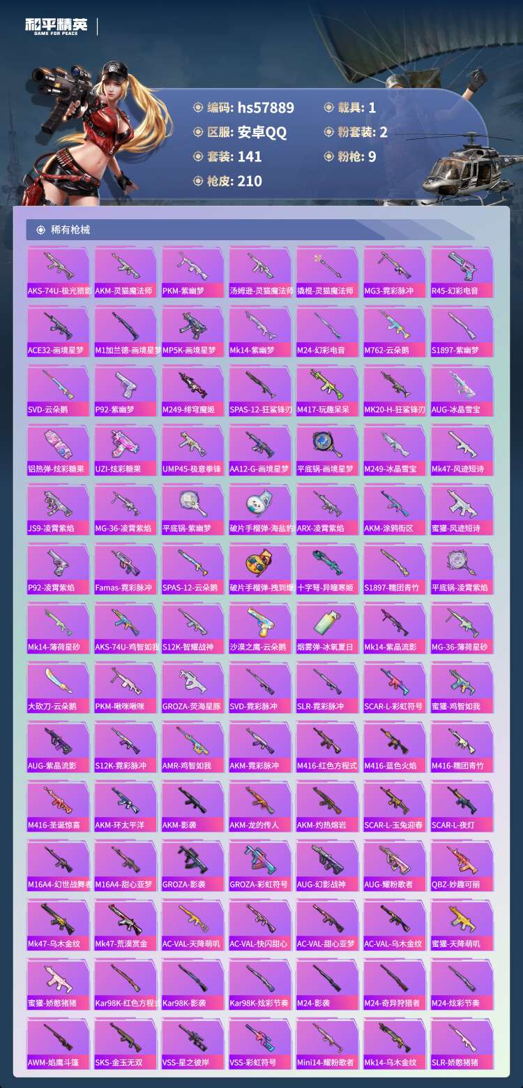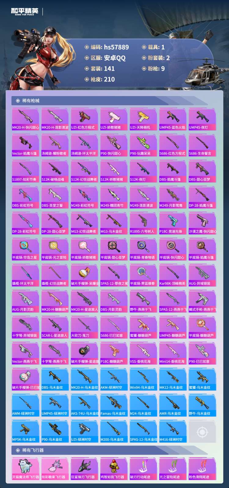 hs57889 安卓手Q-15王牌印记-2粉装-9特效枪-1载具-57940热力值-141套装-21