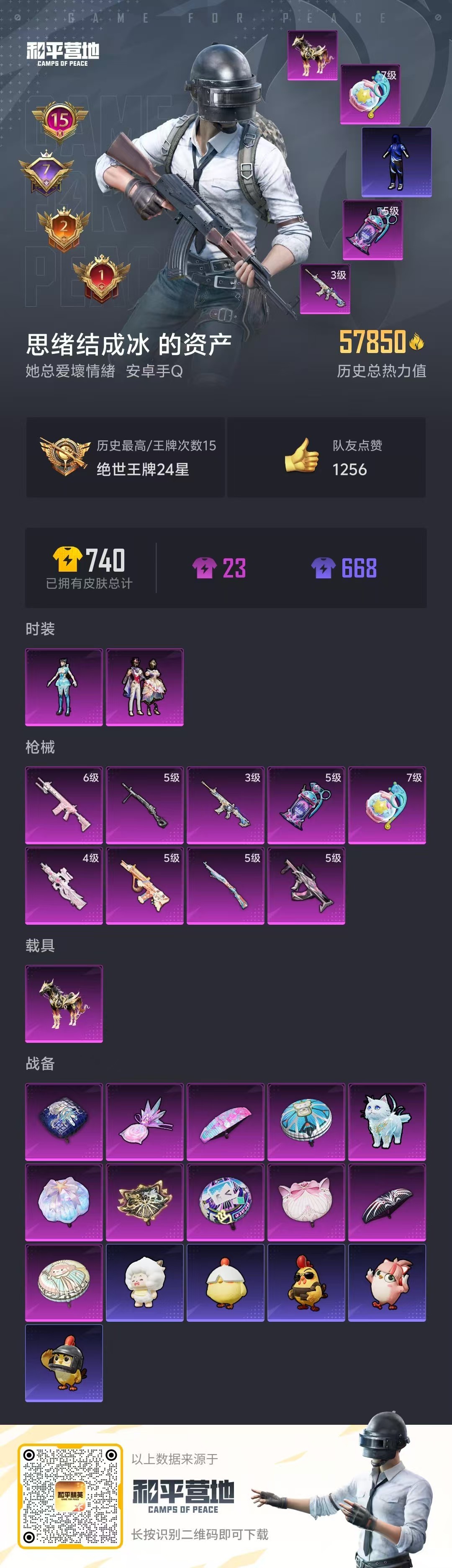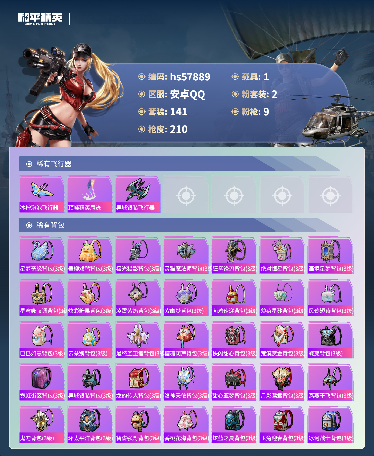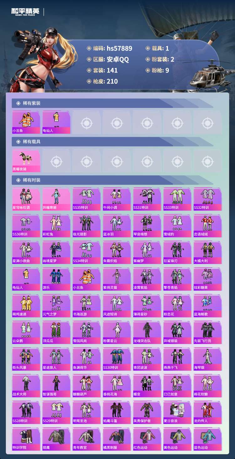 hs57889 安卓手Q-15王牌印记-2粉装-9特效枪-1载具-57940热力值-141套装-21