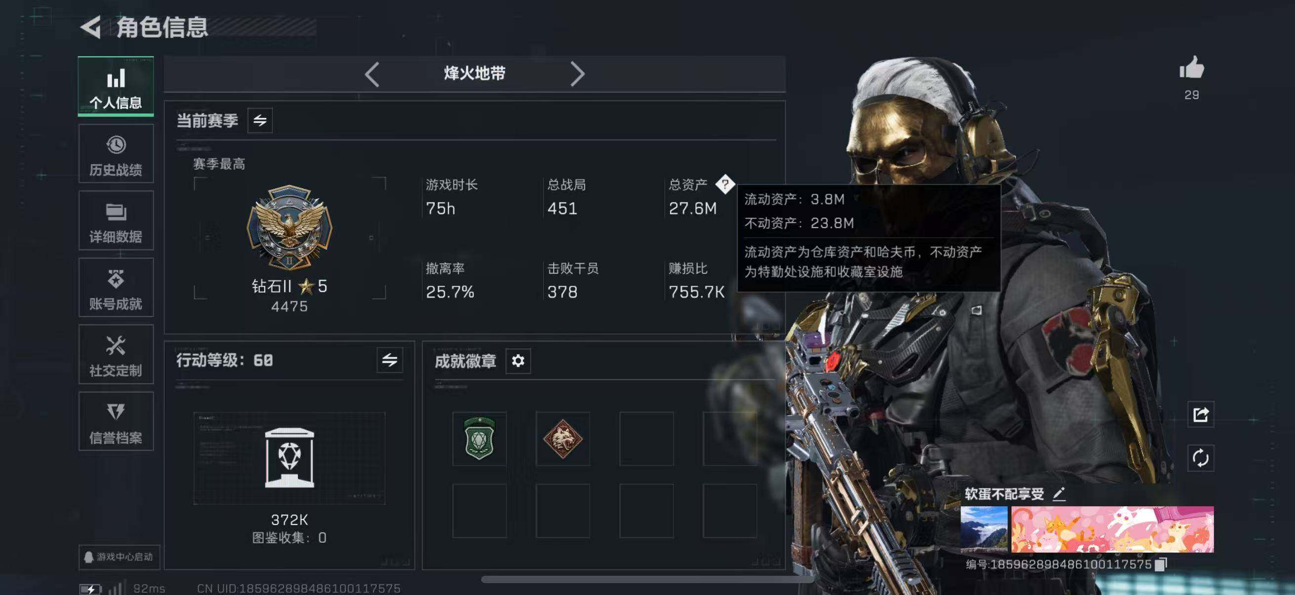 27m总资产-502k哈伏币-60烽火等级-钻石-40战场等级-上等兵 SM