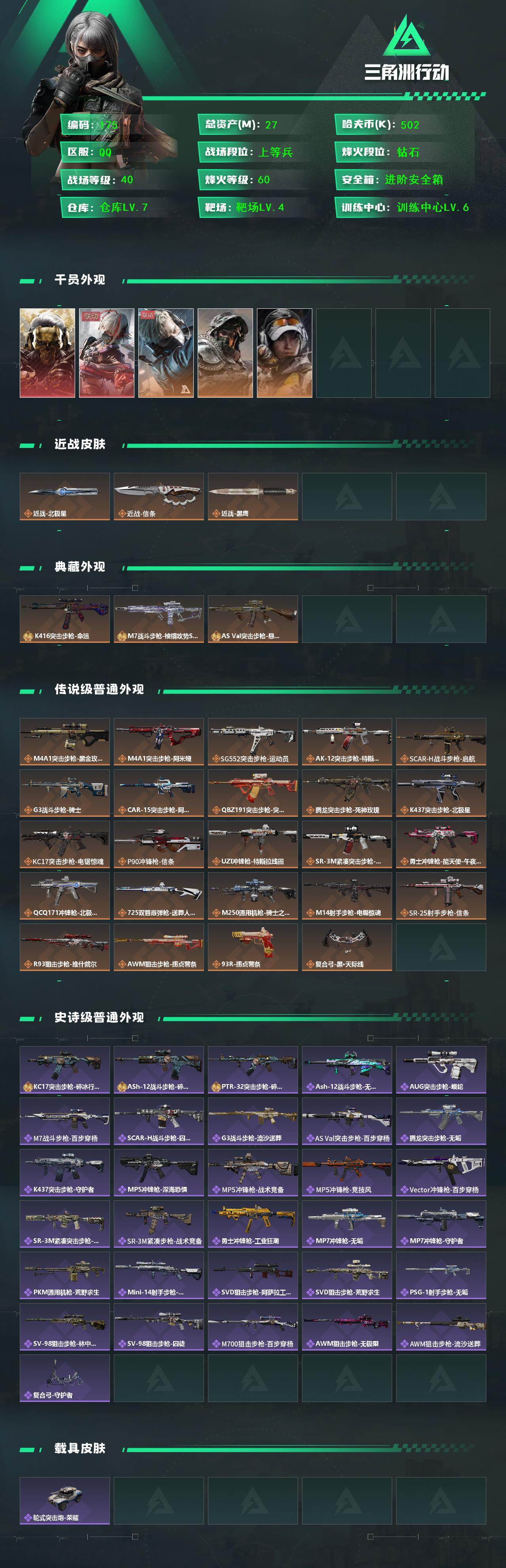 27m总资产-502k哈伏币-60烽火等级-钻石-40战场等级-上等兵 SM9019