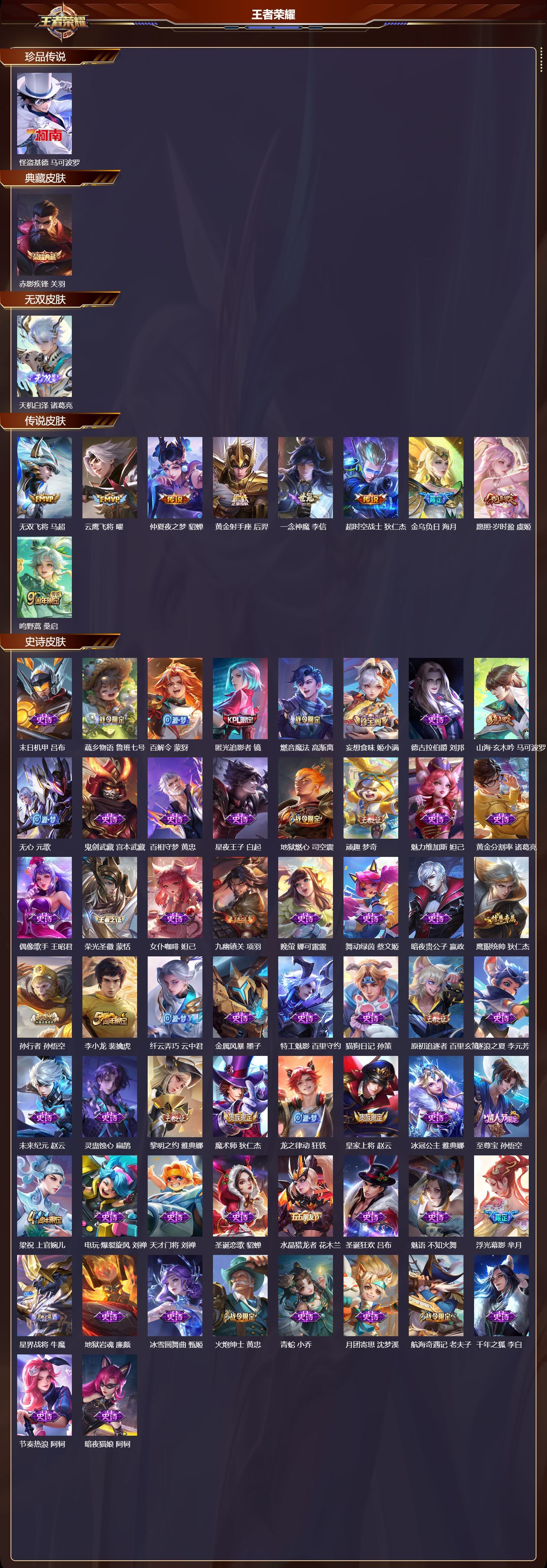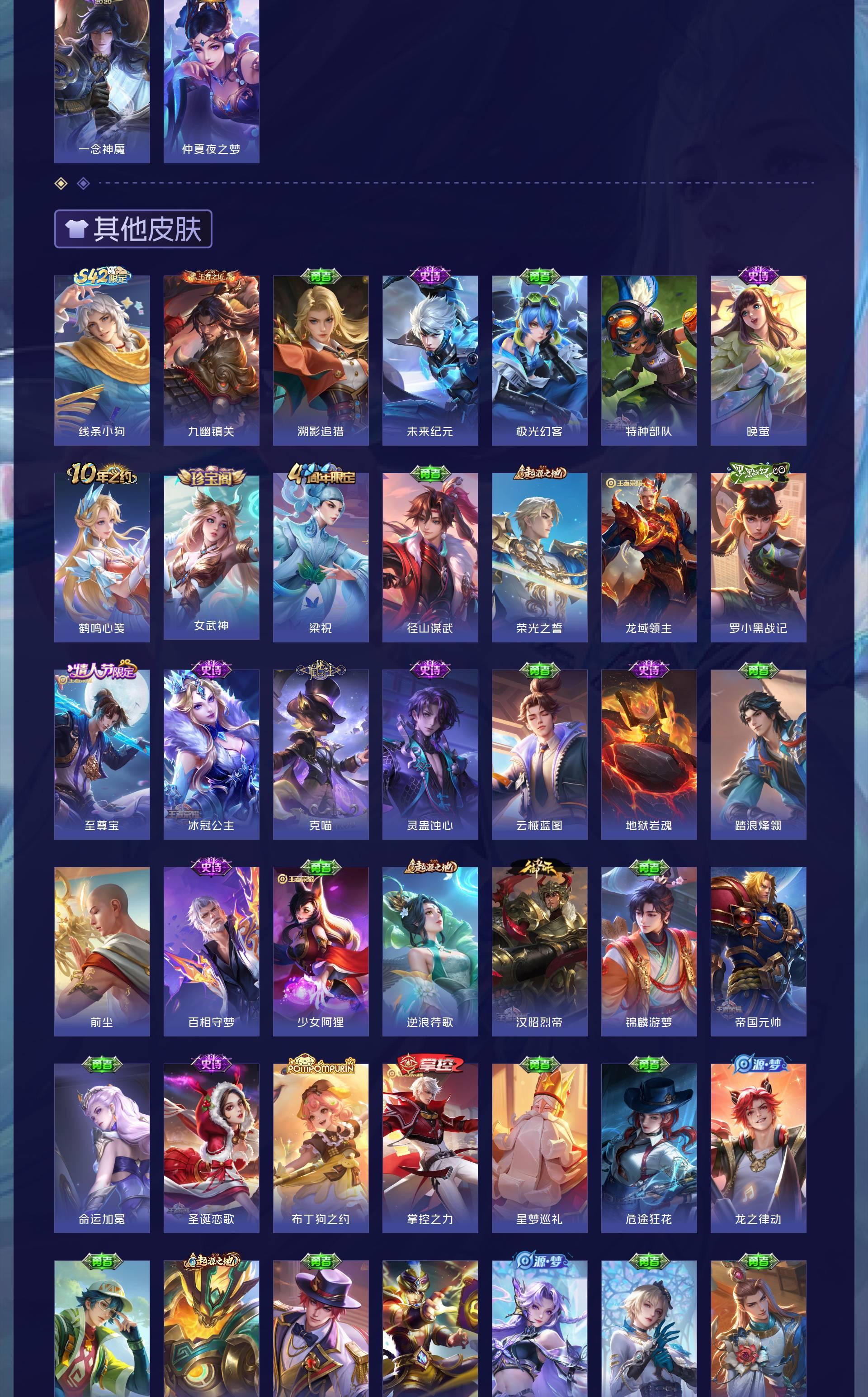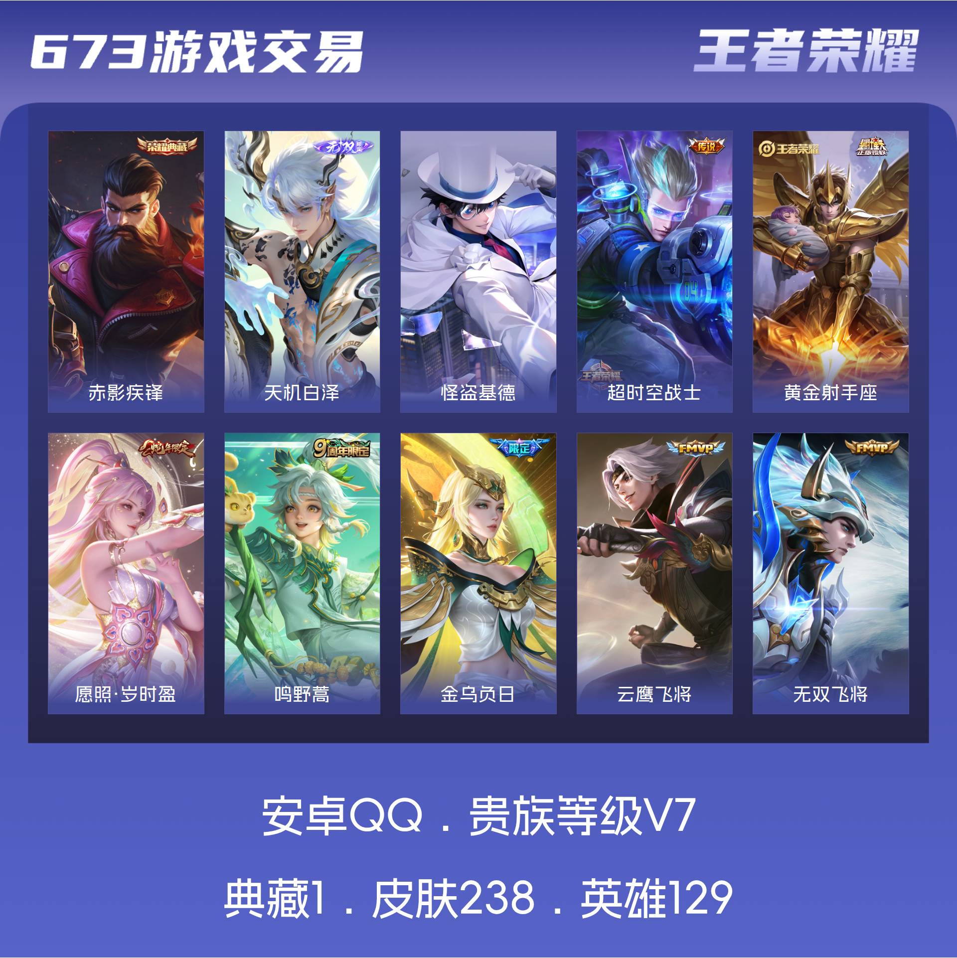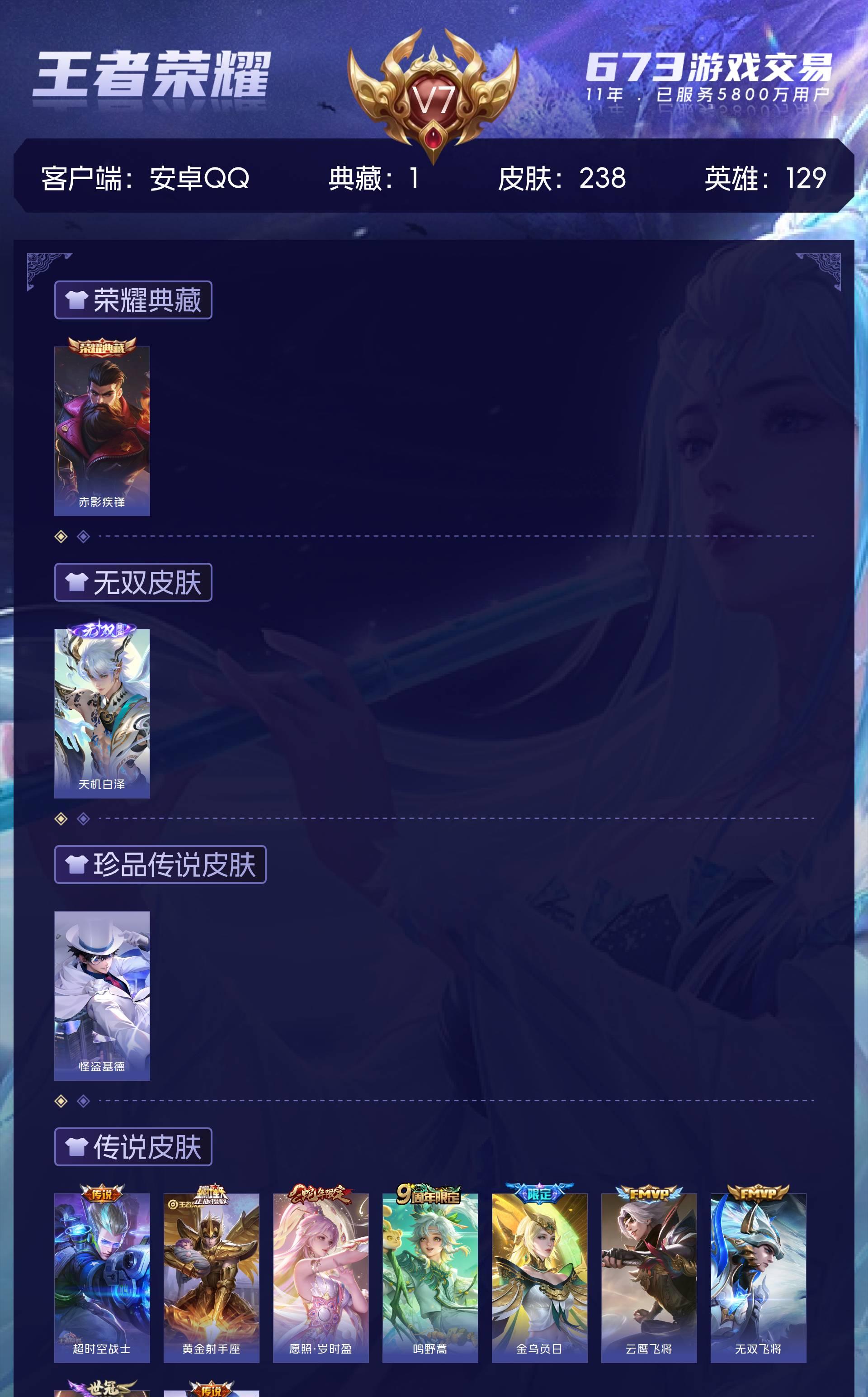 V7 皮肤238 英雄129 至尊星耀 荣耀典藏1 无双皮肤1 珍品传说1 传说9 其他皮肤231
