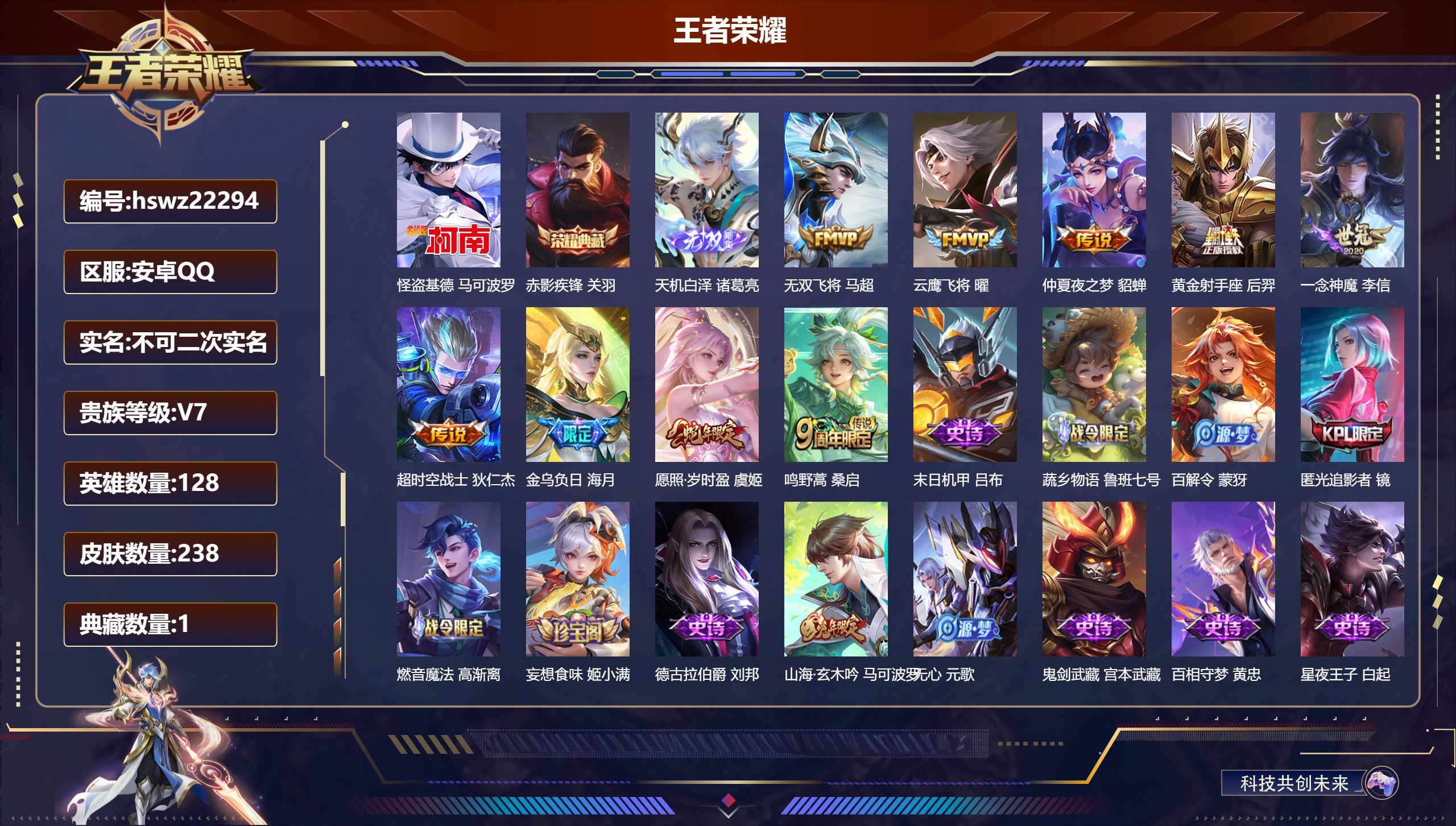 安卓QQ/至尊星耀/238皮肤/128英雄/1典藏/0珍品无双/1无双/1珍品传说/9传说/71史诗